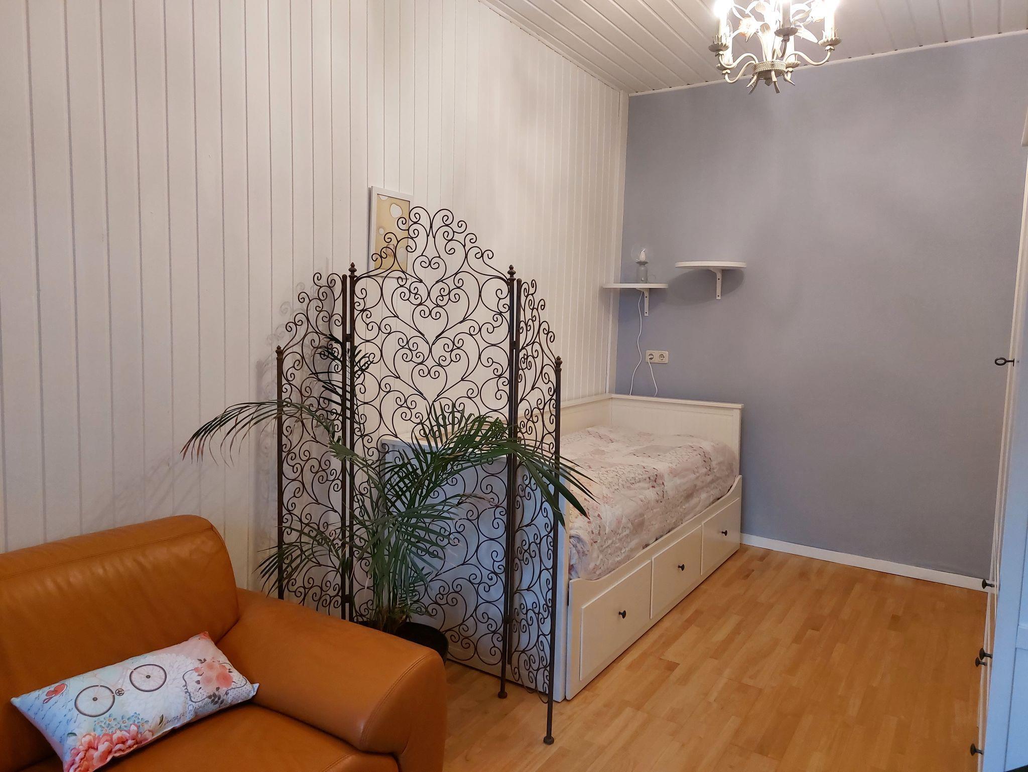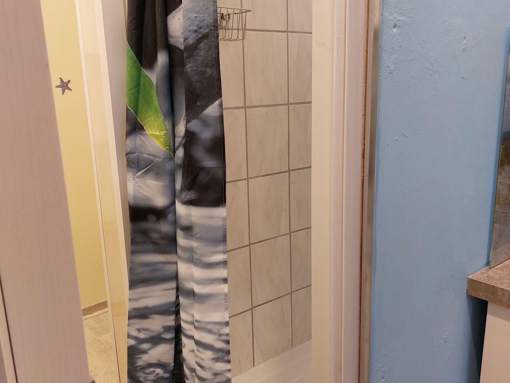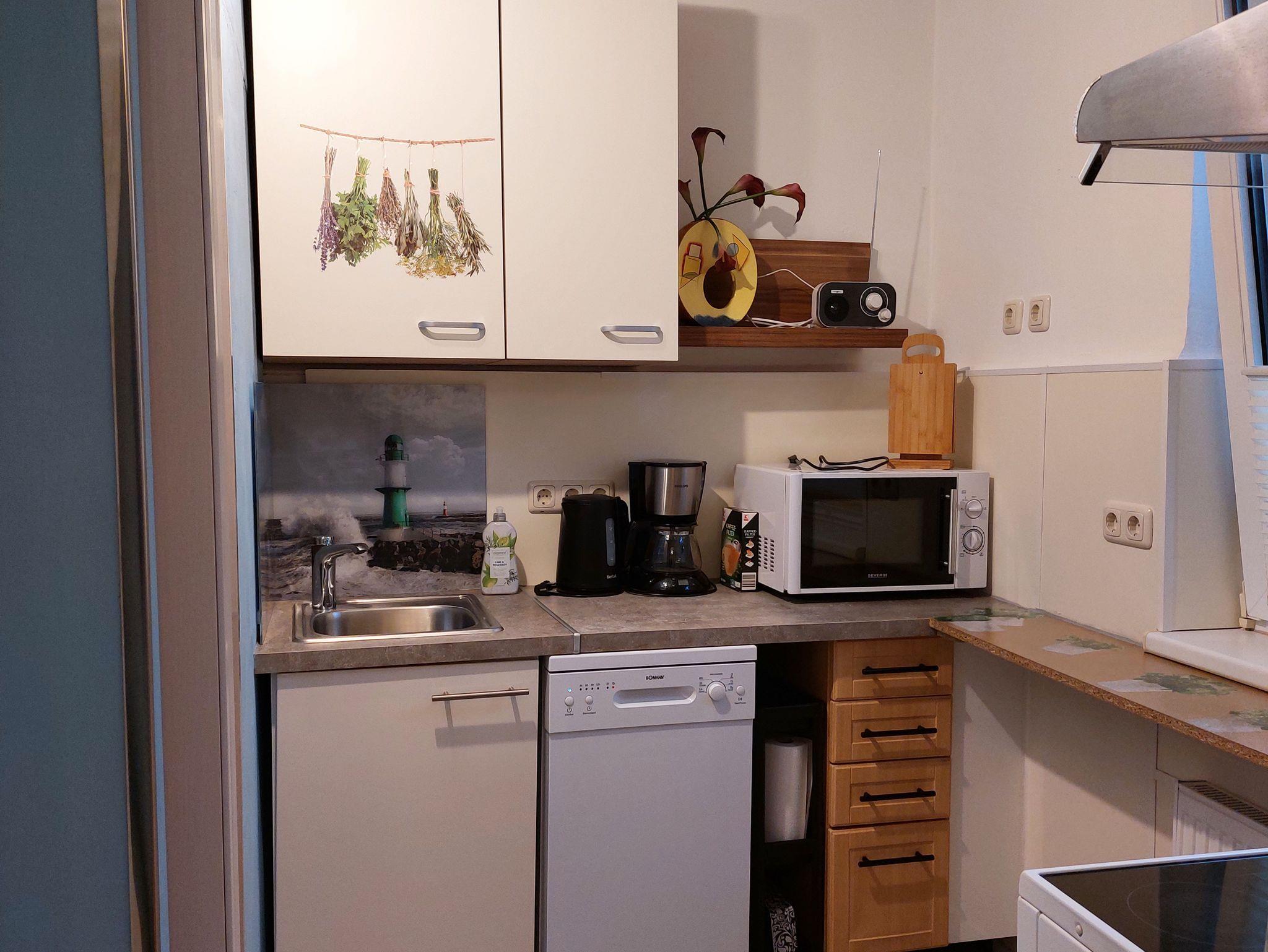 Ferienwohnung mit Wohn/Schlafraum, Küche mit Geschirrspüler und Mikrowelle, Dusche und WC. Es gibt ein zweites WC zur Nutzung.