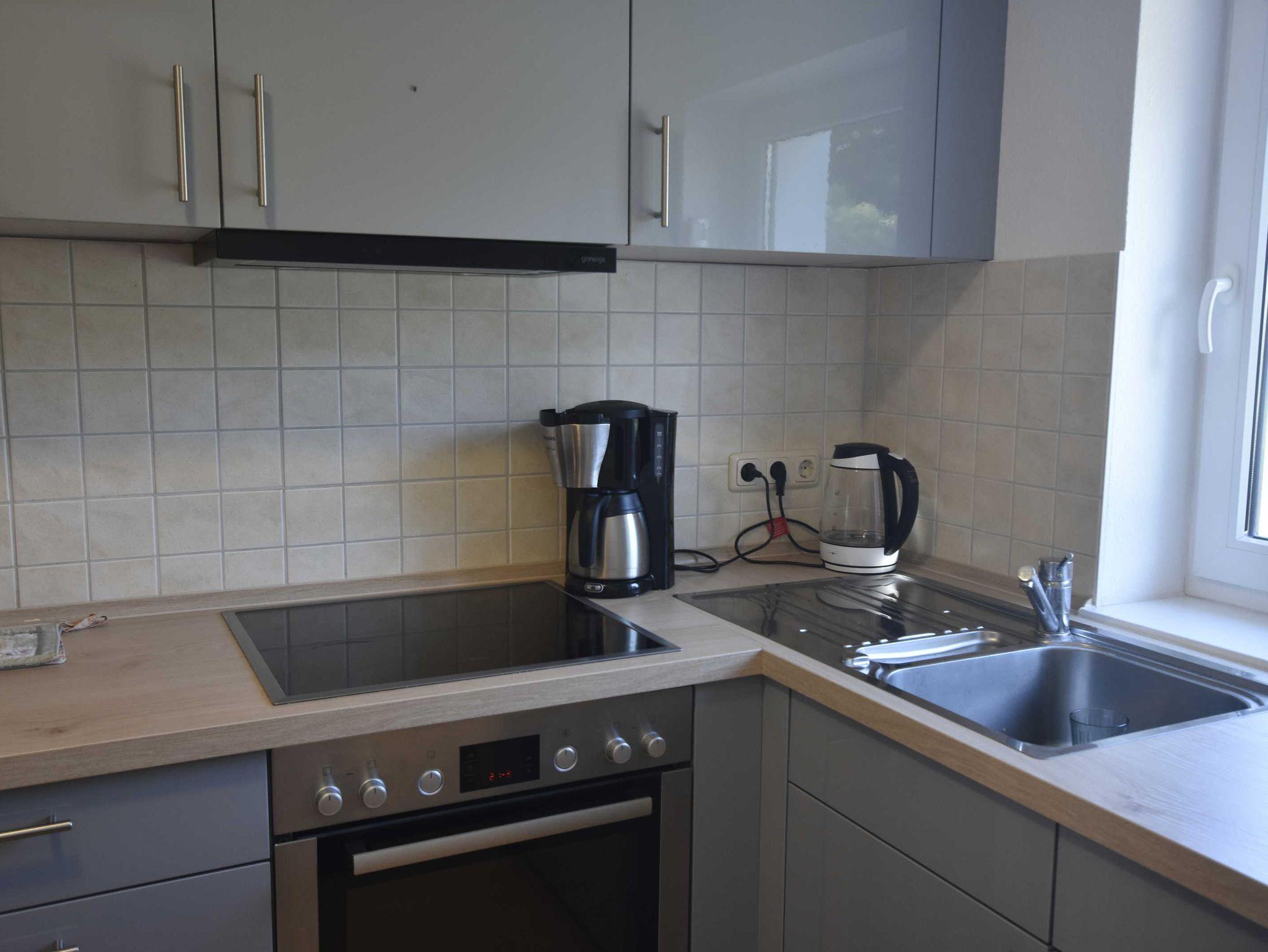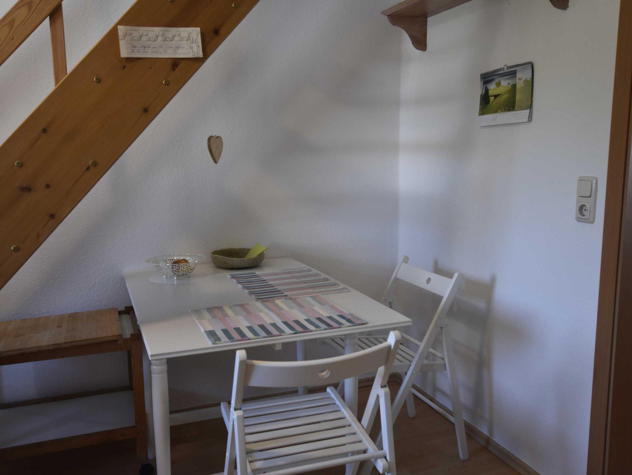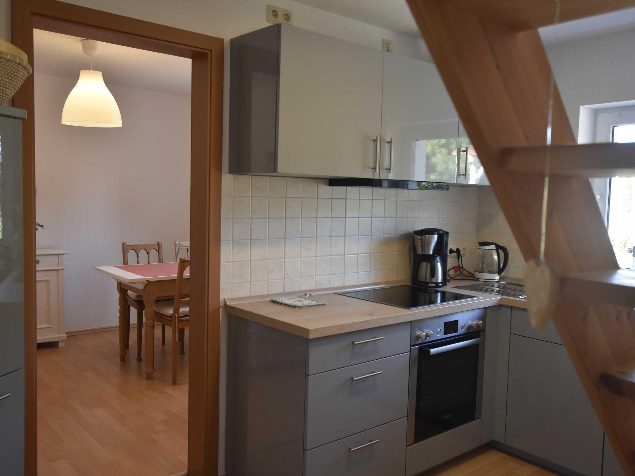 Liebevoll eingerichtete Ferienwohnung auf dem Land. In der modernen Küche gibt es Kaffeemachine, Wasserkocher, Kühlschrank mit großem Gefrierfach sowie eine kleine Sitzecke. Das stilvolle Eßzimmer ist mit Recamière sowie Tisch und Stühle ausgestattet. Das Wohnzimmer im Obergeschoß ist mit Sofa, Sessel, Couchtisch und Schreibmöglichkeit ausgestattet. Von der Terrasse hinter dem Haus haben Sie einen Blick in den Garten, der ebenfalls zu Ihrer Verfügung steht.