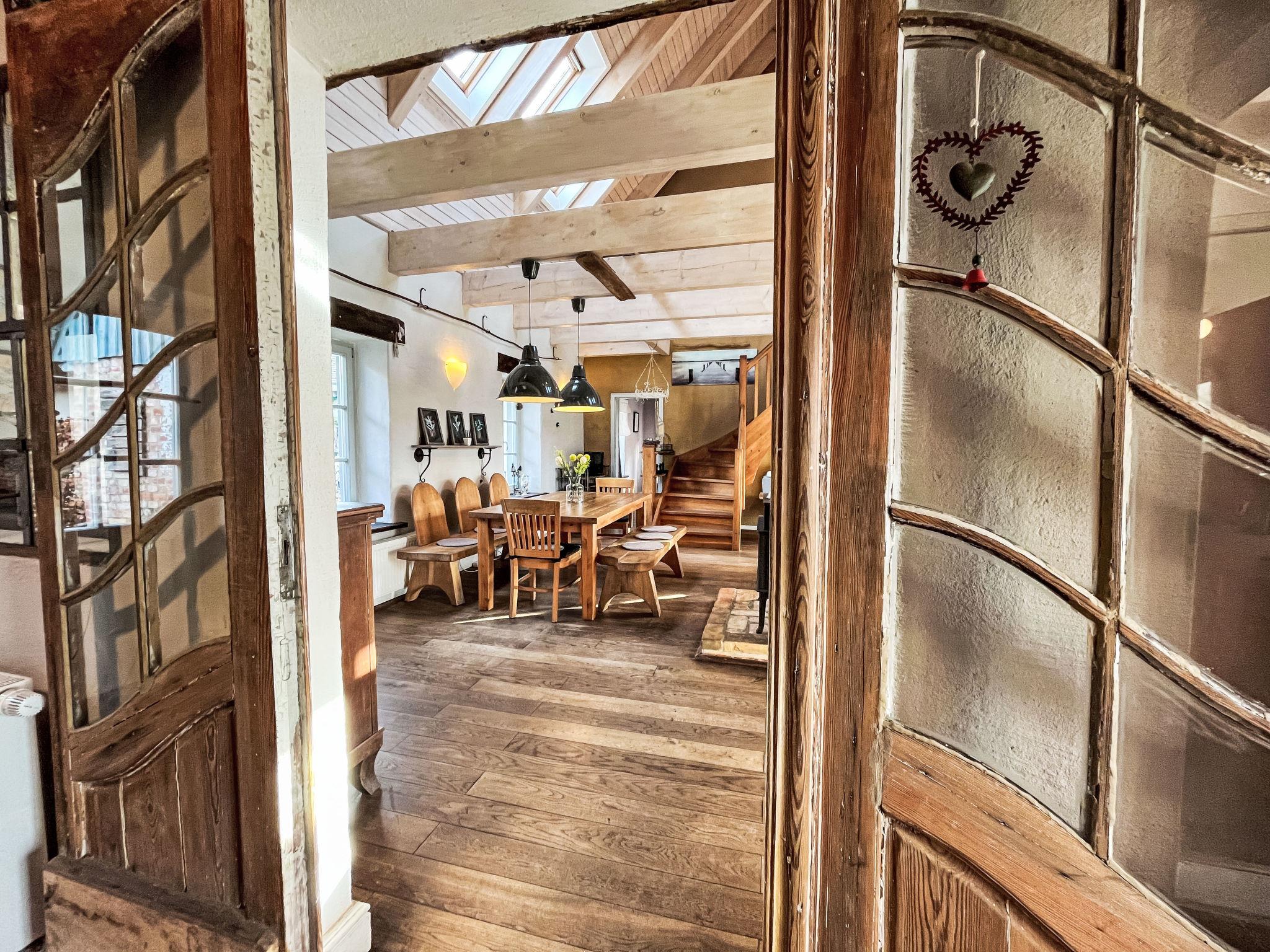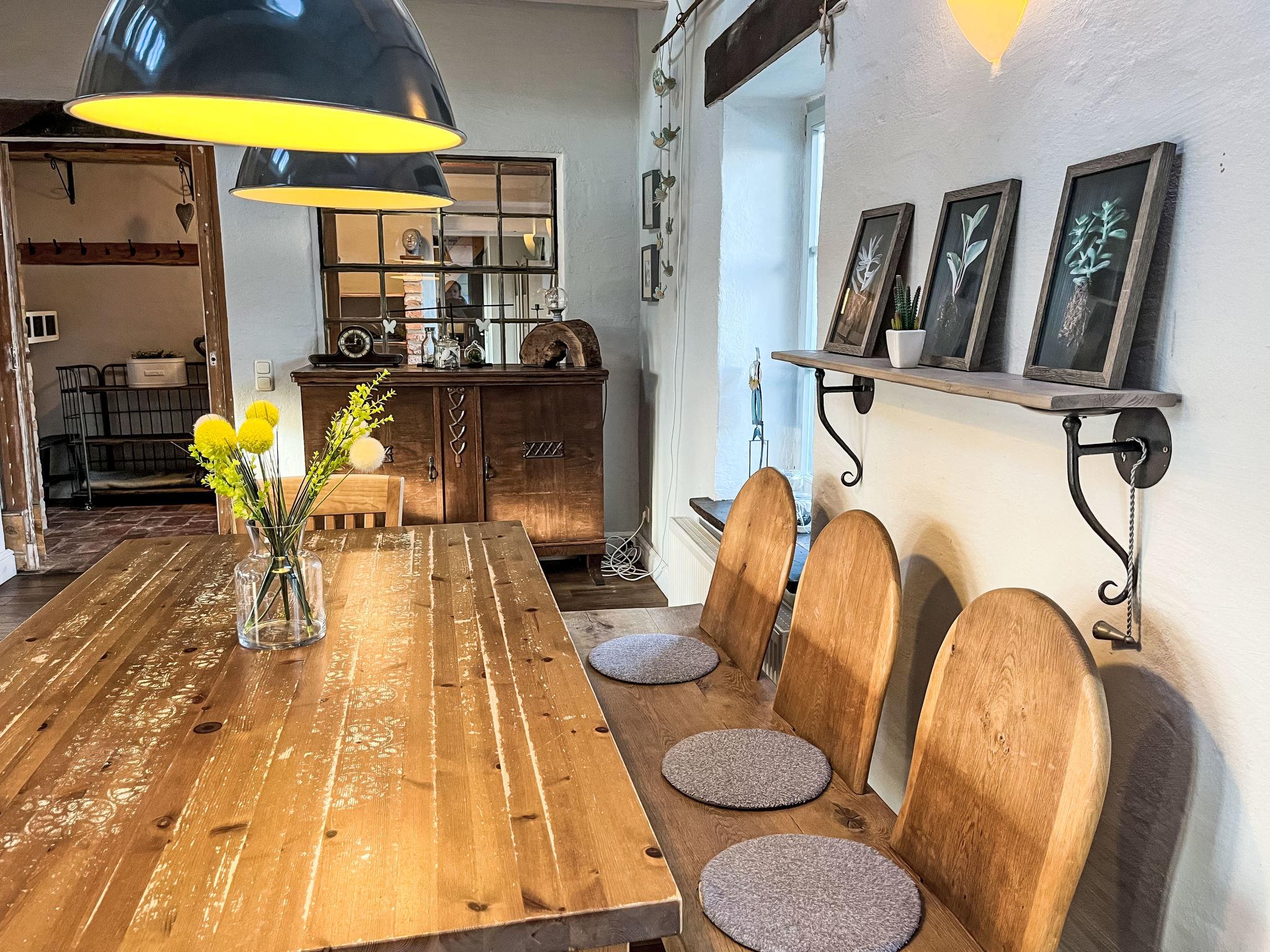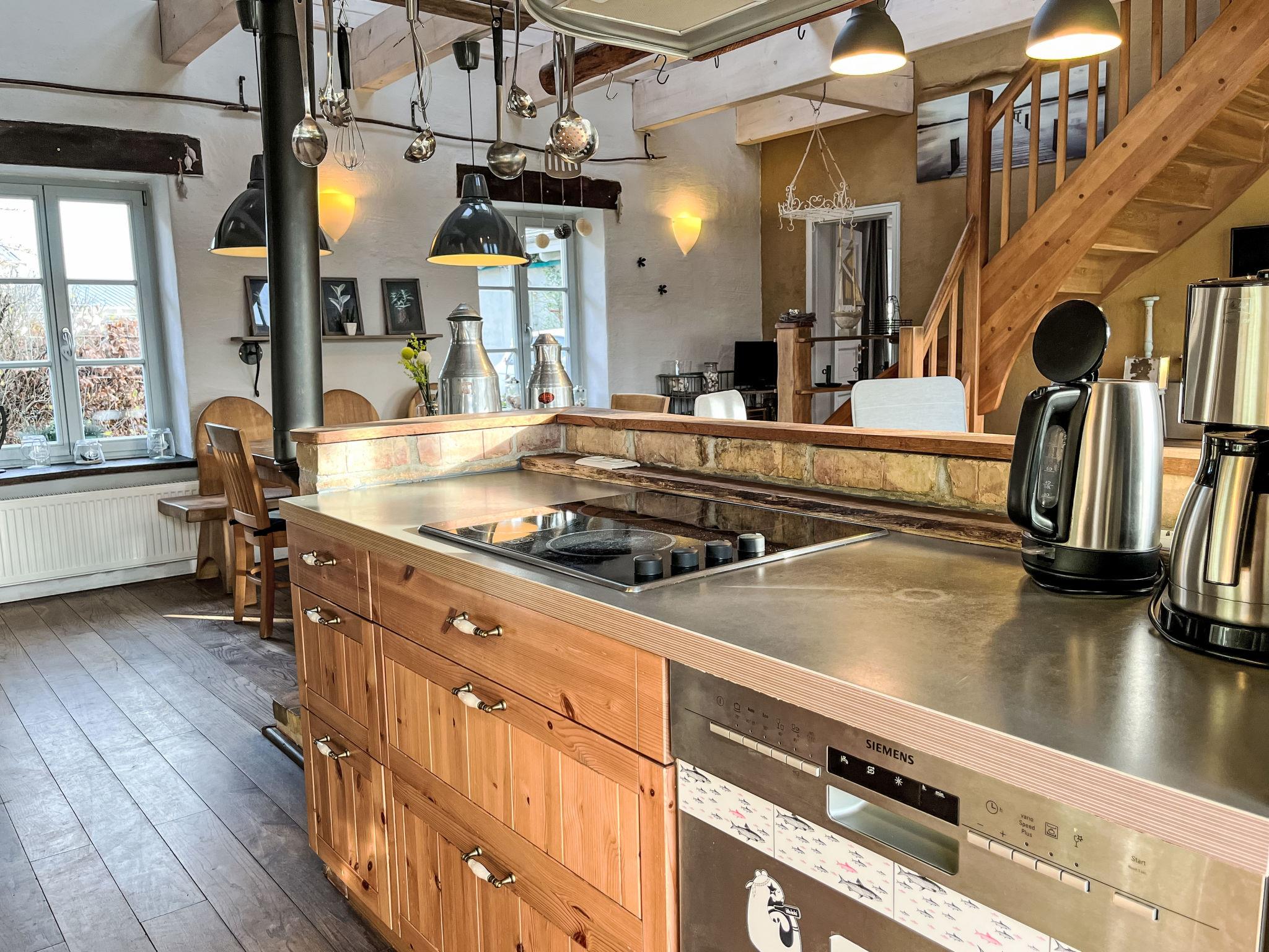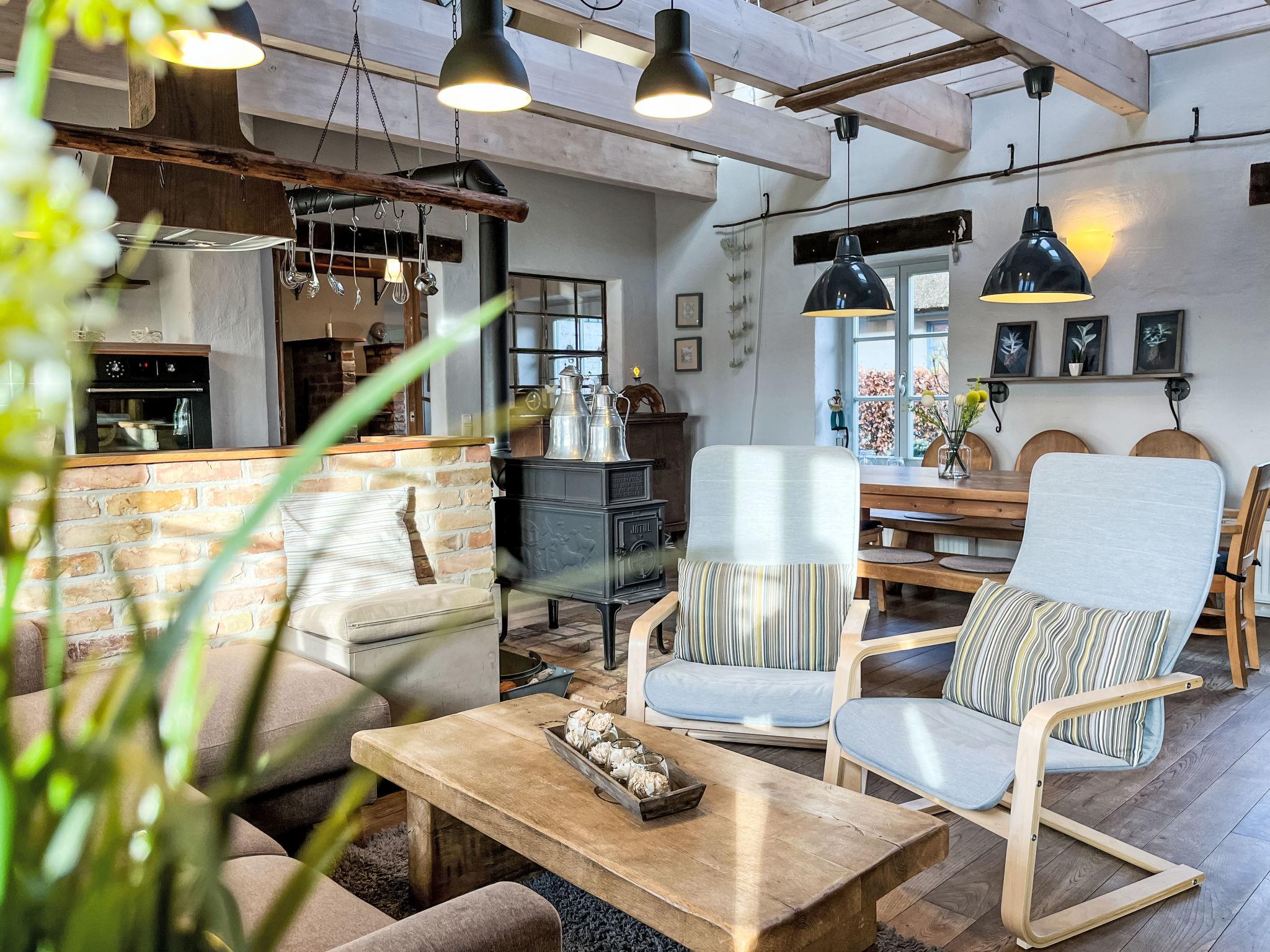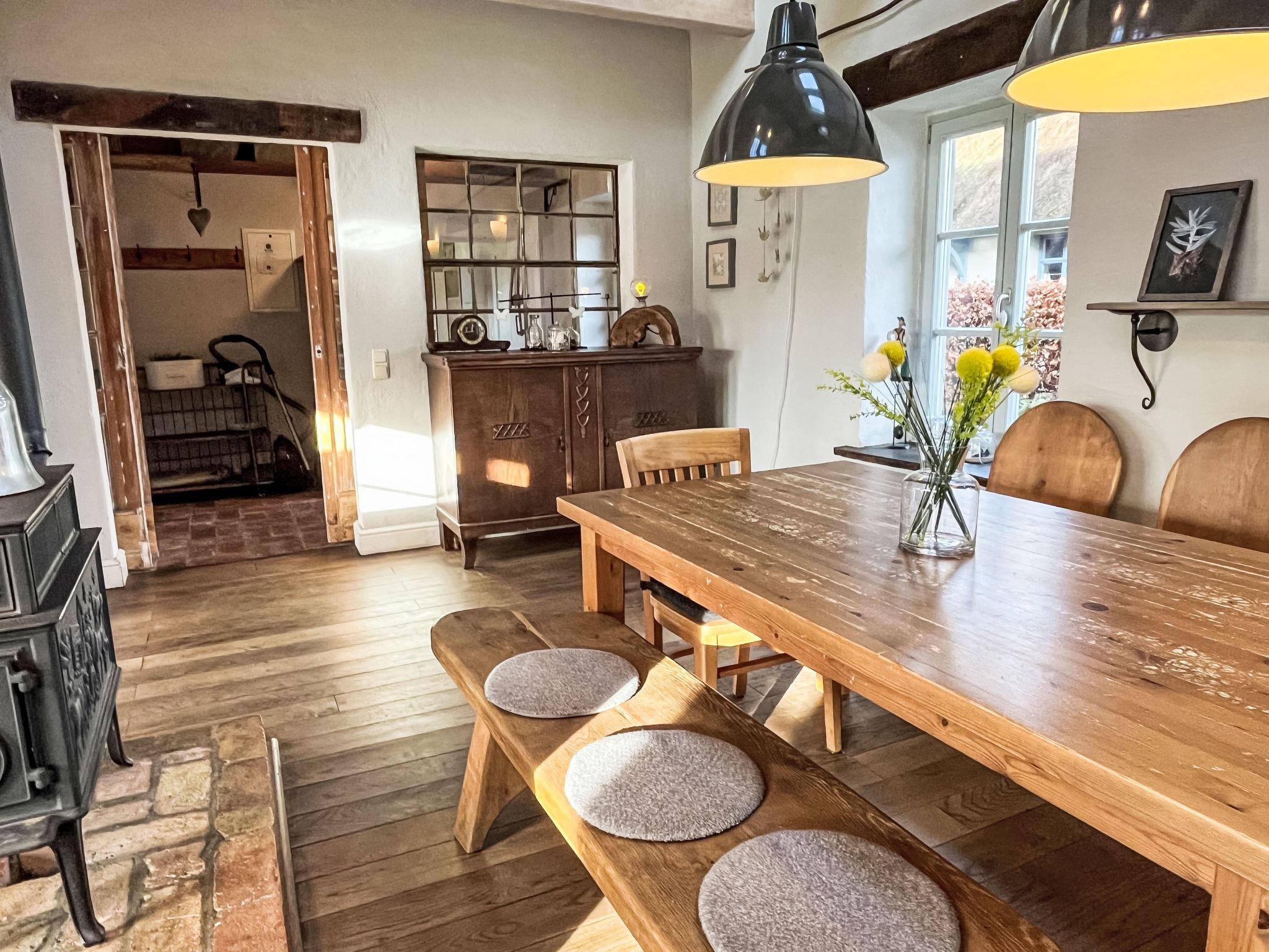 "Ferienscheune", 5-Zimmer-Landhaus 160 m2 auf 2 Stockwerken. Objekt geeignet für 8 Erwachsene. Komfortabel und gemütlich eingerichtet: Wohn-/Esszimmer mit Schwedenofen, Esstisch und Kabel-TV (Flachbildschirm), Radio und CD. Ausgang zum Garten, zur Terrasse. 1 Zimmer mit 1 Doppelbett (160 cm, Länge 200 cm). 1 Zimmer mit 2 Betten (90 cm, Länge 200 cm). Offene Küche (Backofen, Geschirrspüler, 4 Glaskeramikplatten, Toaster, Wasserkocher, elektrische Kaffeemaschine). Dusche/WC. Obergeschoss: 1 Zimmer mit 1 Doppeldiwanbett (160 cm, Länge 200 cm). 1 Zimmer mit 1 Doppelbett (160 cm, Länge 200 cm). Bad/Dusche/WC. Komfortable Einrichtung im Landhausstil. Terrasse. Terrassenmöbel. Schöne Sicht auf den Garten. Zur Verfügung: Kinderhochstuhl, Babybett, Haartrockner. Internet (WLAN, gratis). Parkplatz (2 Autos). Bitte beachten: geeignet für Familien. Nichtraucher-Unterkunft. Maximal 1 Haustier/Hund erlaubt.