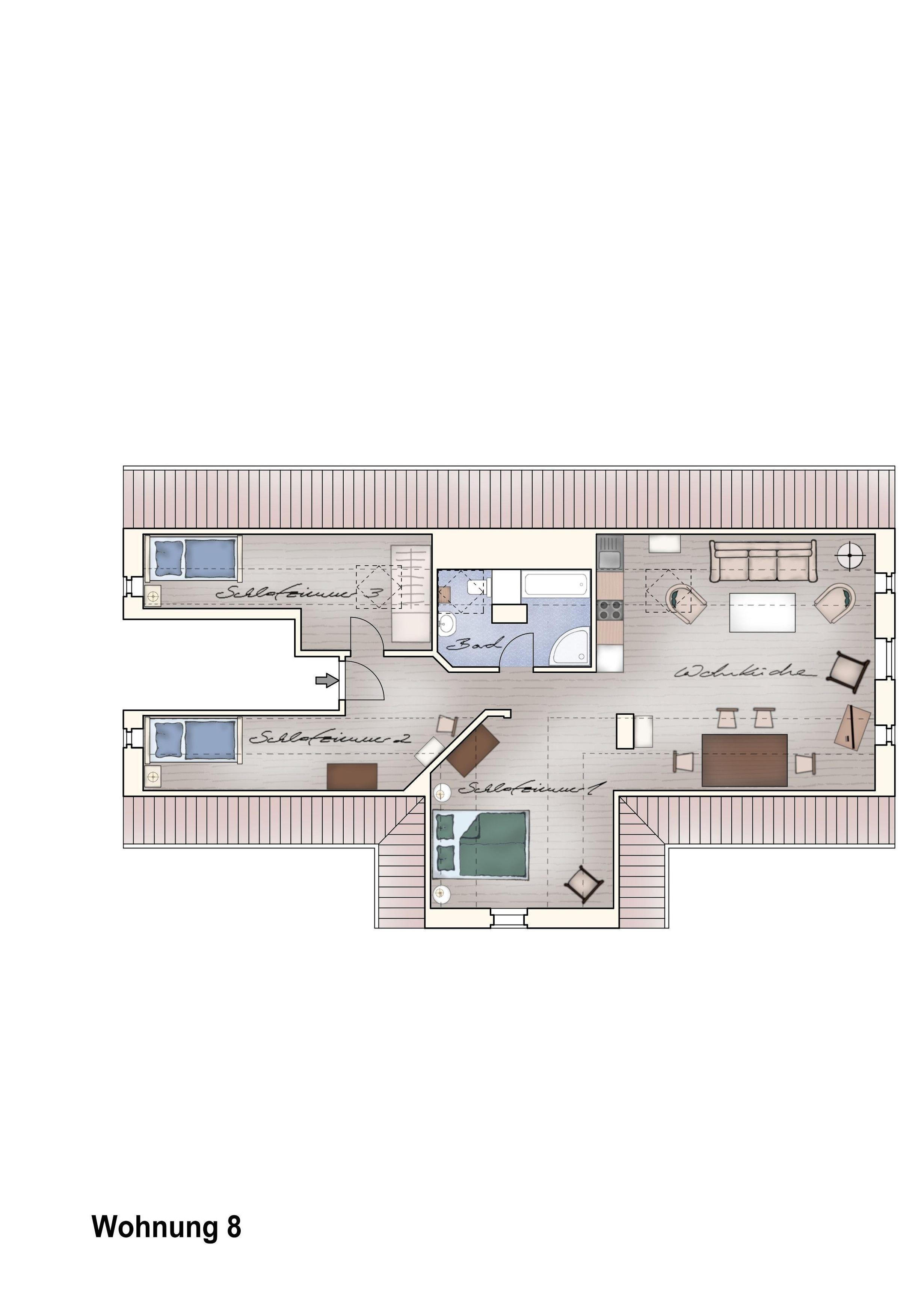 Die Ferienwohnung Nr. 8 des Gut Grubnow befindet sich im äußerst gemütlichen Dachgeschoss des Gutshauses. Die Wohnung für bis zu vier Personen und in einer Größe von 78 m² ist mit Liebe zum Detail eingerichtet und besteht aus drei Zimmern: Ein großes Wohnzimmer mit offener Küche (Siemens-Geräte) und schönem Blick auf den Garten und das Wasser, ein Schlafzimmer mit zwei Einzelbetten und ein Schlafzimmer mit einem Doppelbett (offene Raumgestaltung, ohne Tür) und ein Badezimmer mit separater Badewanne und Dusche.