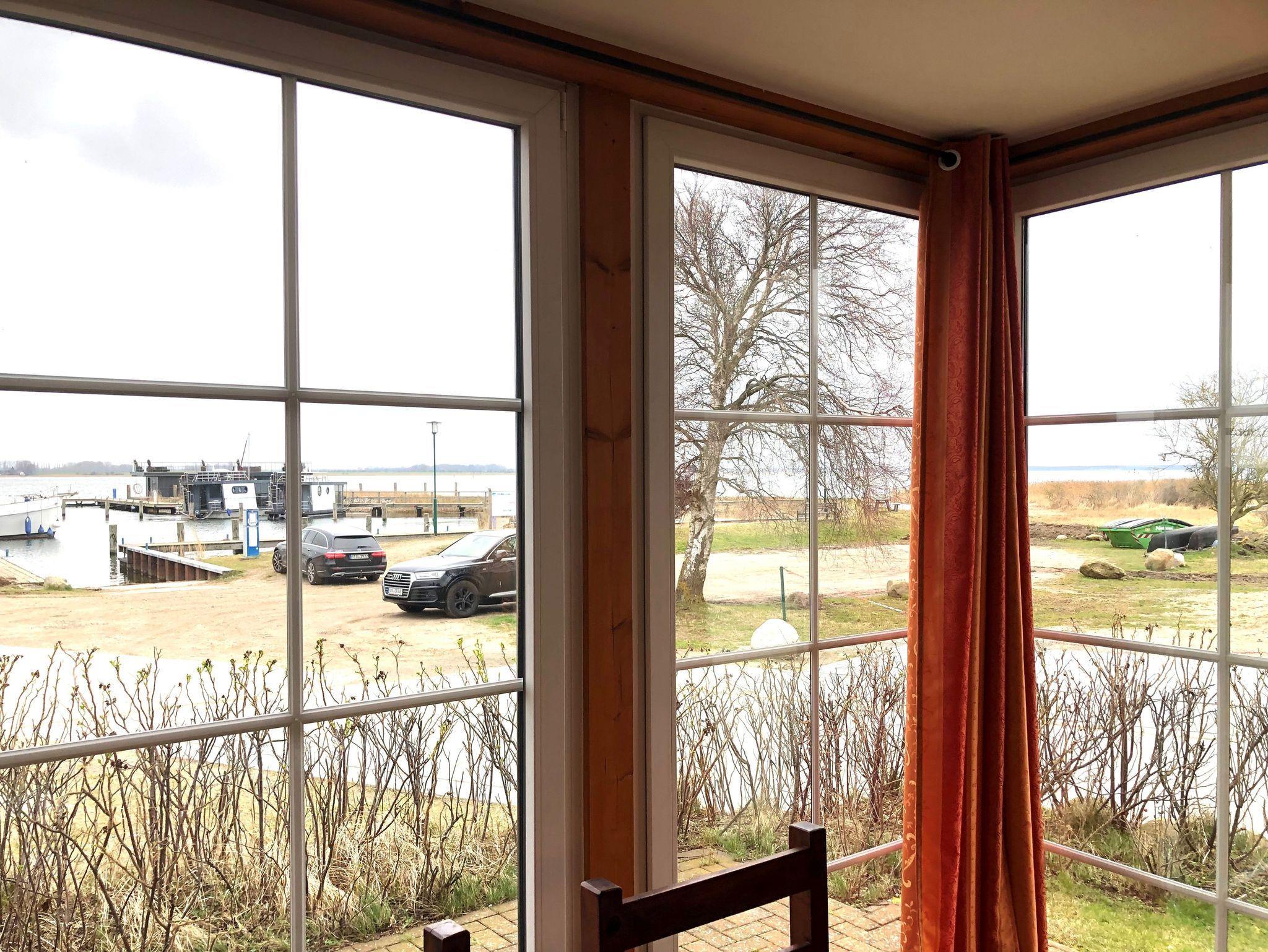 Gemütliches Ferienhaus Seeschwalbe in 1. Reihe am Yachthafen Vieregge mit Blick auf Boddenlandschaft und Hafen.