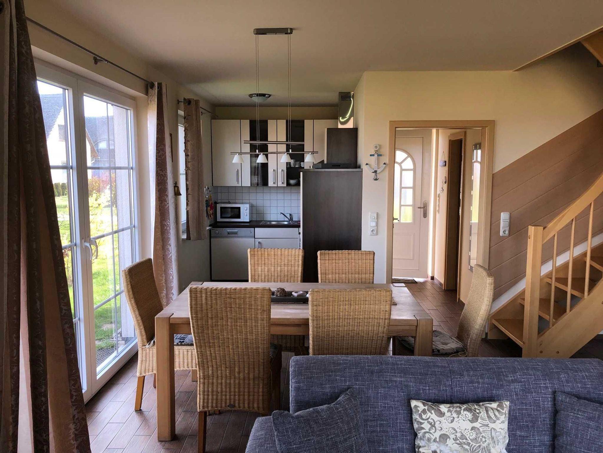 Das Haus Kranich - rechts - verfügt über einen kleinen Flur, einen Wohnbereich mit Kamin, offene Küche, Gäste WC im Erdgeschoss, 2 Schlafzimmer und Bad im Obergeschoss und ein 3. Schlafzimmer im offenem Spitzboden.