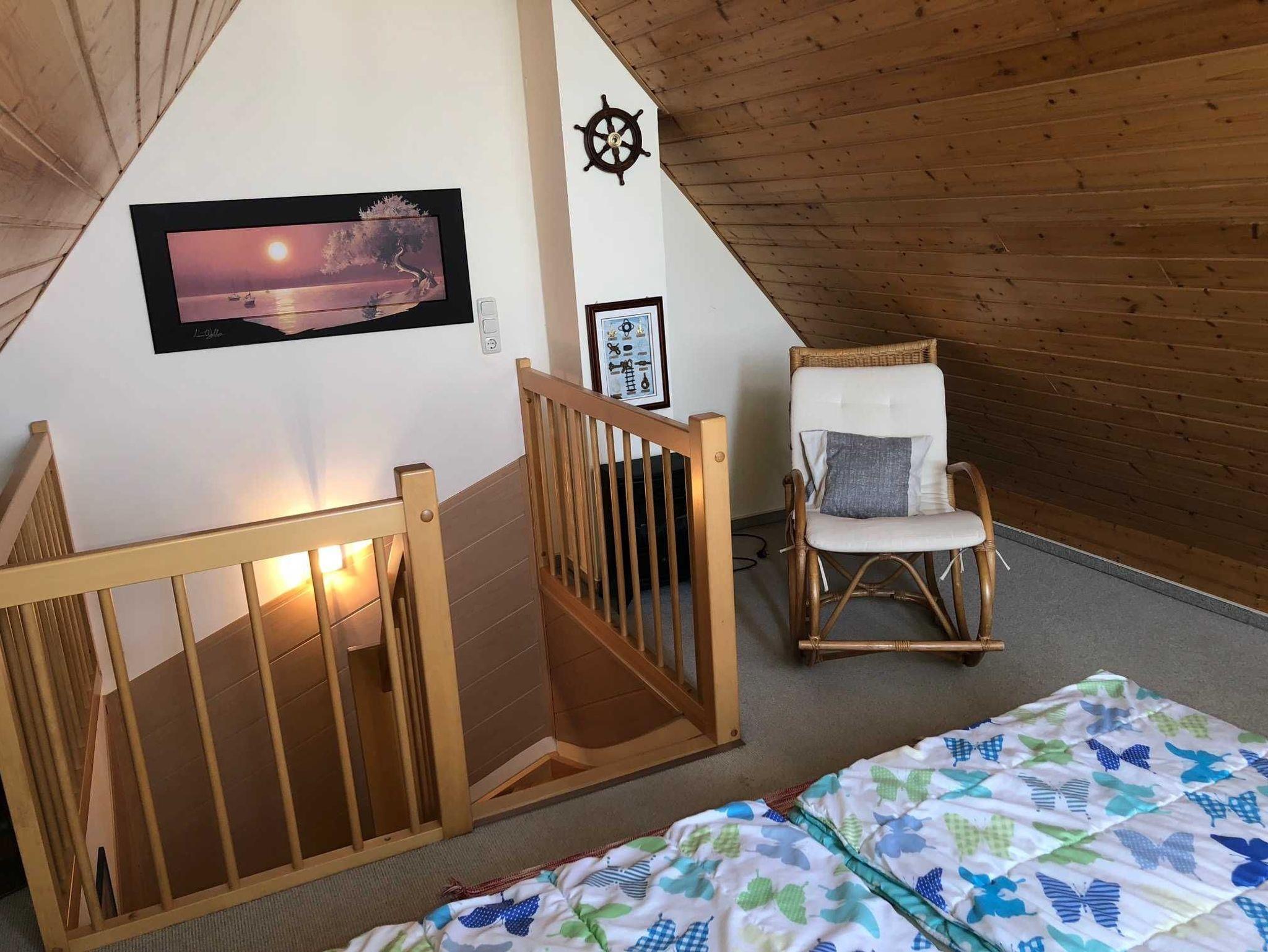 Das Haus Kranich - rechte Seite - mit 3 Schlafzimmern für bis zu 6 Personen verfügt im Erdgeschoss über einen Wohnbereich mit Kamin, offene Küche, kleinen Flur und ein Gäste WC. Im Obergeschoss befinden sich 2 Schlafzimmer und ein Bad mit Dusche, WC, Waschplatz und kleinem Whirlpool. Eine Sauna/Infrarotkabinenkombination befindet sich größeren Schlafzimmer. Im offenen Spitzboden befindet sich das 3. Schlafzimmer.