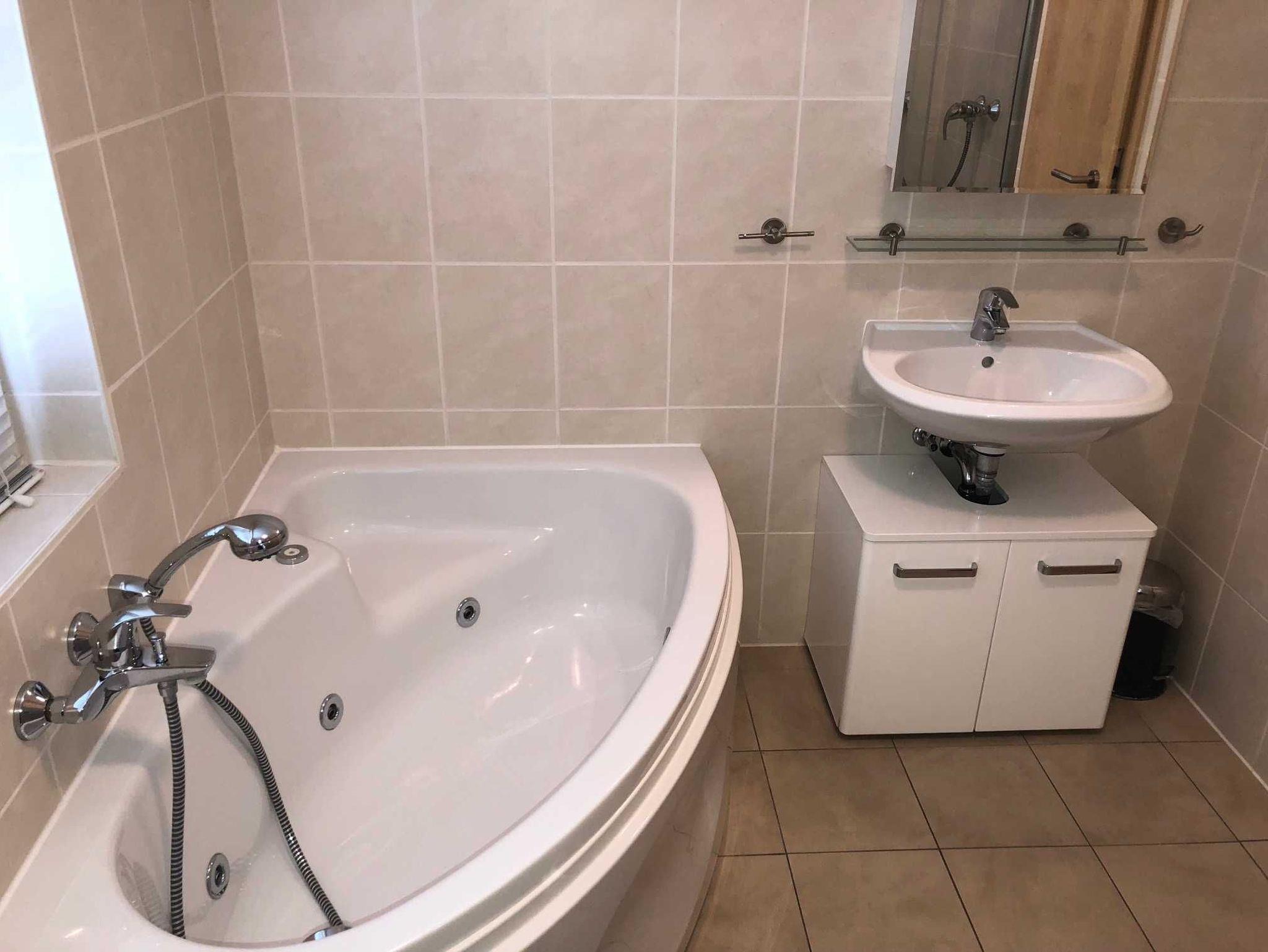 Bad mit Dusche, WC, Waschplatz und kleinen Whirlpool.