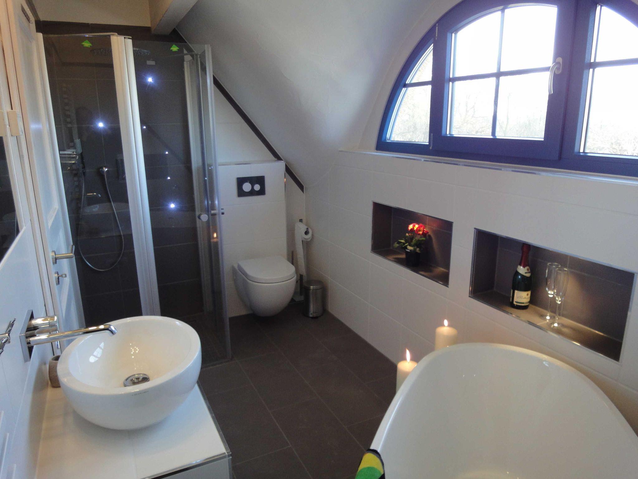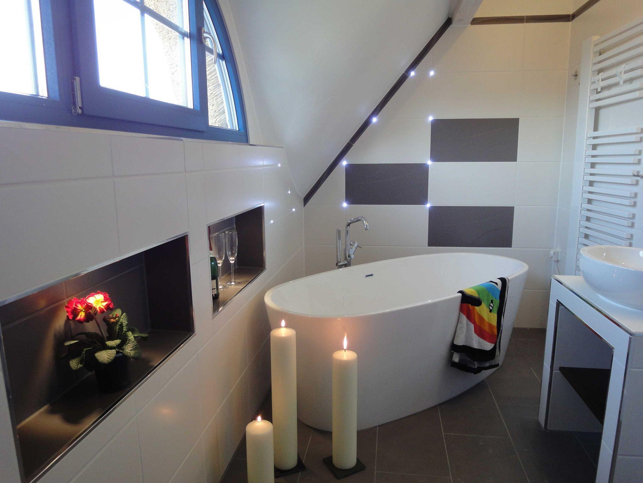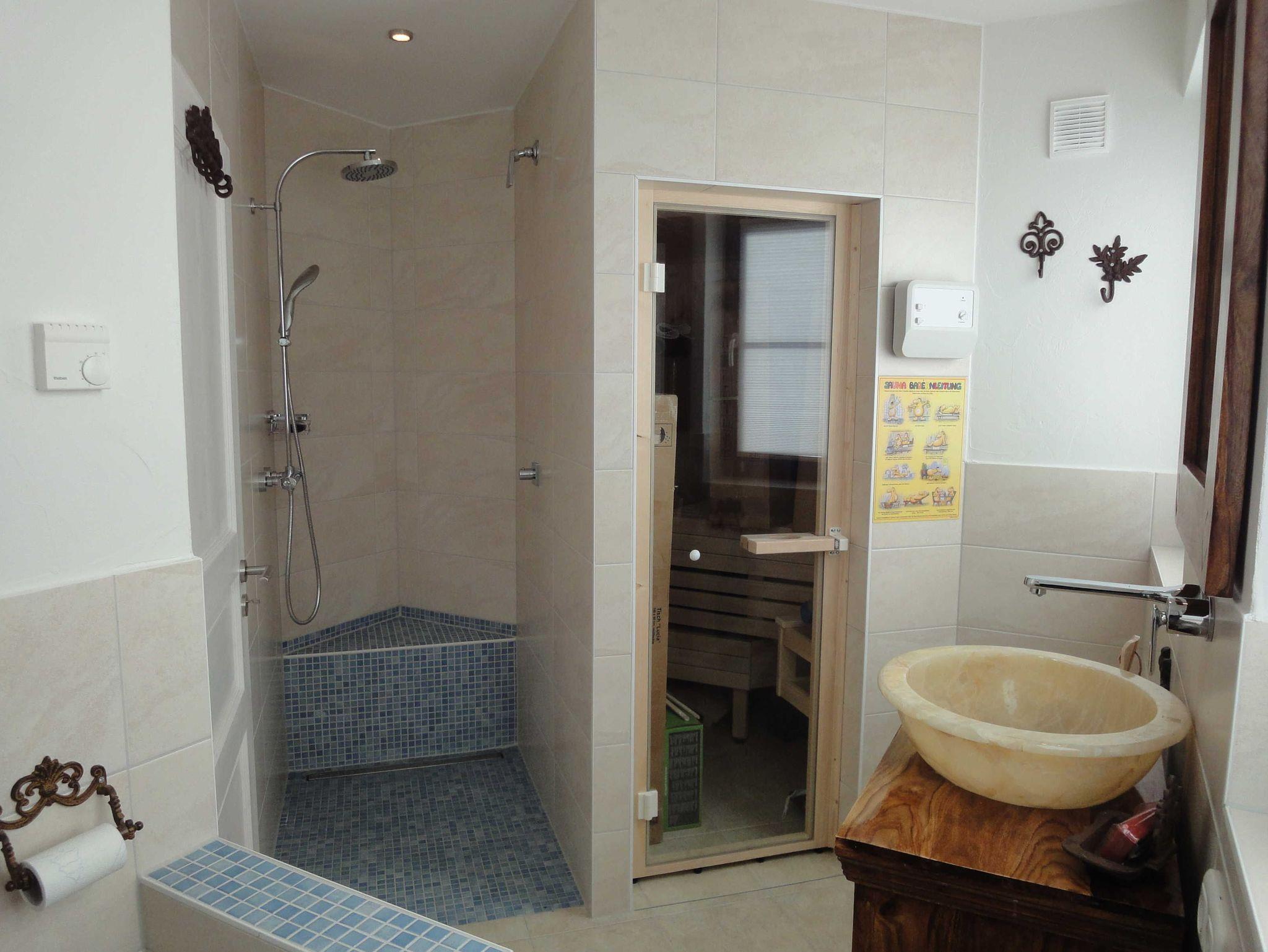 Zu romantischen Abenden lädt auch die freistehende Badewanne im Kerzenschein in einem der Bäder ein, oder lassen Sie sich vom eiskalten Brauseschwall nach der Sauna im unteren Bad erfrischen.