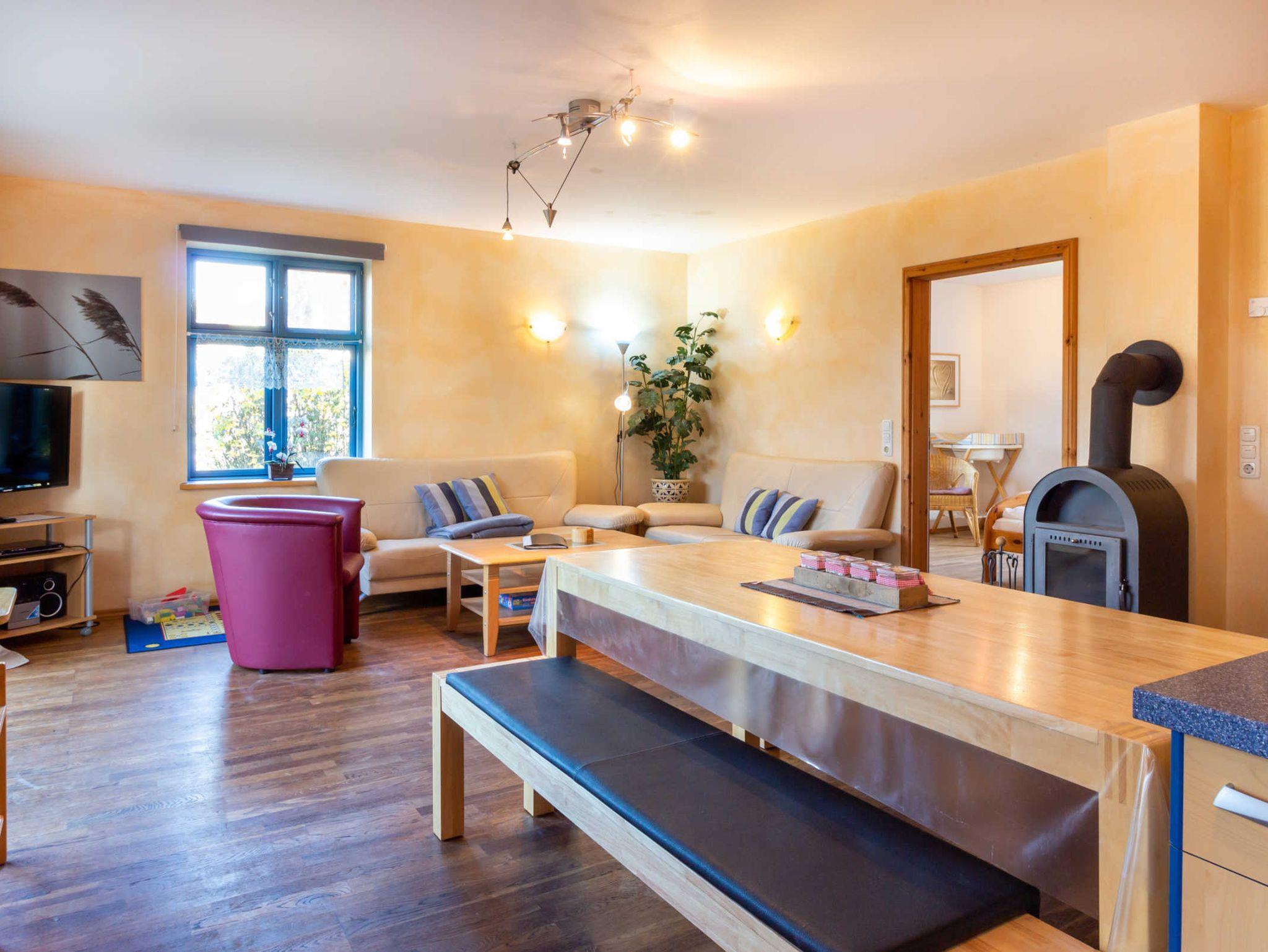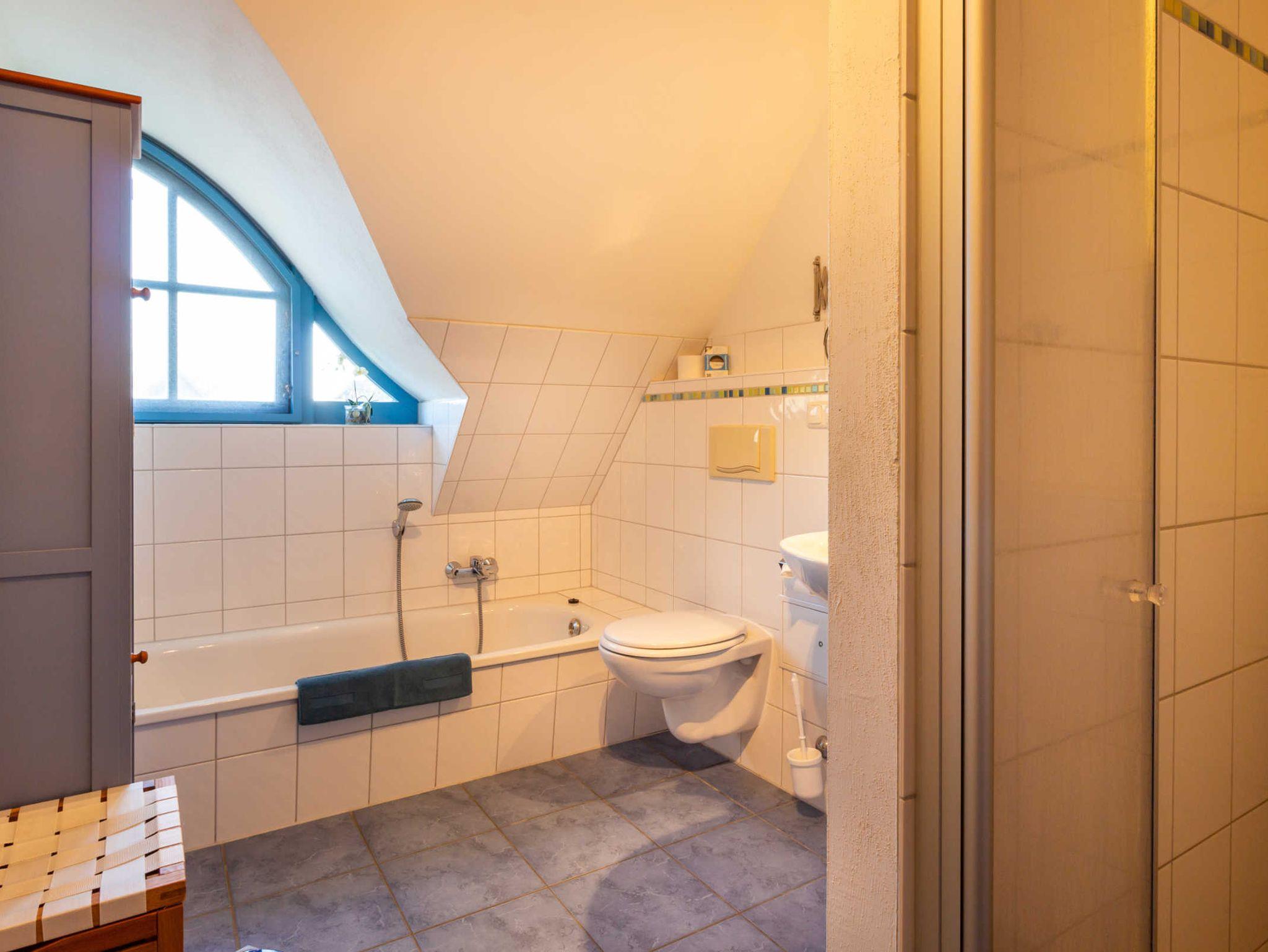 Haus 1 D: Eine von zwei rohrgedeckten Doppelhaushälften. Im Erdgeschoss mit kombiniertem Wohn- und Esszimmer mit Küchenzeile und Esstisch sowie Sitzecke mit TV und Kaminofen. Vom Wohnzimmer haben Sie Zugang zur Terrasse. Das Erdgeschoss ist rollstuhlgerecht, mit ebenerdiger Dusche/WC mit Haltegriffen und einem Schlafzimmer. Im Obergeschoss befinden sich zwei separate Schlafzimmer, beide jeweils mit Doppelbett, eins zusätzlich mit Schlafcouch. Das Badezimmer ist mit WC und Badewanne ausgestattet.