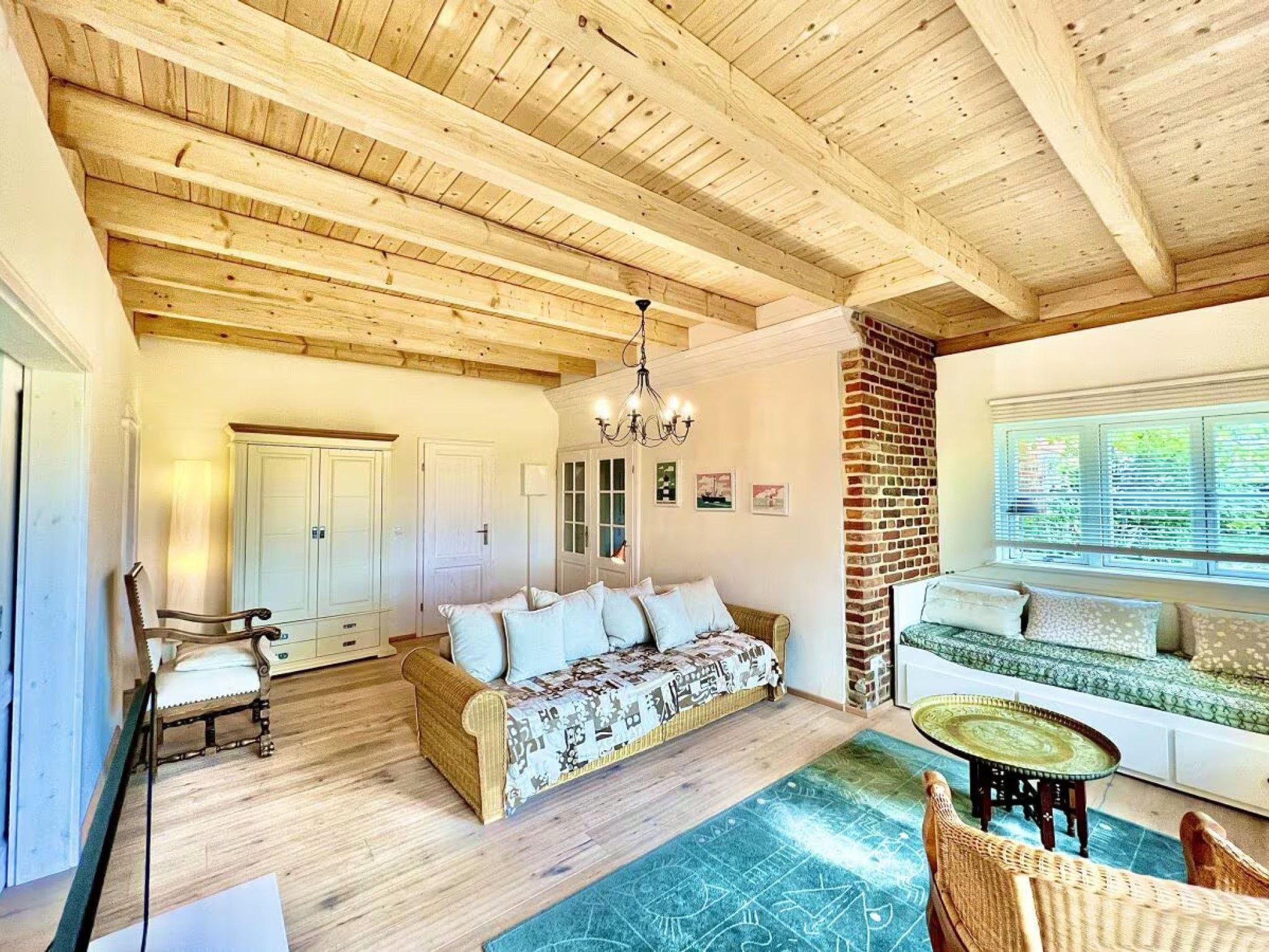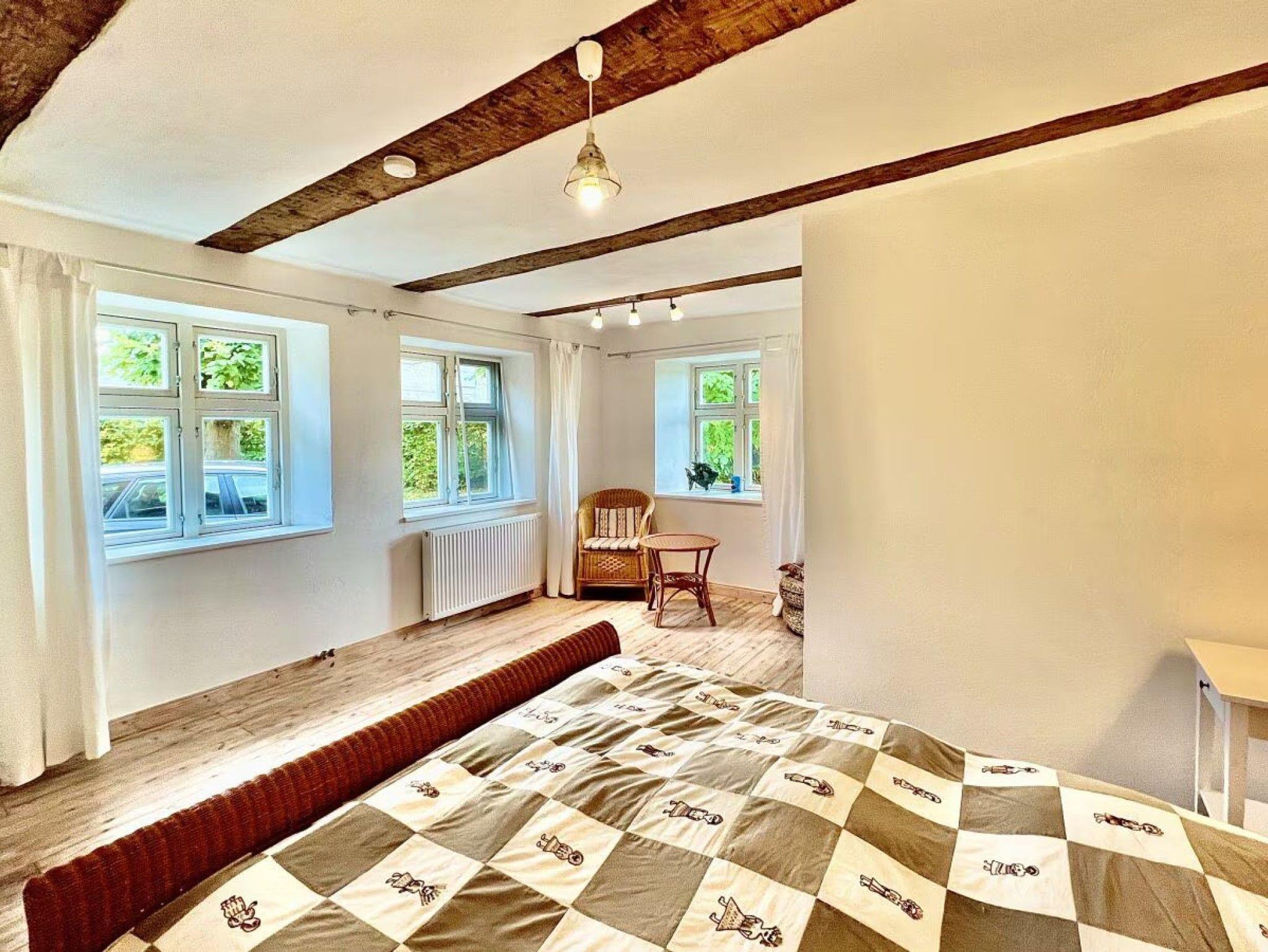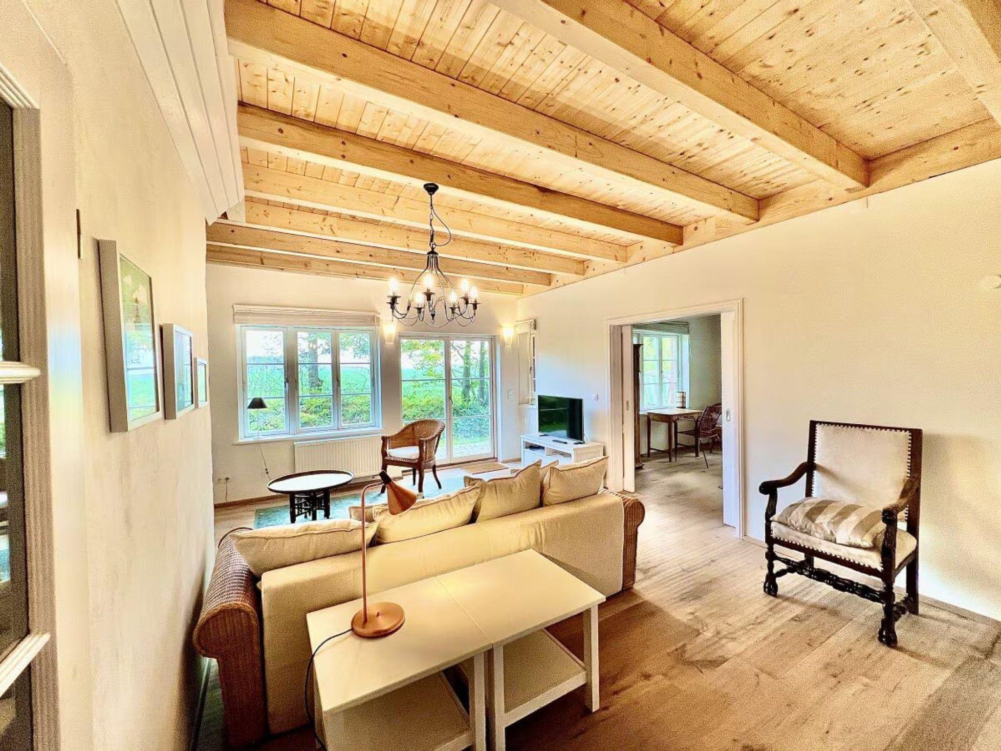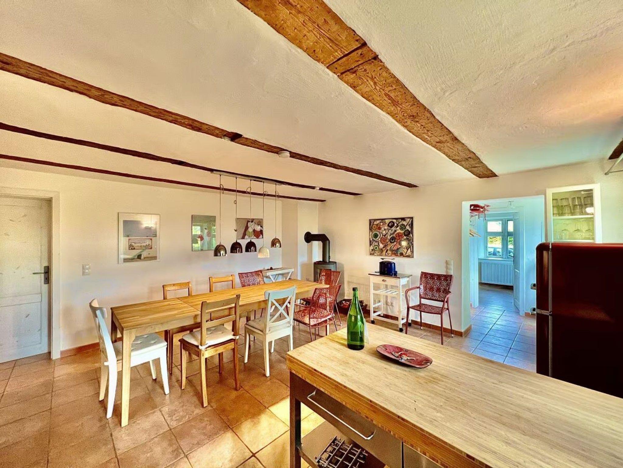 Das über 150 Jahre alte Gutshaus Vieregge befindet sich inmitten eines weitläufigen Gartens, der an eine Wiese grenzt, die bis zum Bodden reicht. Im Jahr 2010 wurde das Gebäude unter Berücksichtigung ökologischer Aspekte denkmalgerecht restauriert und modern eingerichtet. 2021 erhielt das Haus eine Renovierung, und die Ferienwohnung im Südwestflügel wurde um einen neuen Bereich erweitert, der nun 124 qm umfasst, einschließlich eines Wintergartens, zwei Schlafzimmern, einem zusätzlichen Bad und einer 40 qm großen Terrasse. Das sichtbare Holzgebälk verleiht dem Haus einen besonderen Charme. Im historischen Teil ist das Innere durchgehend mit Lehm verputzt, was ein gesundes Raumklima schafft. Zudem sorgt die Vielzahl an Fenstern für eine helle Atmosphäre.