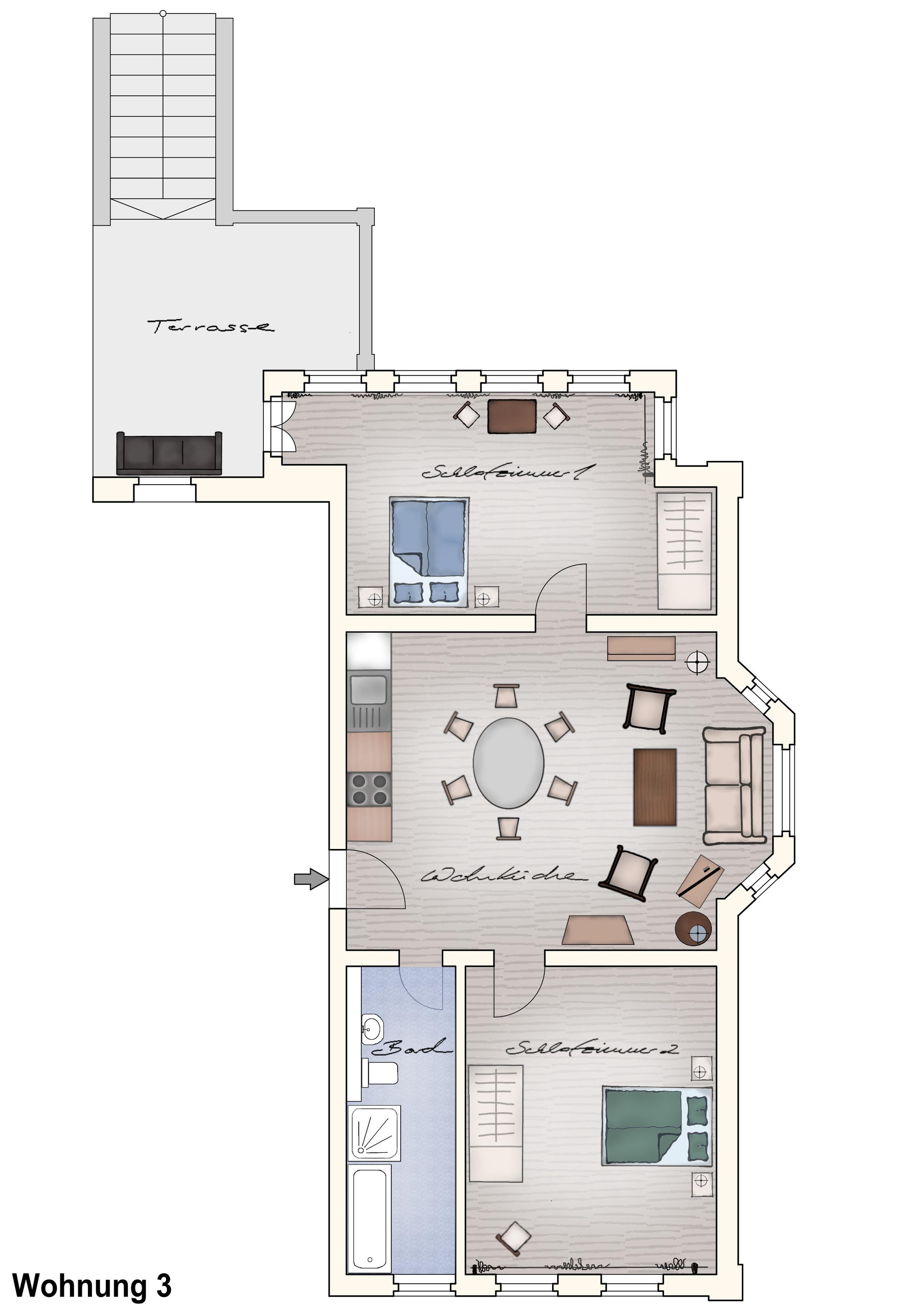 Die Ferienwohnung III des Gut Grubnow befindet sich im ersten Obergeschoss des Gutshauses. Die Wohnung für bis zu vier Personen und in einer Größe von 92 m² ist geschmackvoll eingerichtet und besteht aus drei Zimmern: Ein großes Wohnzimmer mit offener Küche (Siemens-Geräte) und schönem Blick auf den Garten, das Wasser und den Badesteg, zwei großzügige Schlafzimmer mit jeweils einem Doppelbett und einem Badezimmer mit Badewanne und Dusche. Die Böden der Ferienwohnung bestehen aus Eichen-Parkett. Vom Wohnzimmer hat man einen sehr schönen Blick auf den Garten und das Wasser.