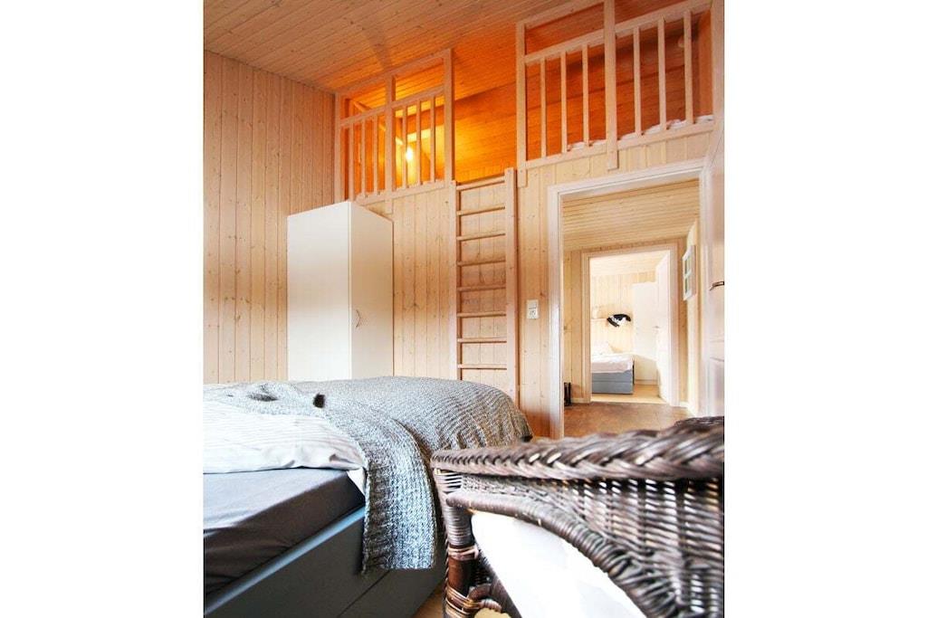 Das großzügig geschnittene Ferienholzhaus ist ideal für die ganze Familie. Der Wohn- Essbereich ist durch den Erker und die großen Türen hell und freundlich. Die offene Küche mit Tresen ist direkt mit dem Wohnbereich verbunden und hat direkten Zugang zu den schönen, umlaufenden, überdachten Terrassen. Im Wohnbereich befindet sich ein kleiner Kaminofen für gemütliche Abende. Das Hauptbad ist mit einer Sauna und einem Whirlpool ausgestattet. Das Ferienhaus ist mit 3 komfortablen Doppelbetten 180 x 200 cm ausgestattet. Ein großer, gemütlicher Schlafboden mit Doppelmatratze 180 x 200 cm ist ideal für Kinder.