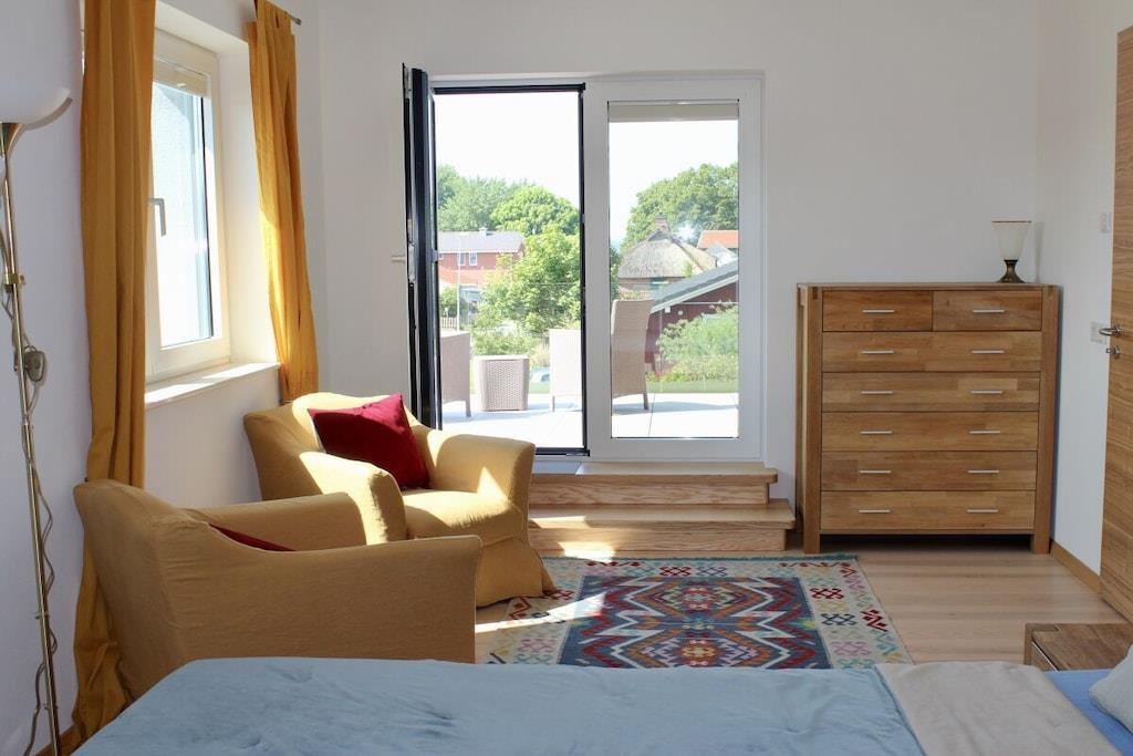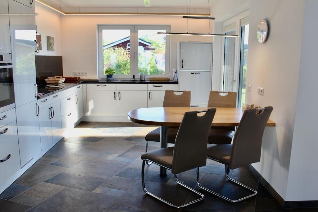 Unser Ferienhaus liegt in dem ruhigen Dorf Neukirchen, direkt an der Flensburger Förde mit traumhaftem Blick auf die "Dänische Südsee". Auf einer großzügigen Wohnfläche stehen Ihnen fünf Zimmer zur Verfügung. Zwei große Dachterrassen mit herrlichem Ausblick über die Ostsee bis ins benachbarte Dänemark gehören ebenso dazu, wie zwei ebenerdige Terrassen. Zum einen die von der Küche bzw. dem Wohn- und Esszimmer aus zugängliche überdachte "Frühstücksterrasse" und zum anderen die sonnige, wind- und sichtgeschützte Südterrasse im Innenhof. Hier befindet sich auch eine kleine Holzsauna mit Außendusche und einer der Zugänge zum Freizeitbereich mit Tischtennisplatte, Kicker und einigen Fitnessgeräten.