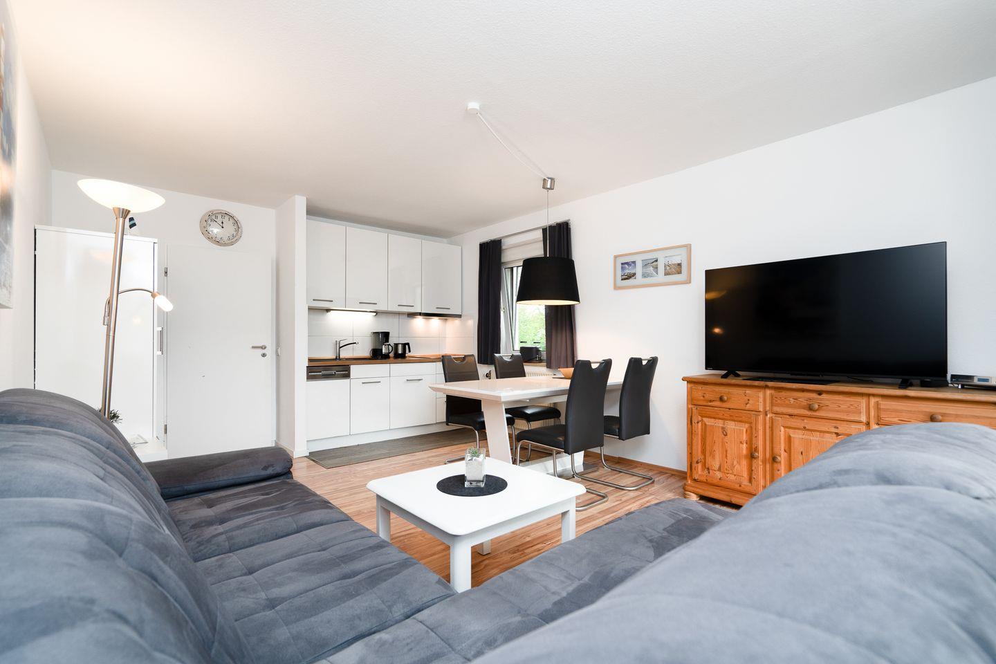 diese 3-Raum-Wohnung liegt im Erdgeschoß eines Mehrparteienhauses mit Südterrasse und einem Gartenanteil. Die Wohnung hat einen kombinierten Wohn- und Essbereich mit integrierter Küchenzeile. Von hier aus haben Sie Zugang zur Terrasse. Die Küche ist mit Spülmaschine, Backofen, Herd und Mirkowelle gut ausgestattet, zudem verfügt die Wohnung auch über eine Waschmaschine. Der erste Schlafraum hat ein franz. Bett (2x 80 x 200 cm), im zweiten Schlafraum stehen 2 Einzelbetten (je 90 x 200 cm). Hier ist kein Platz, um zwischen den Betten noch ein Kinderreisebettchen aufzustellen. Im Wohnraum steht zudem eine Schlafcouch (140 x 190 m). Die Wohnung hat ein kleines, aber modernes Duschbad.