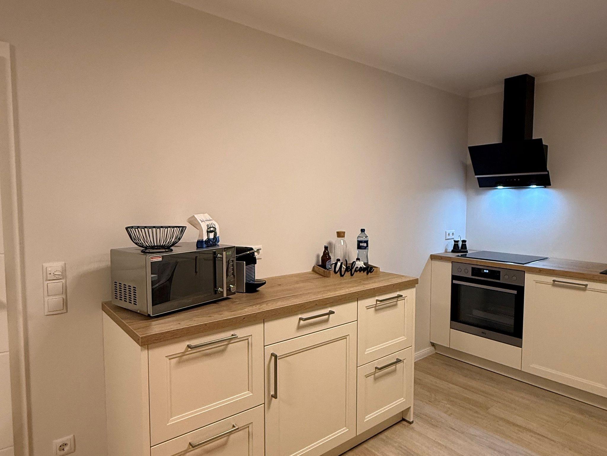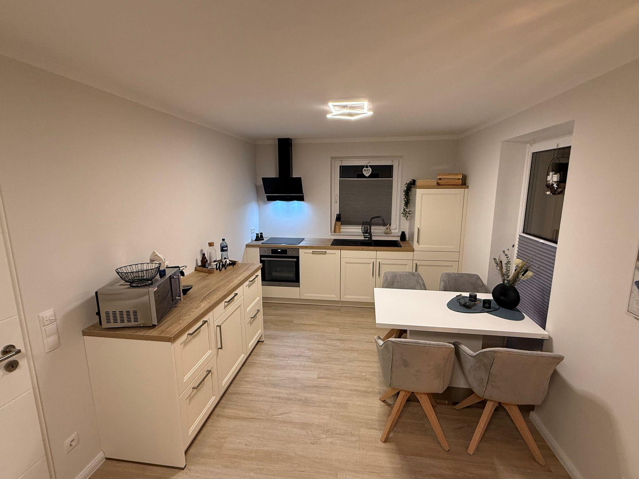 Flur, Schlafzimmer mit Boxspringbett (1,80 m x 2,00 m), eine offenen Wohnküche (Geschirrspüler und andere elektrische Küchengeräte vorhanden) mit Schlafsofa und TV und ein Duschbad mit ebenerdiger Dusche.