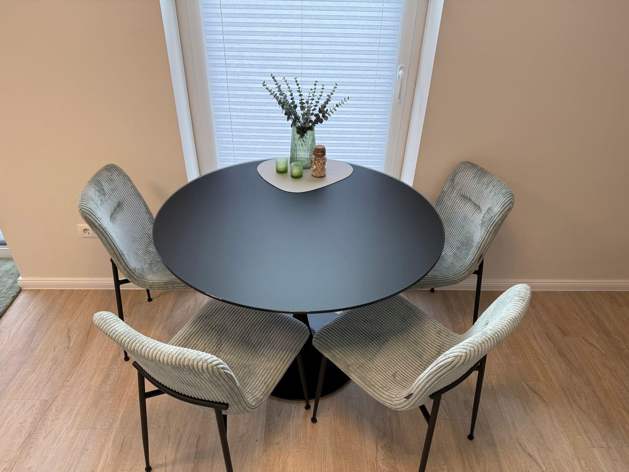 Flur, Schlafzimmer mit Boxspringbett (1,80 m x 2,00 m), eine separate Küche (Geschirrspüler und andere elektrische Küchengeräte vorhanden) Wohnzimmer mit Essbereich, Schlafsofa und TV und ein Duschbad mit ebenerdiger Dusche.