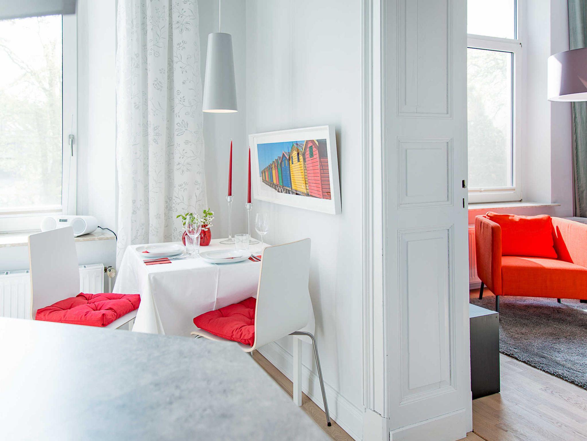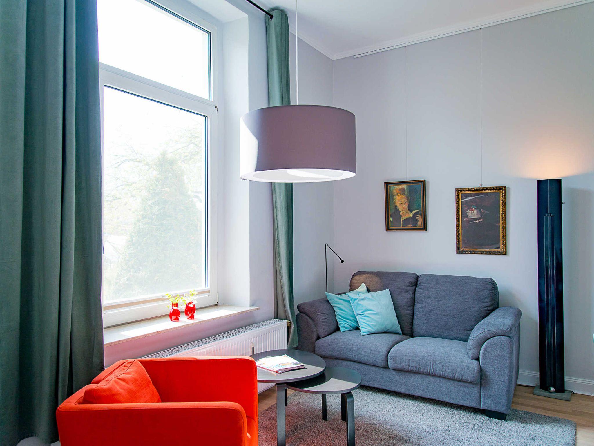 Unsere moderne 1-Zimmer-Wohnung im Erdgeschoss einer historischen Stadtvilla mit separatem Eingangangsbereich (Flur) und Garderobe, 39 qm, Deckenhöhe 3,70 m. und Eichenparkett-Boden befindet sich in zentraler, ruhiger, stadt- und strandnaher Lage.