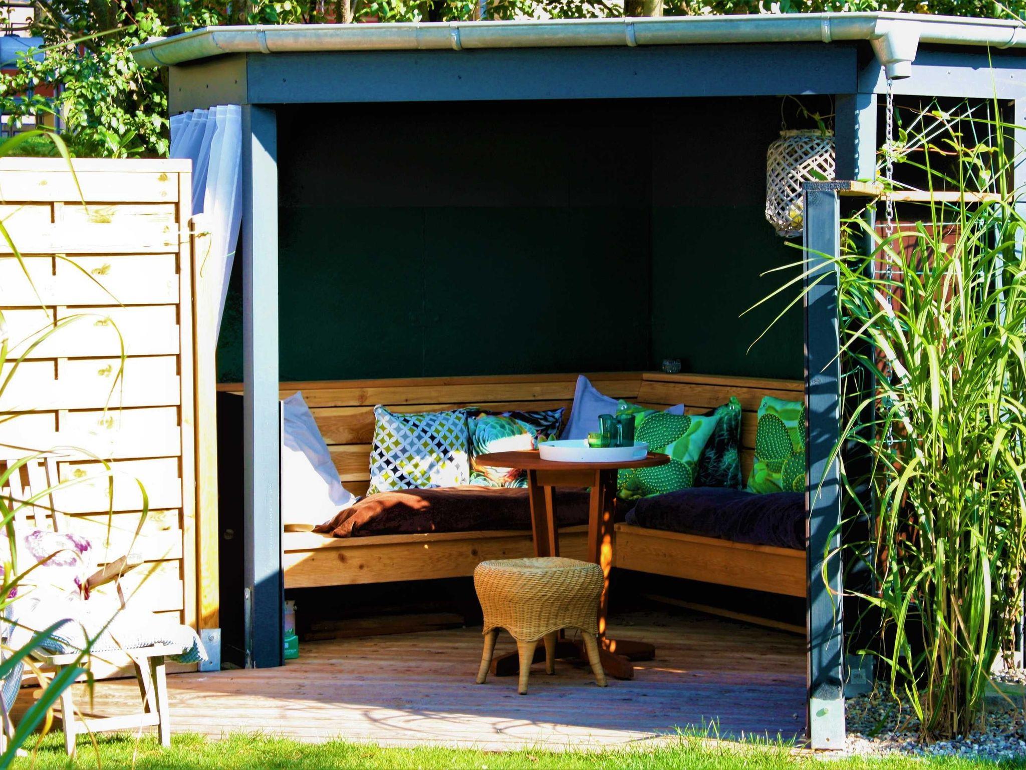 In der Morgensonne können unsere Gäste im rückwärtigen Garten des Hauses frühstücken und die Abendsonne im eigenen Pavillon genießen. Da dieser rückwärtige Gartenteil nicht komplett eingezäunt ist, sind Hunde hier leider nicht gestattet. Es ist lediglich eine Belegung für zwei Erwachsene möglich.
