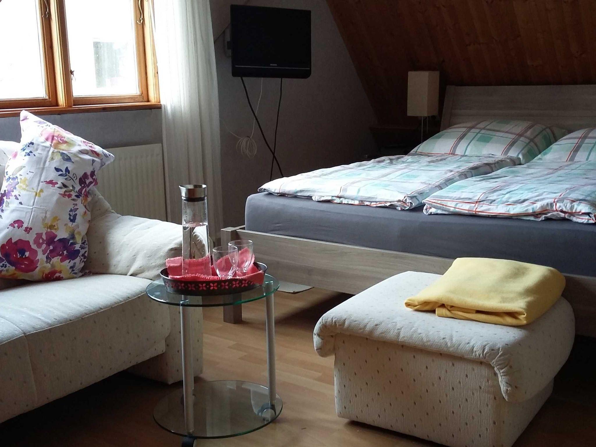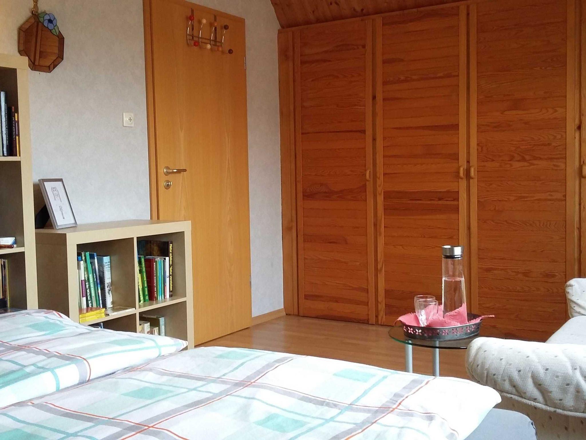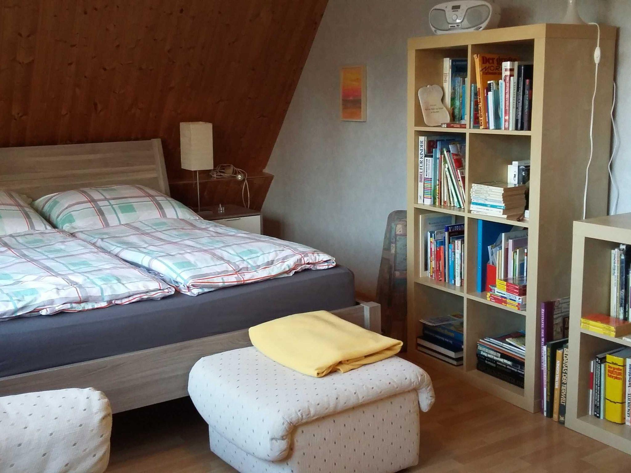 Das Doppelzimmer befindet sich im 1. Stock (Dachgeschoss) des Einfammilienhauses. Es ist folgendermaßen ausgestattet: großes französisches Bett (durchgehende Matratze 160 x 200 cm), Kleiderschrank, ein kleines Sofa mit Hocker. Im Regal findet sich eine große Auswahl an Büchern. Das TV-Gerät ist an der Wand montiert, so dass man gut vom Bett aus fernsehen kann. Das Tageslichtduschbad/WC befindet sich direkt neben dem Zimmer.