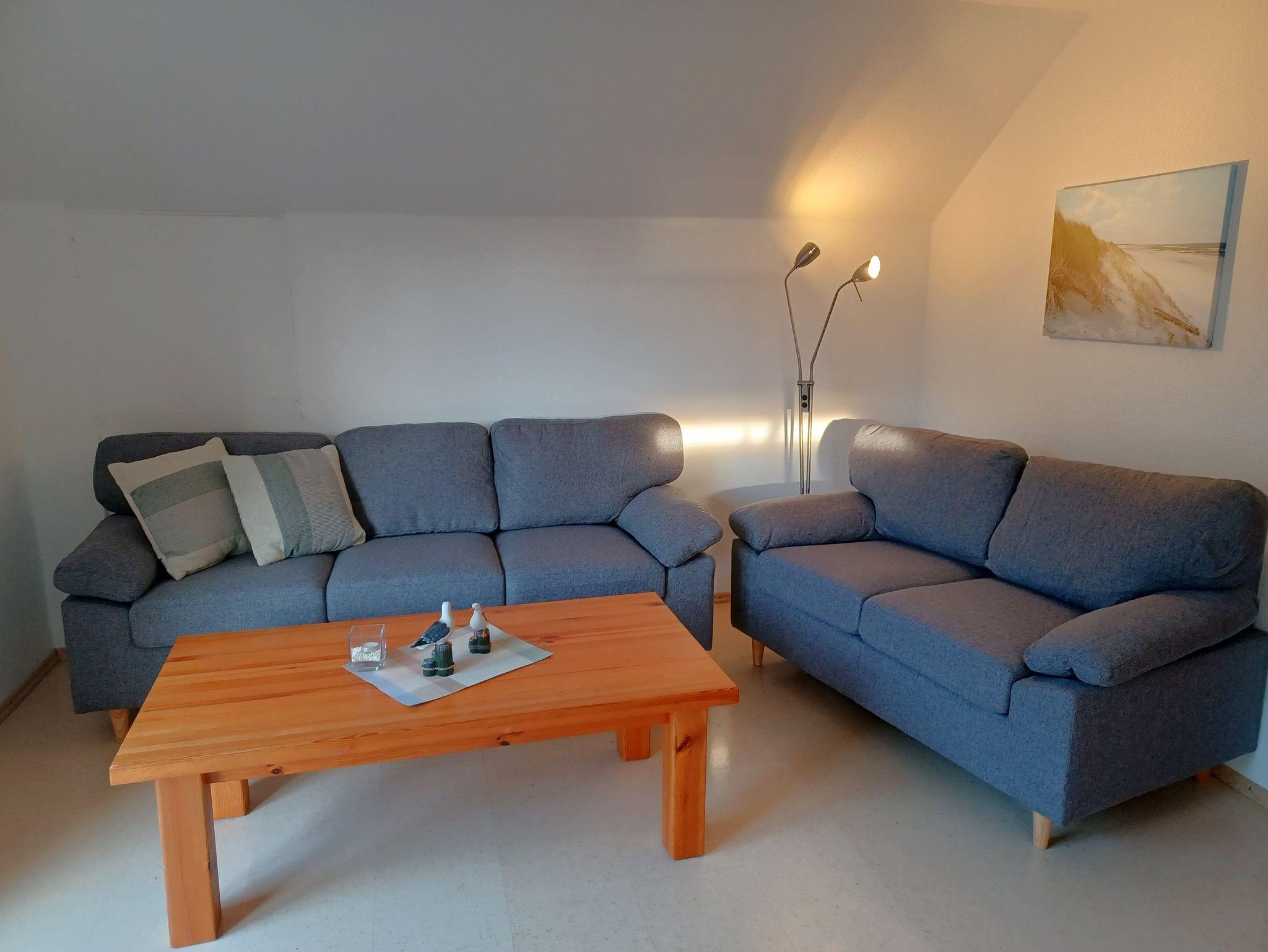 Modern eingerichtete 3-Zimmer-Wohnung (Nichtraucher!) im Obergeschoss mit kleinem Balkon. Das 24 m² große Wohnzimmer besteht aus einer gemütlichen Sitzecke mit einer Schrankwand und SAT-TV sowie einer Stereoanlage.