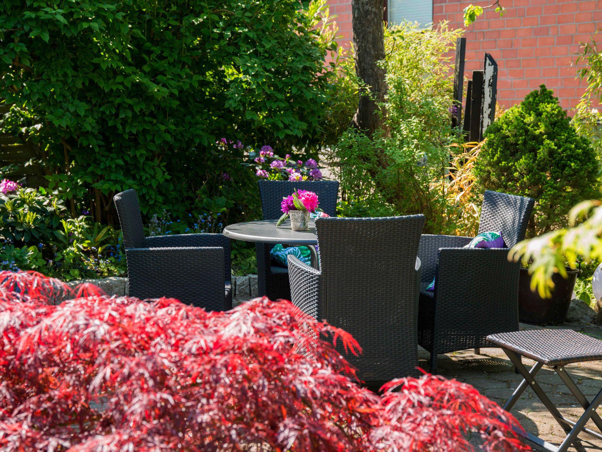 Der große Garten mit großzügigen Einzelbereichen, Sitzgruppen und Liegestühlen lädt zum Verweilen und Entspannen ein.