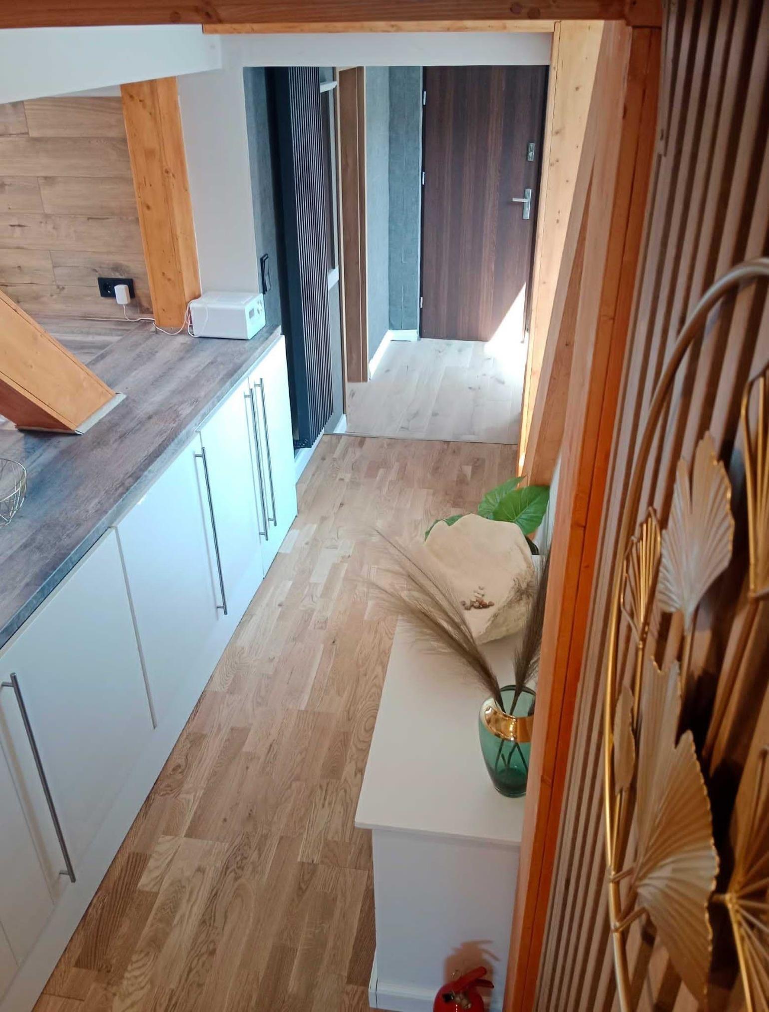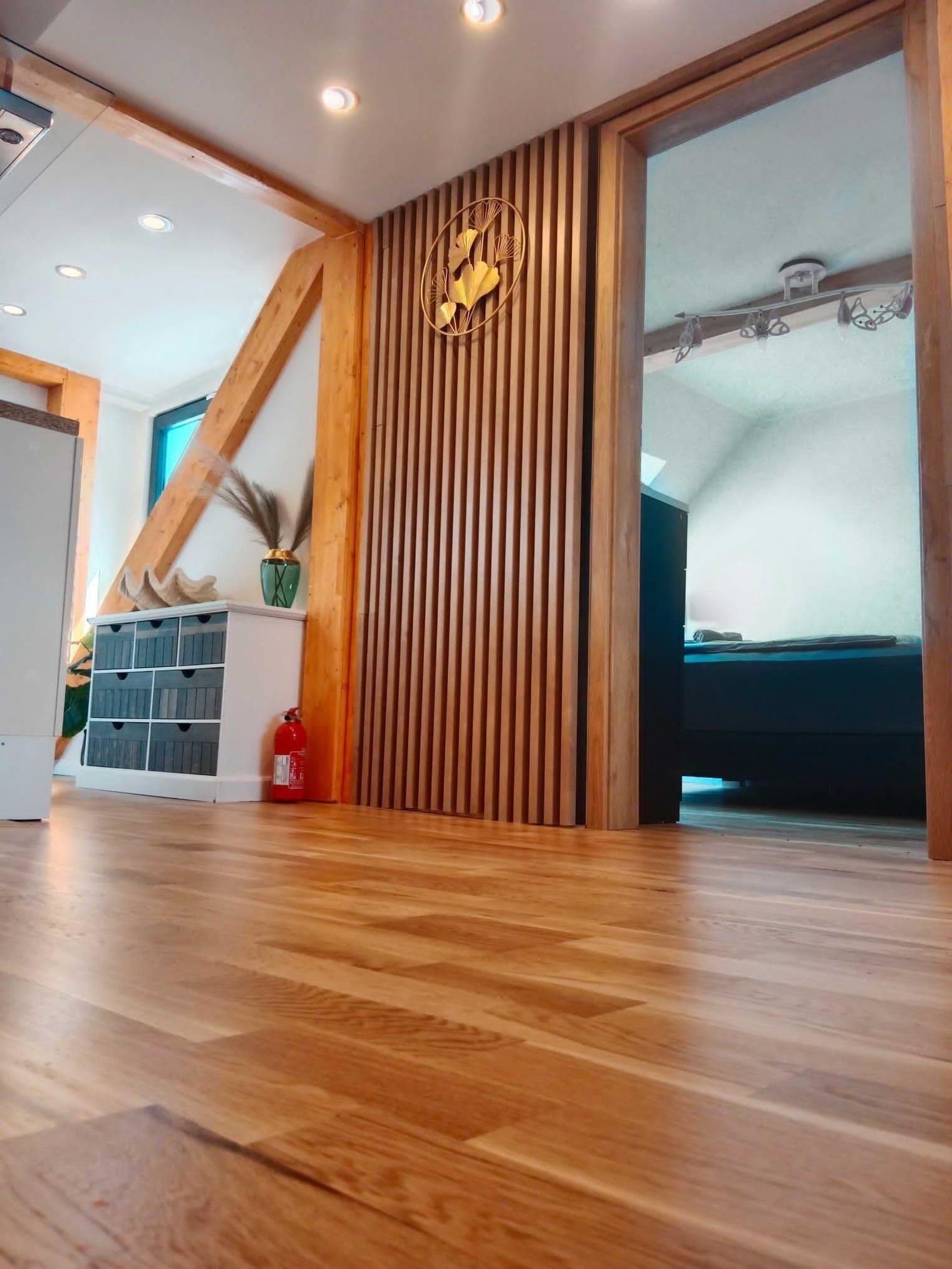 Oberer Wohnungsbereich: großes Bett, Kommode