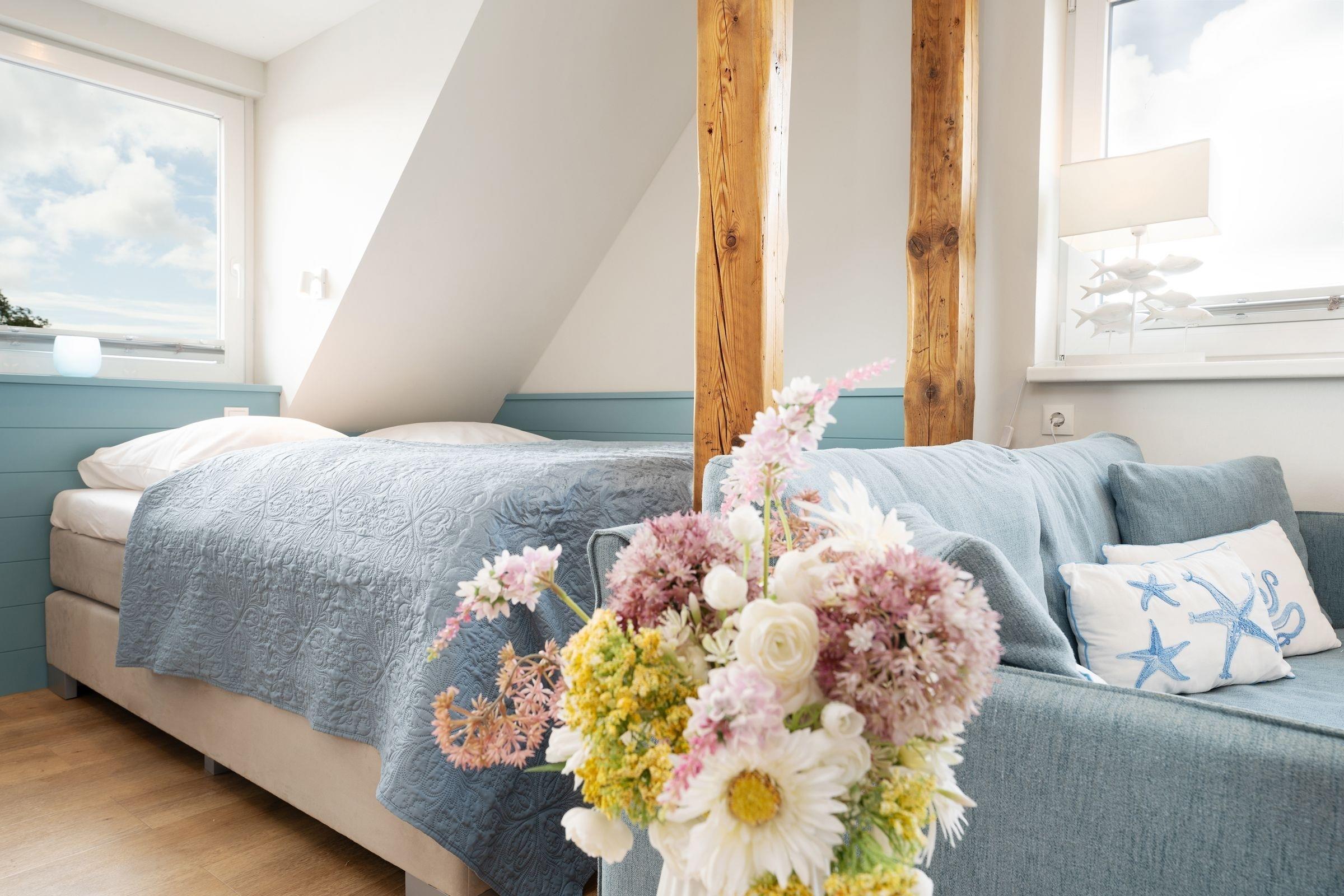 Modern und maritim eingerichtete 2-Zimmer-Ferienwohnung im 1. Stock mit einer Größe von ca. 72 m² für bis zu 4 Personen in erster Reihe der Promenade.
