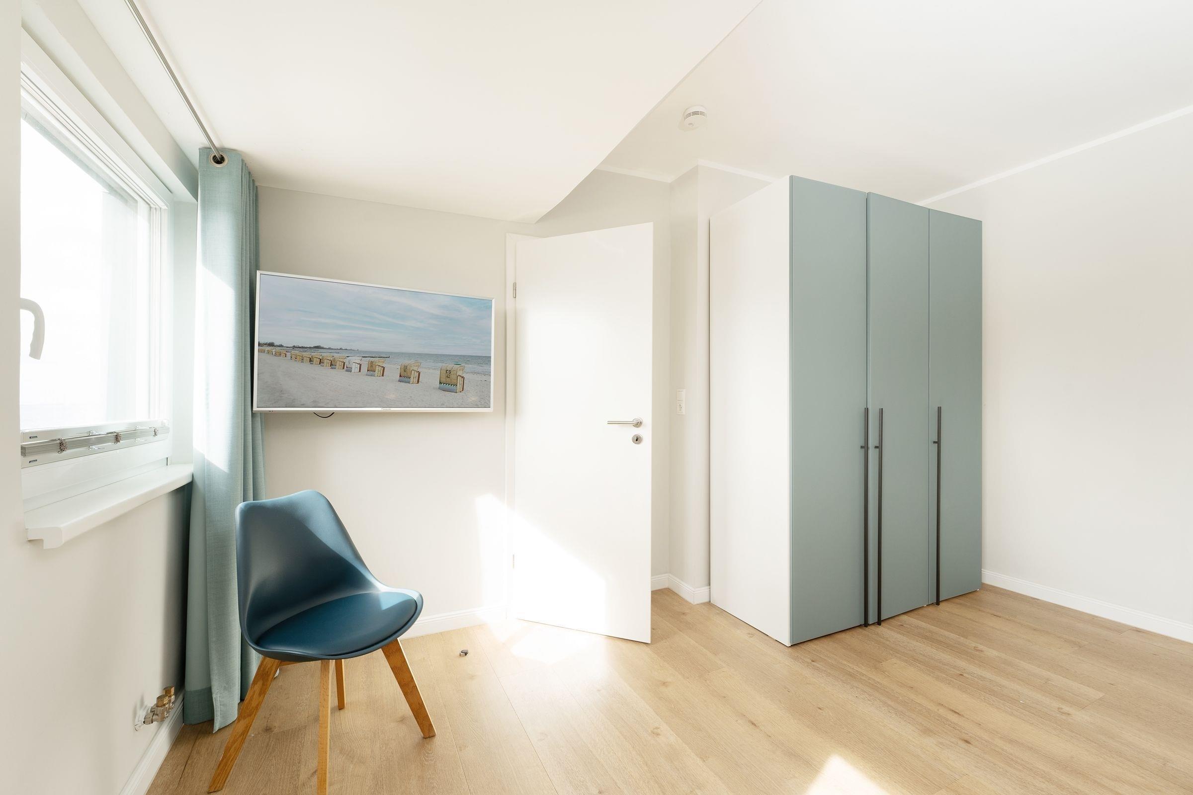 Schlafzimmer: 1 Boxspringbett (180x200 cm), durchgehender Topper, TV, Kleiderschrank, Verdunkelung (Plissees, Gardinen)