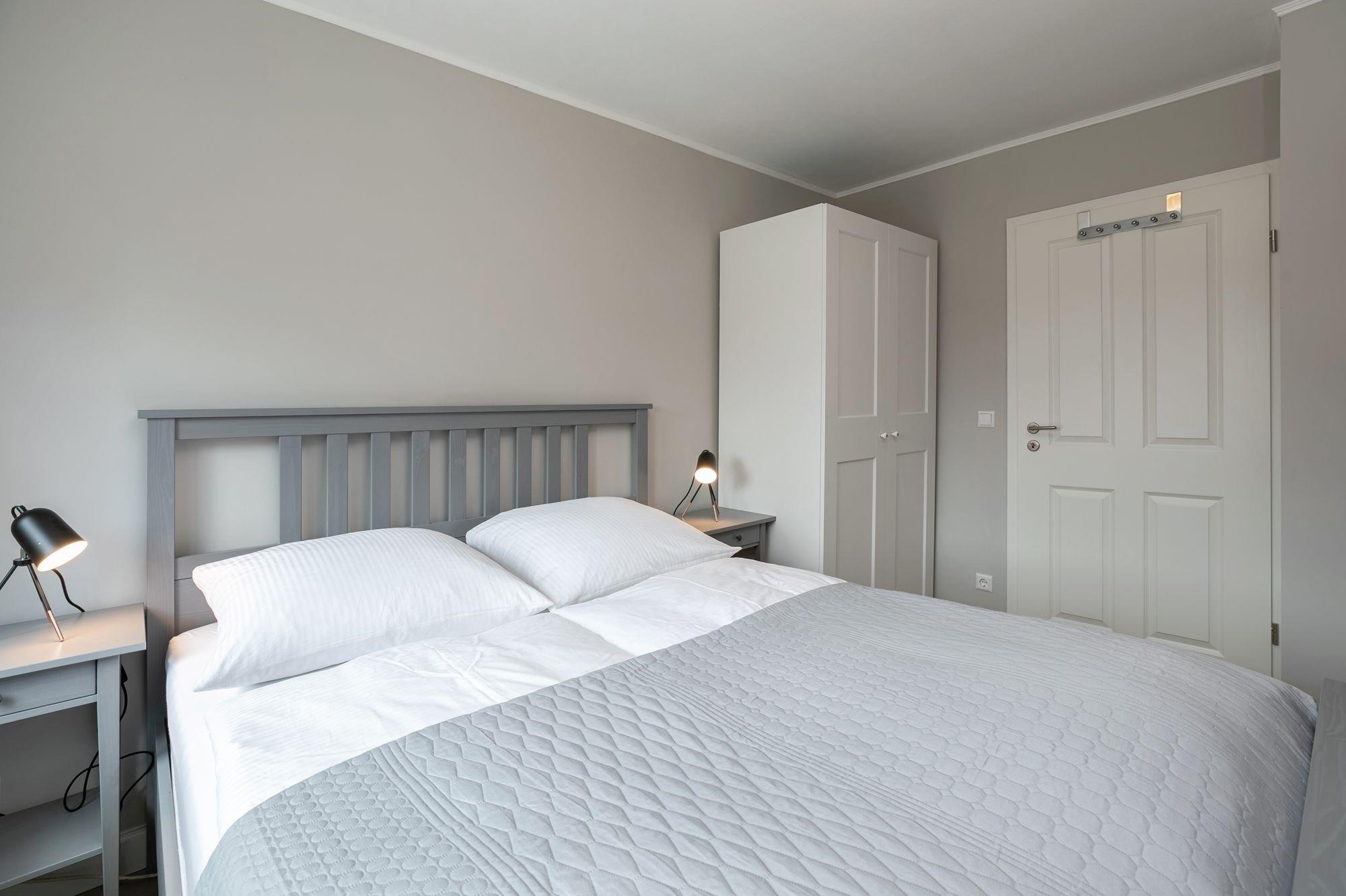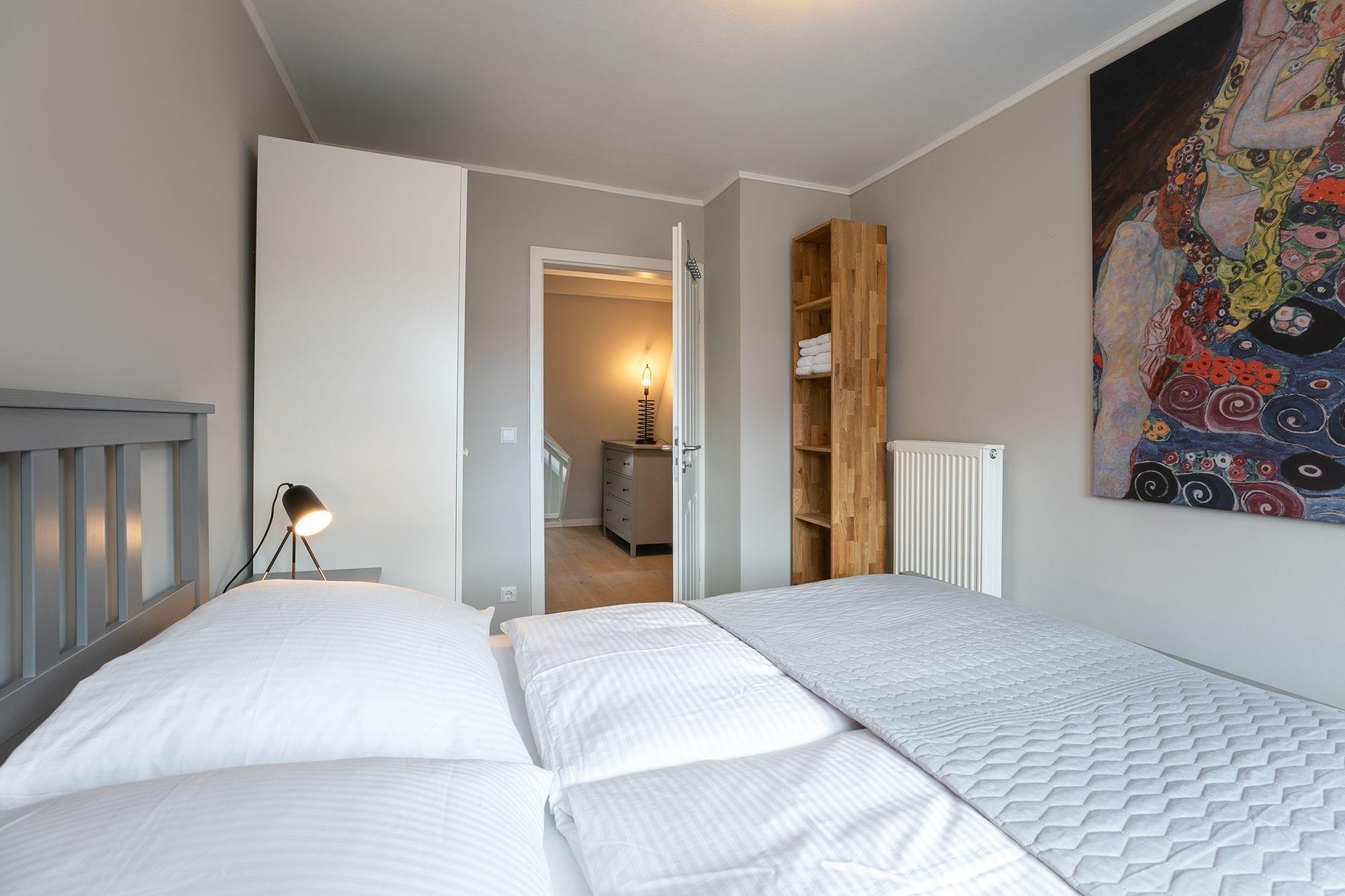 Über eine Treppe im Eingangsbereich erreichen Sie die 1. Etage. Hier befinden sich 2 separate Schlafräume: Ein Schlafzimmer mit Doppelbett (160x200 cm) und Kleiderschrank und ein weiteres Schlafzimmer mit Doppelbett (180x200 cm), Flachbildfernseher und einem weiteren Kleiderschrank. Von einem Schlafzimmer aus gelangen Sie in das separate Badezimmer mit Dusche, WC, beheizbarer Handtuchheizung und Stauraum für Ihre Badutensilien. Über eine Treppe im Flur der 1. Etage erreichen Sie den Spitzboden mit zwei getrennt stehenden Einzelbetten (je 90x200 cm), einem Nachttisch sowie einem Veluxfenster. Alle Schlafräume lassen sich zur Nacht mit elektrischen Außenrolladen angenehm verdunkeln.