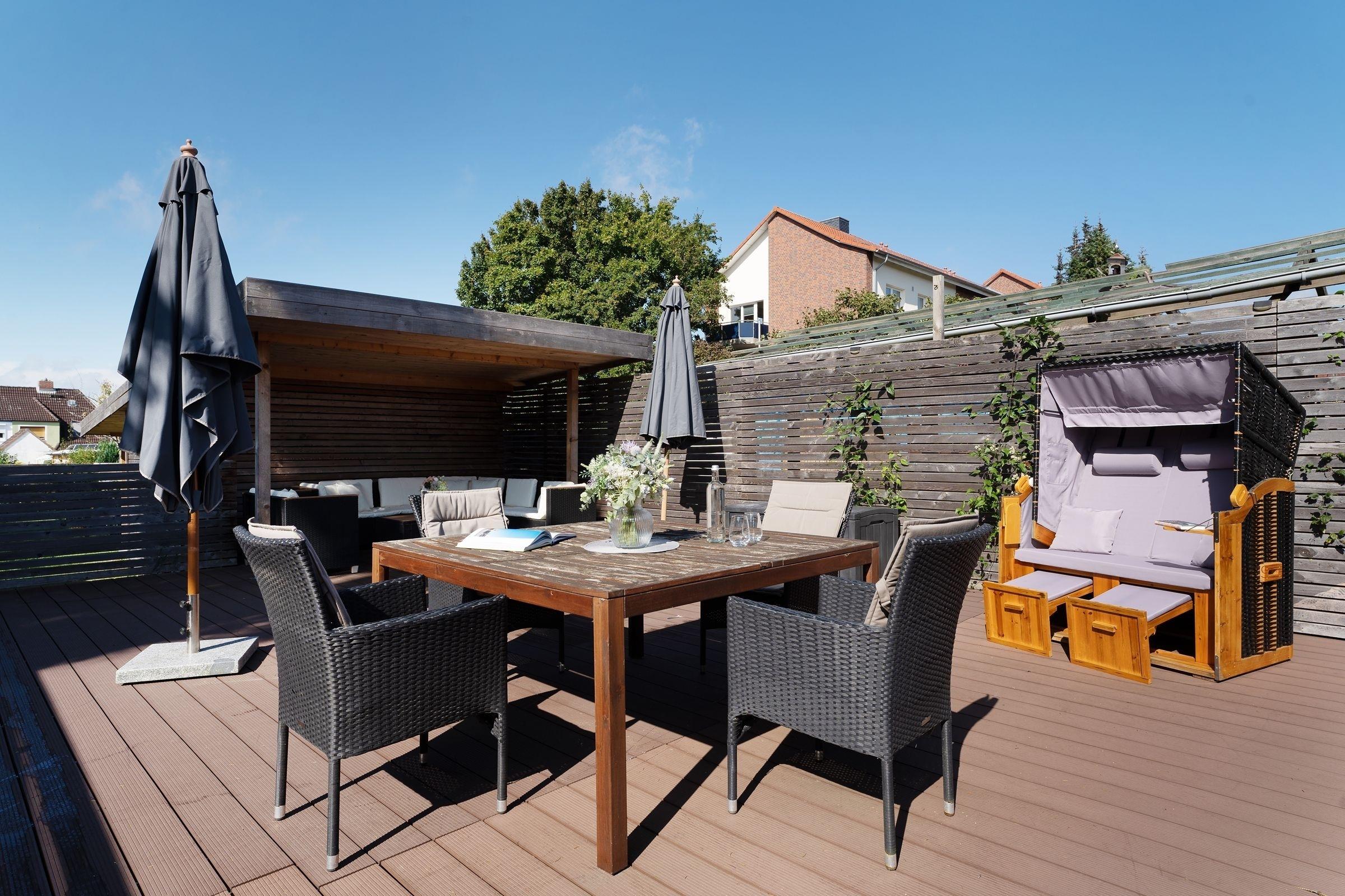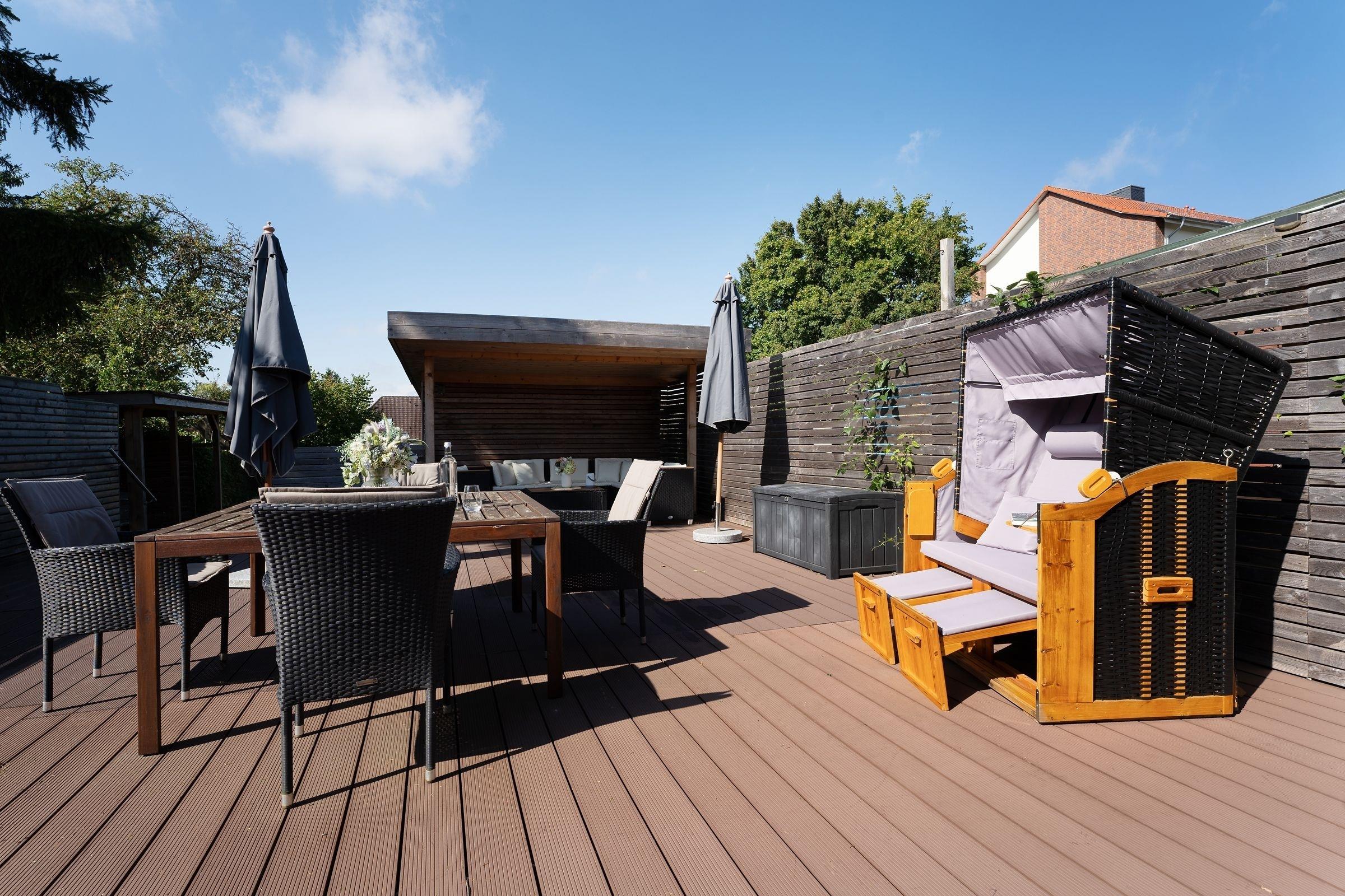 Die große Holzterrasse mit Gartenmöbeln, Sonnenschirm, Strandkorb sowie exklusiven Lounge-Möbeln ist das absolute Highlight dieser wunderschönen Ferienunterkunft und der perfekte Ort, um einen ereignisreichen Urlaubstag mit einem Glas Wein ausklingen zu lassen. Über wenige Stufen von der Terrasse hinab erreichen Sie den eigenen Garten, der zu genussvollen Grillabenden einlädt.
