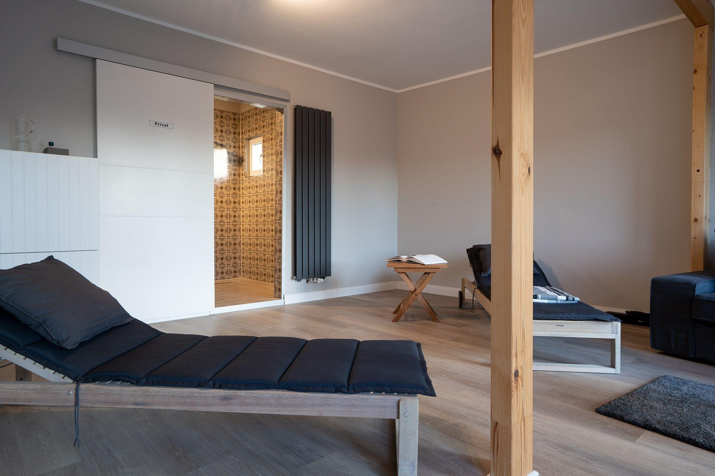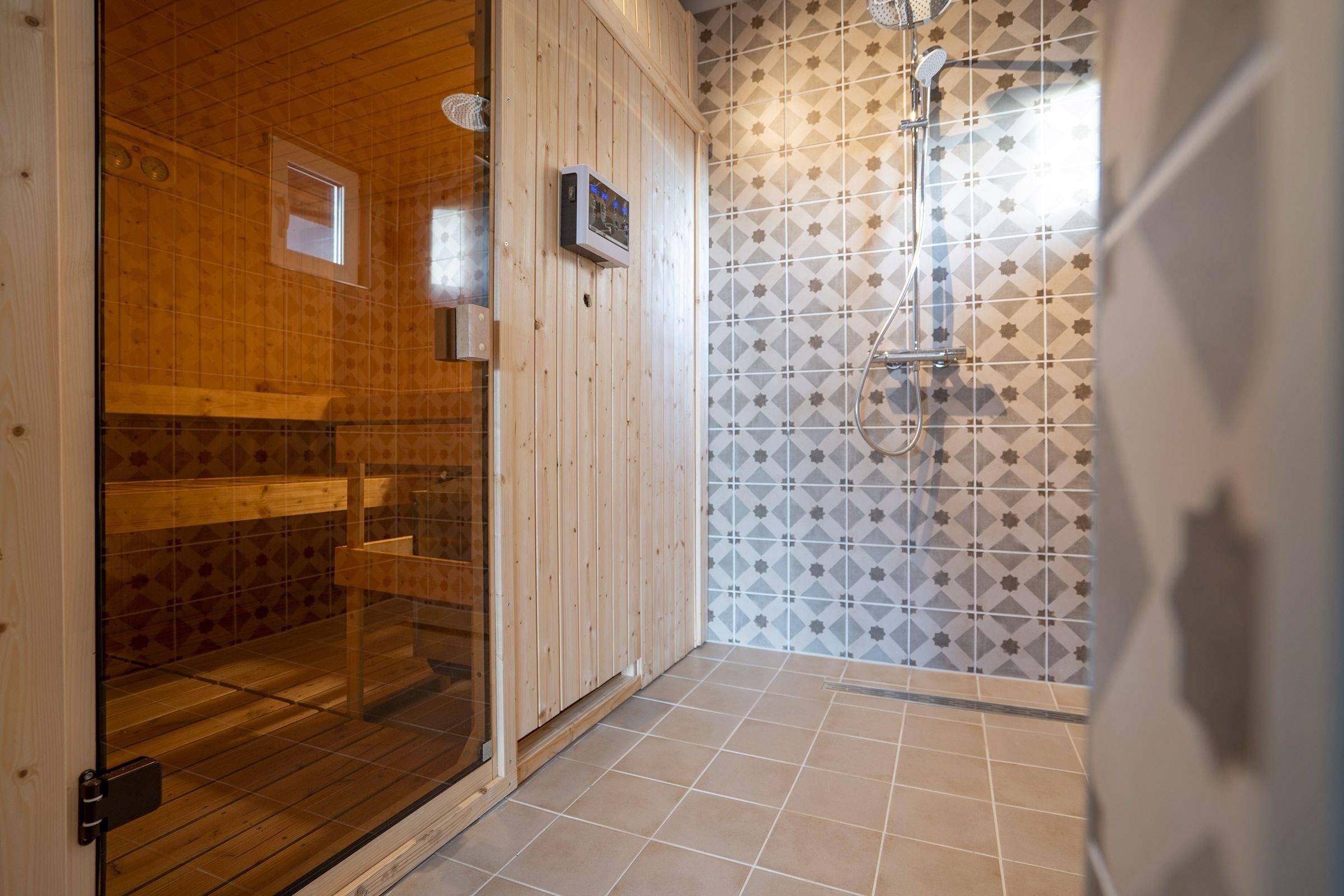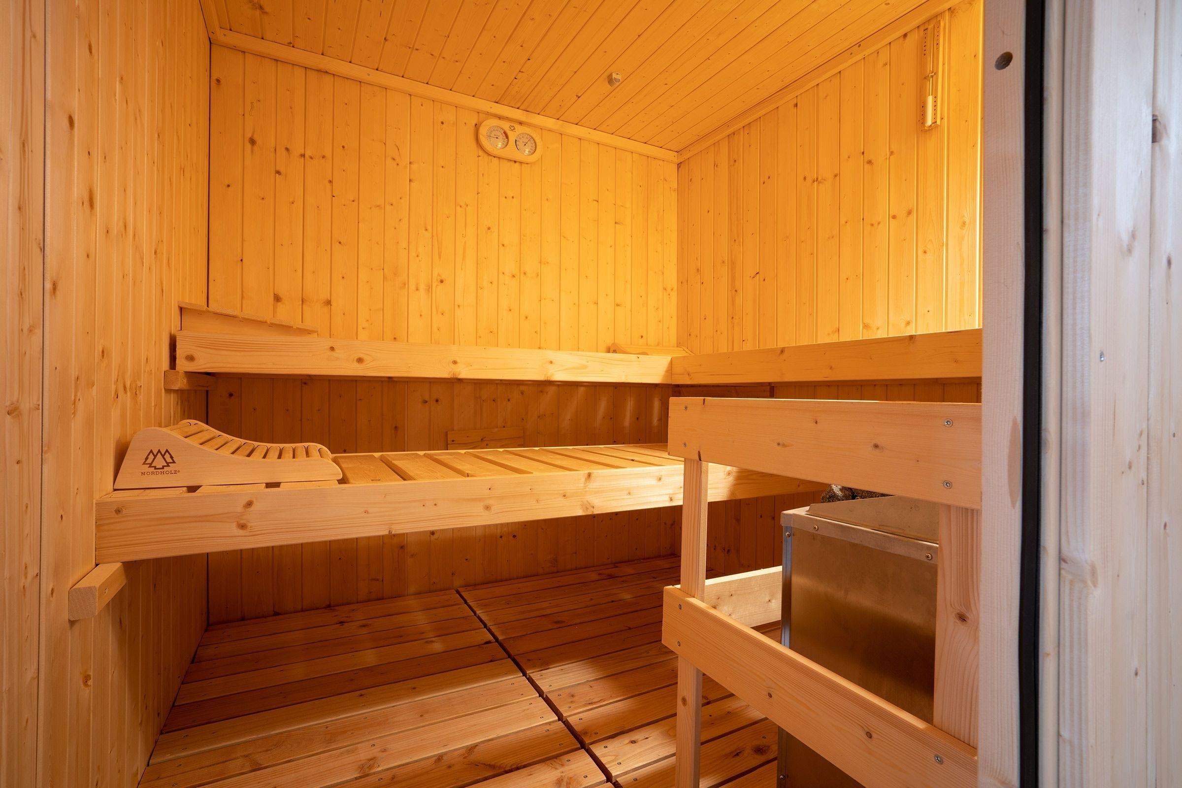 Wellness pur! Genießen und entspannen Sie im großzügigen Wellnessbereich mit eigener Sauna und Dusche (inklusive). Hochwertige Liegen laden zum Entspannen nach dem Saunagang ein und dank direktem Zugang zur Terrasse können Sie sich im Winter sogar draußen abkühlen.