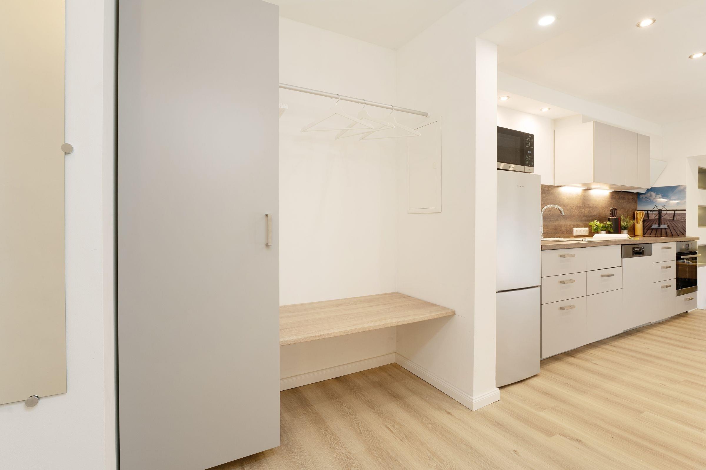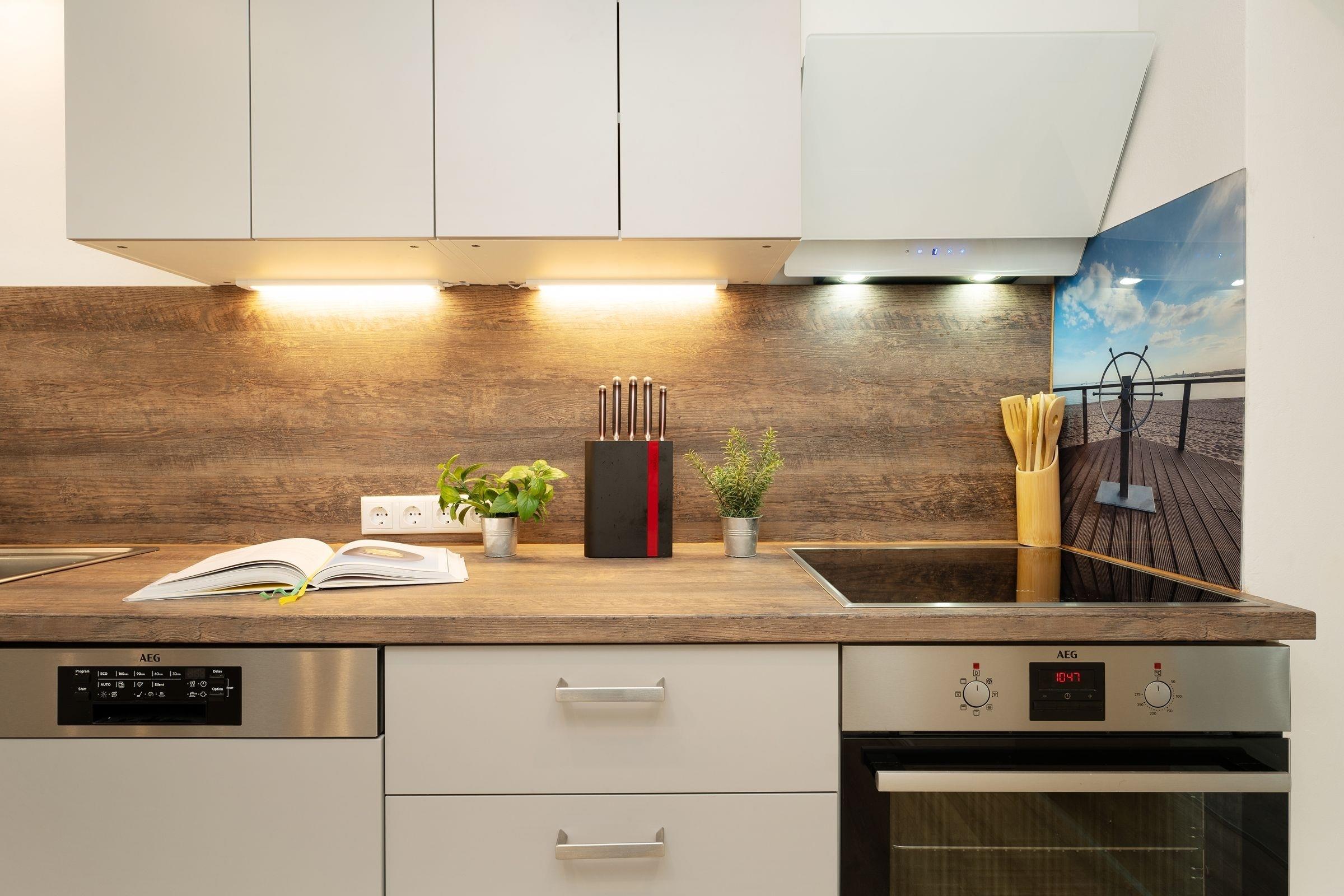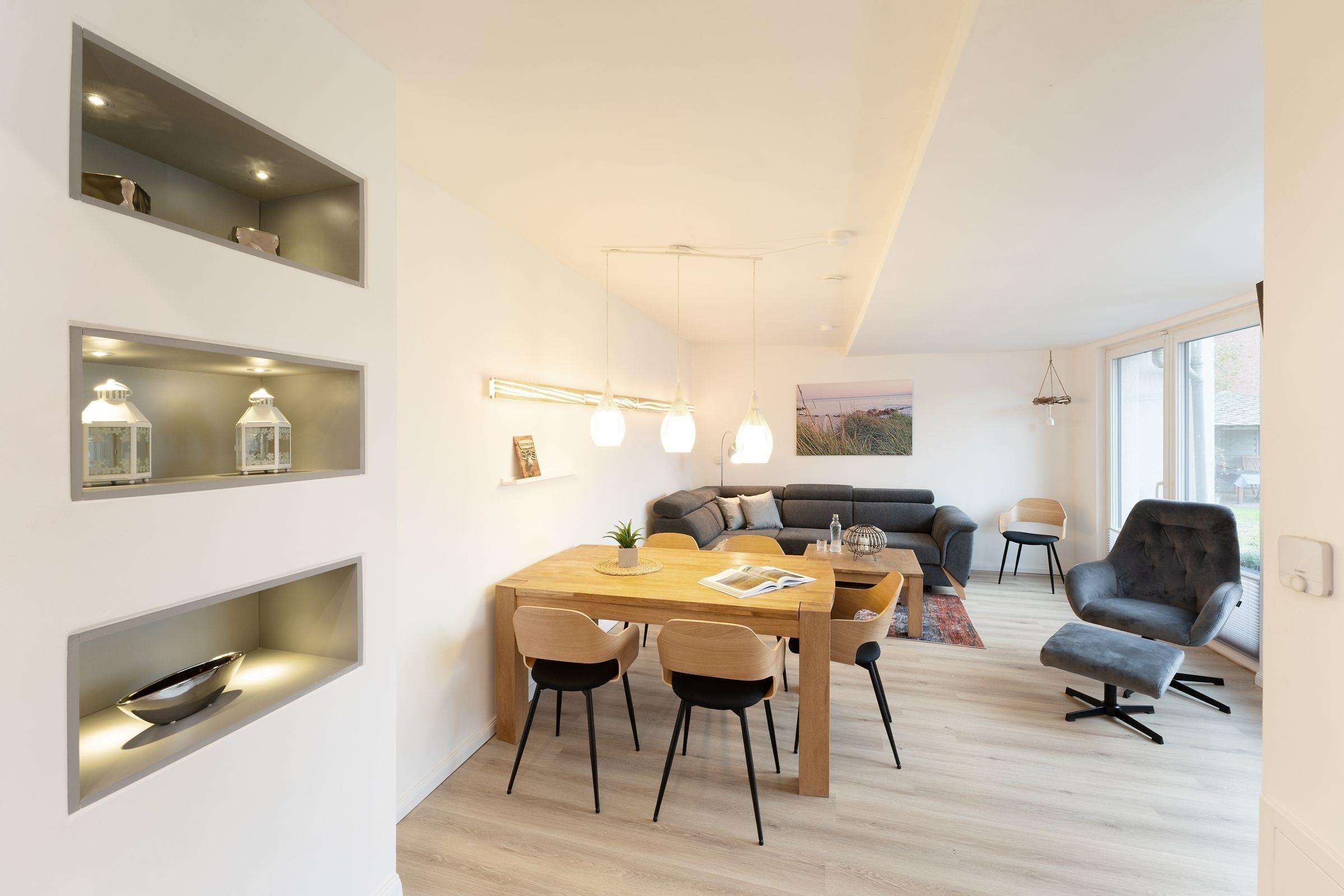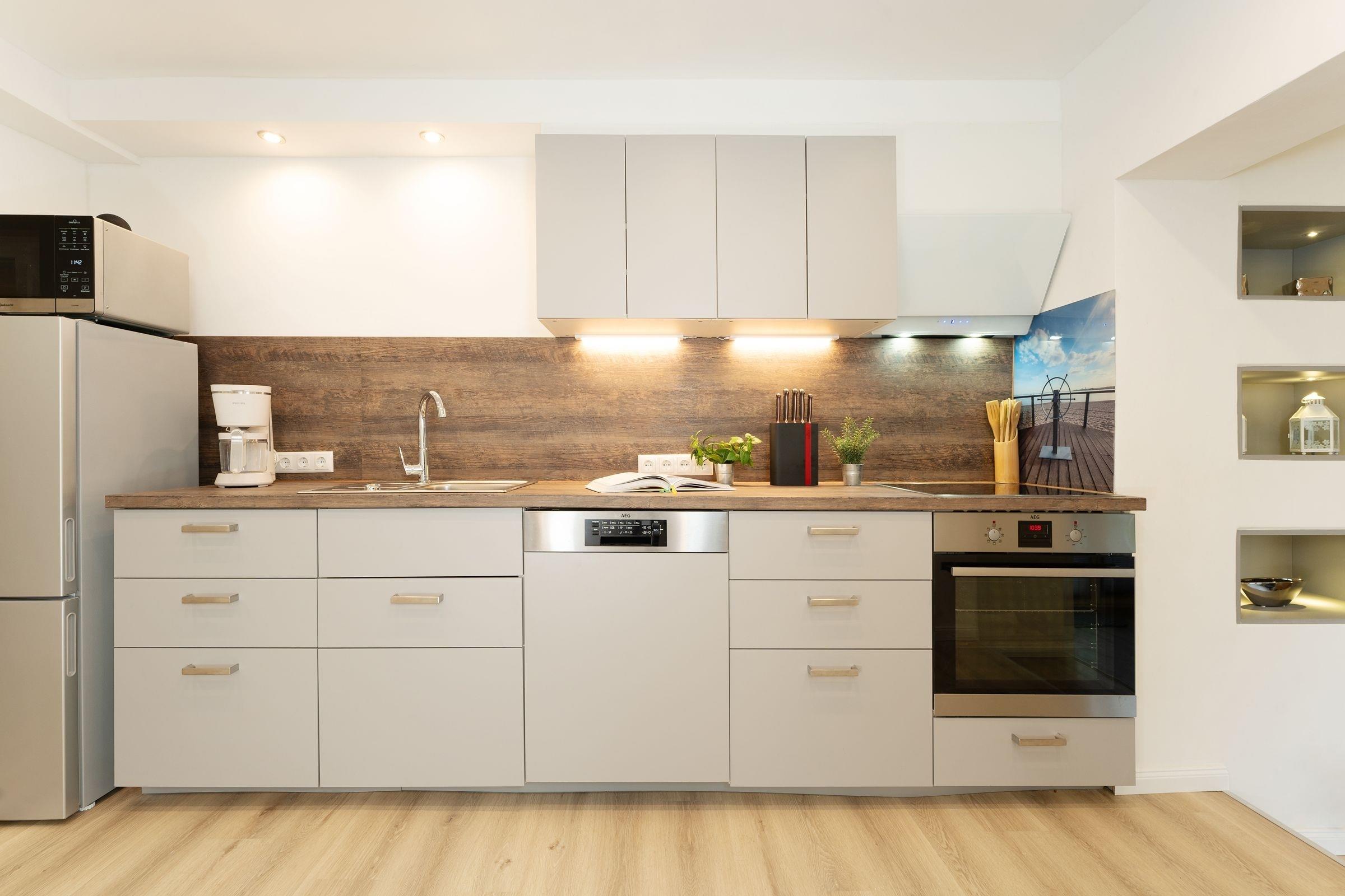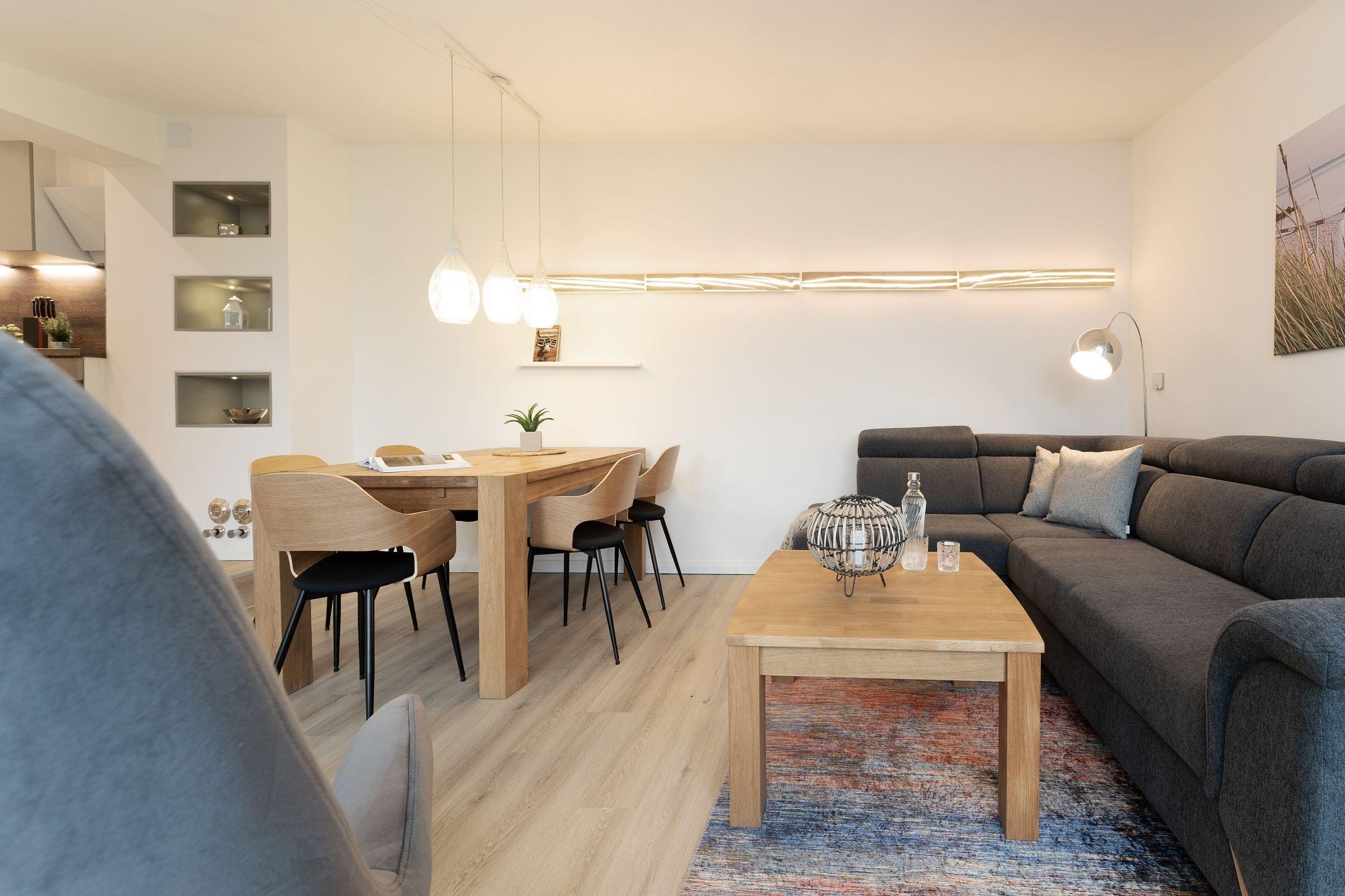 Die offene Küche ist mit Induktionsherd, Backofen, Kühlschrank mit Gefrierfach, Kaffeemaschine und Toaster bestens ausgestattet. Der angrenzende Essbereich bietet Platz für gemeinsame Mahlzeiten.