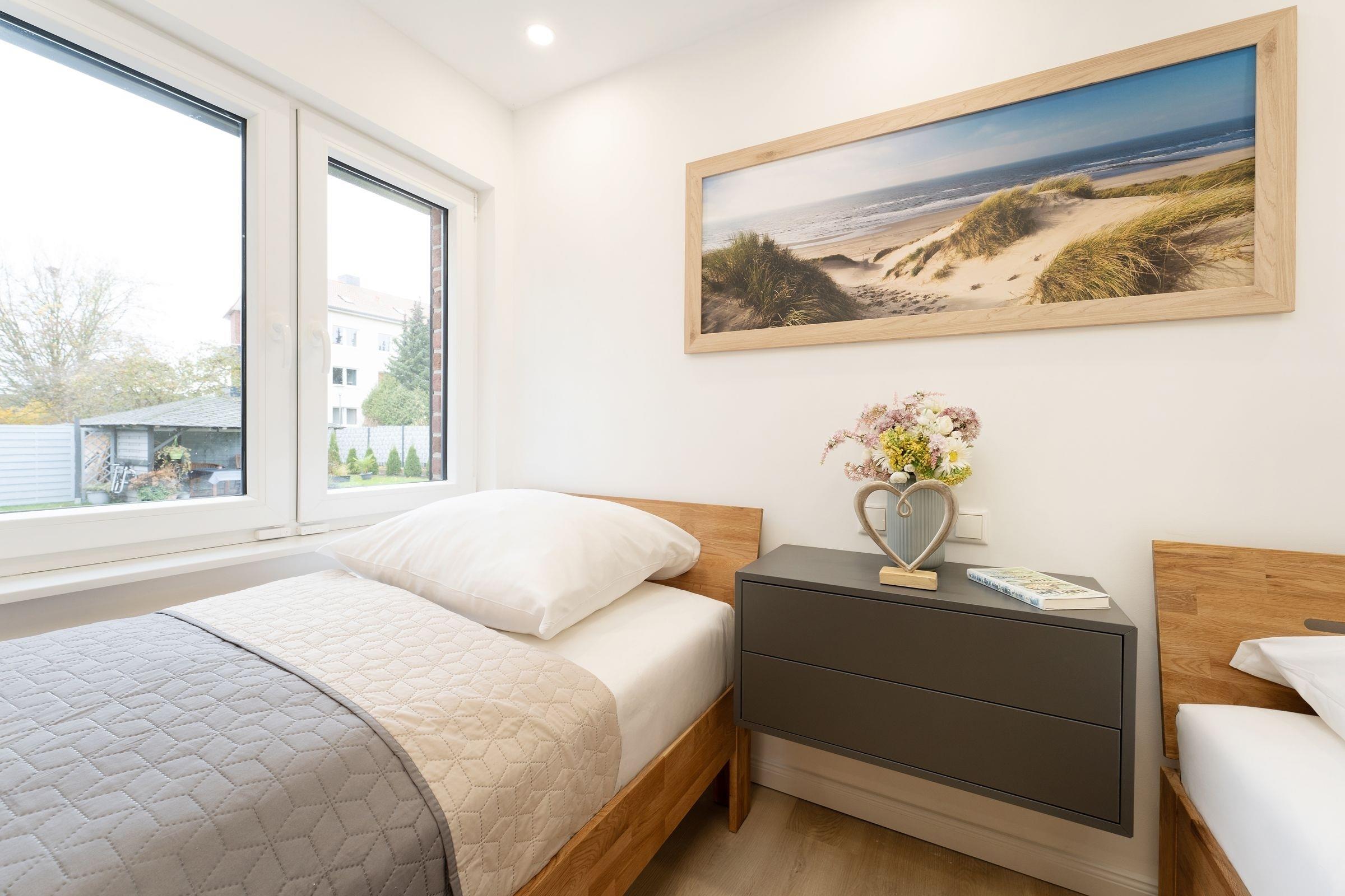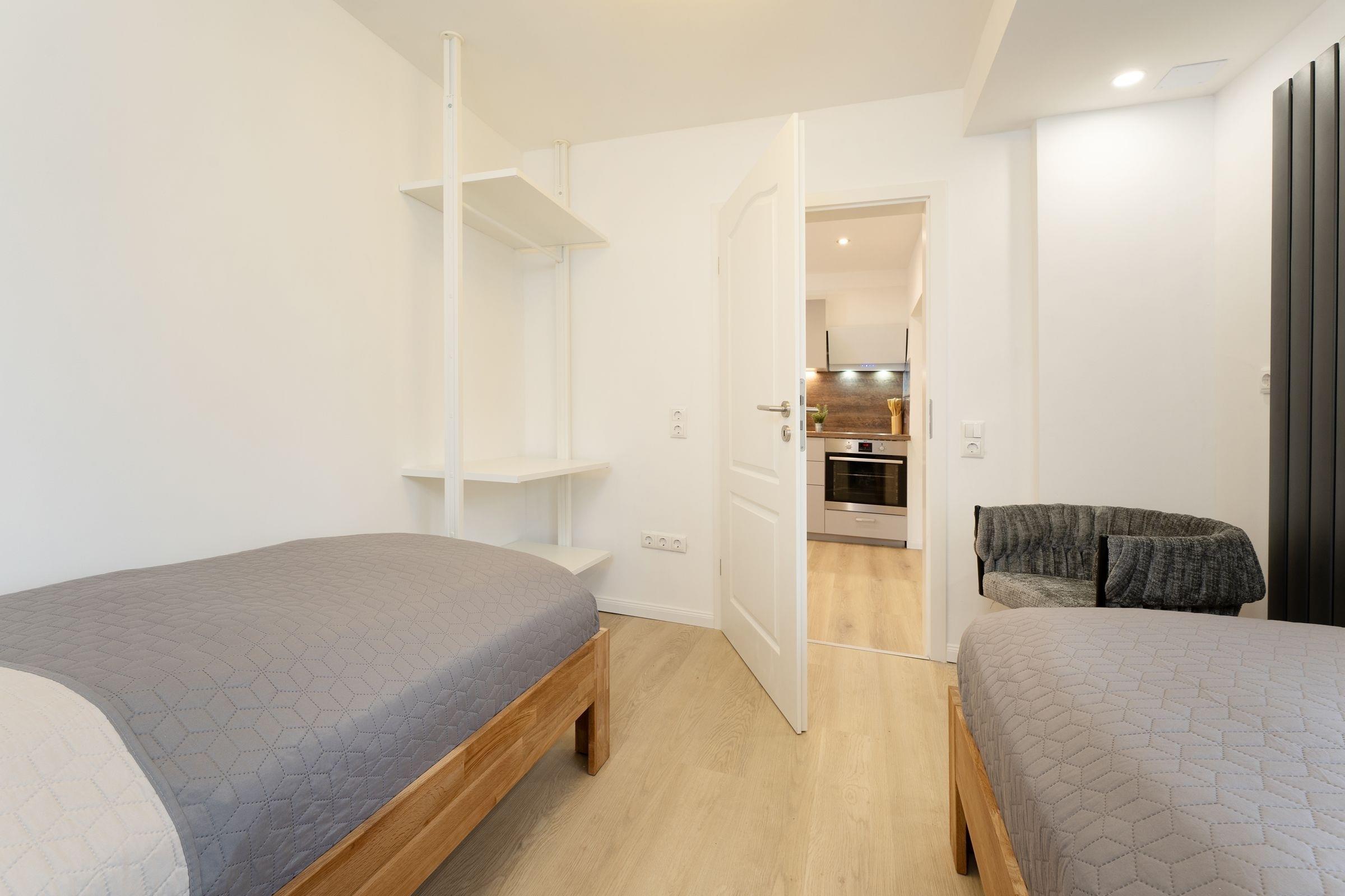 Schlafzimmer 2: 2 Einzelbetten (2x 90x200 cm), Kleiderschrank, Verdunkelung: Außenrollo, kein Platz für Babybett vorhanden