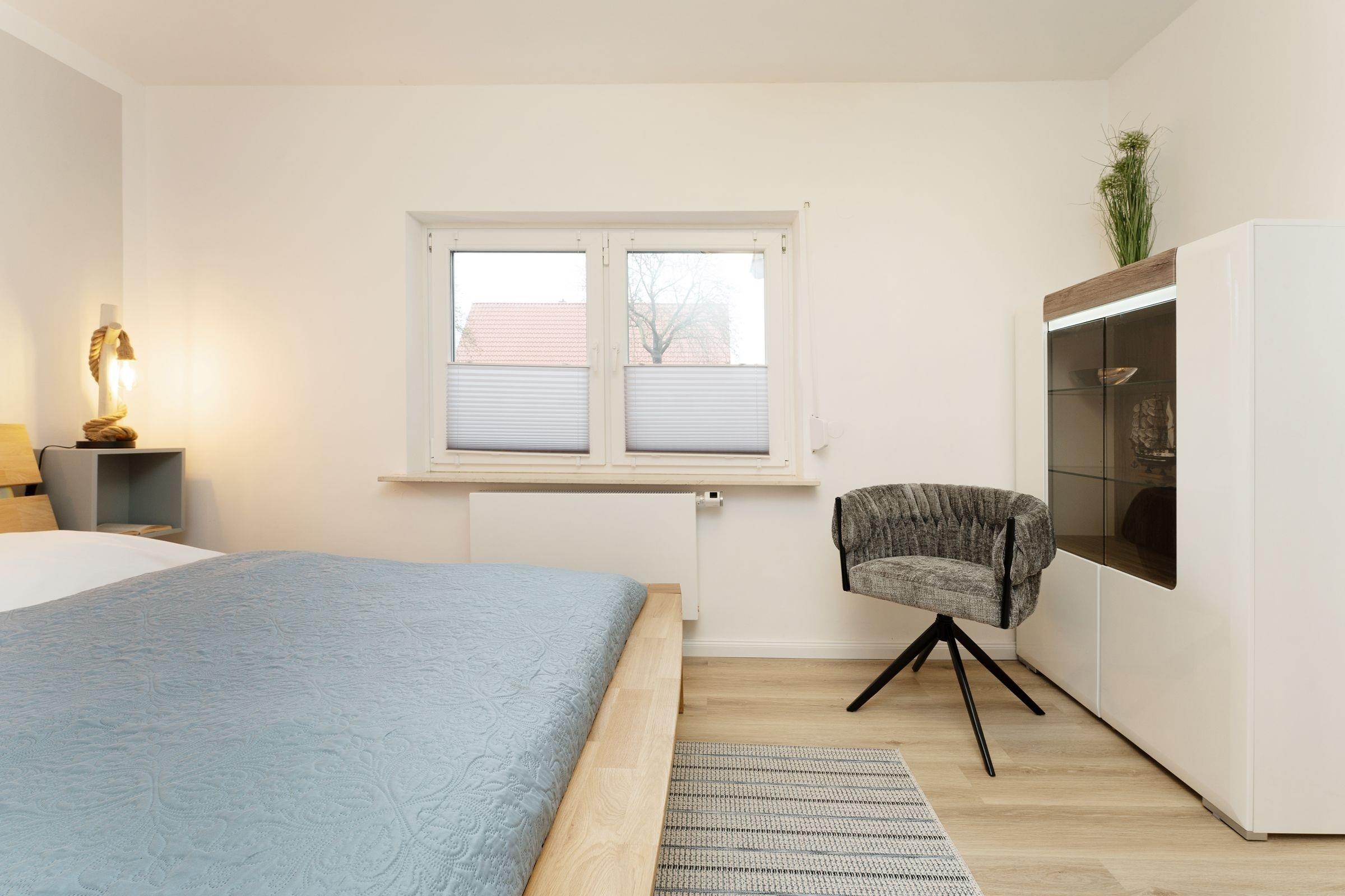 Schlafzimmer 1: 1 Doppelbett (180x200 cm), Kleiderschrank, Verdunkelung: Außenrollo und Plissee, Platz für ein Babybett