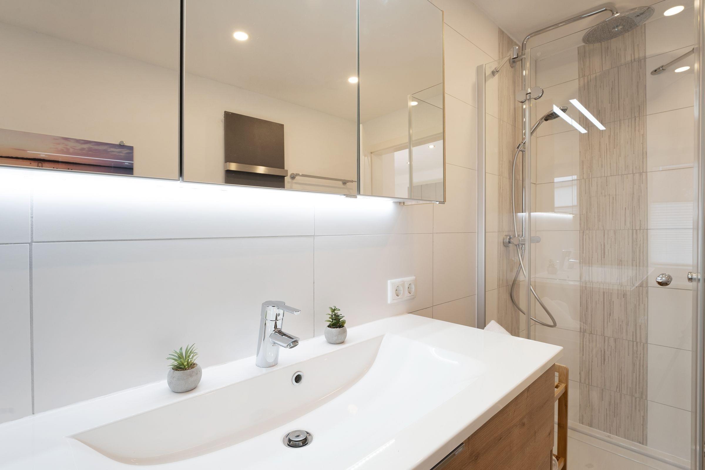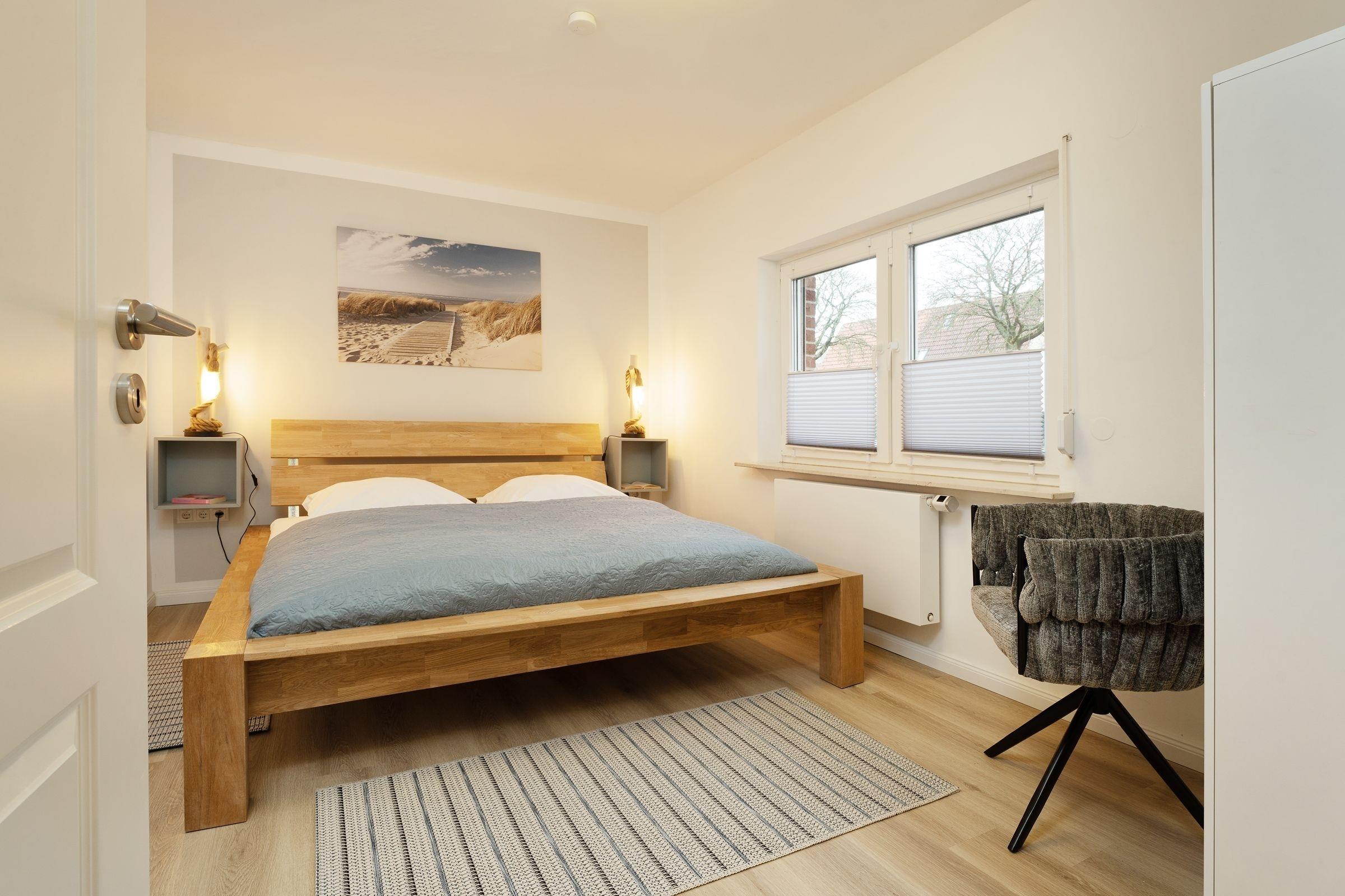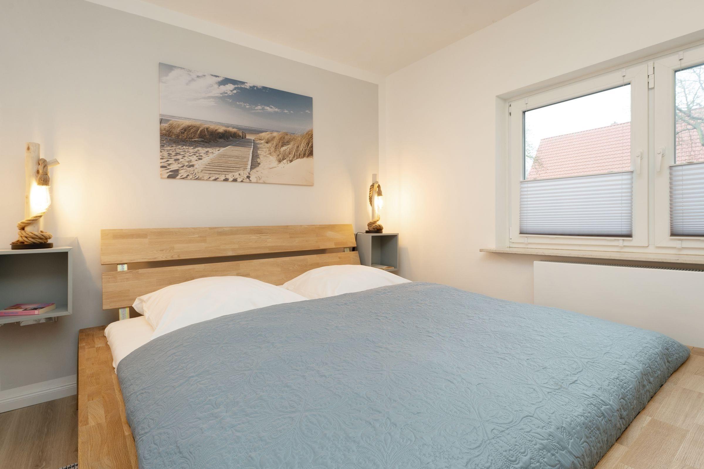Das Haus verfügt über zwei Schlafzimmer: ein Hauptschlafzimmer mit Doppelbett und ein weiteres Zimmer mit Einzelbetten. Beide Zimmer bieten ausreichend Stauraum für Ihre Urlaubsgarderobe. Das moderne Badezimmer ist mit einer Dusche, WC und einem Fenster ausgestattet.