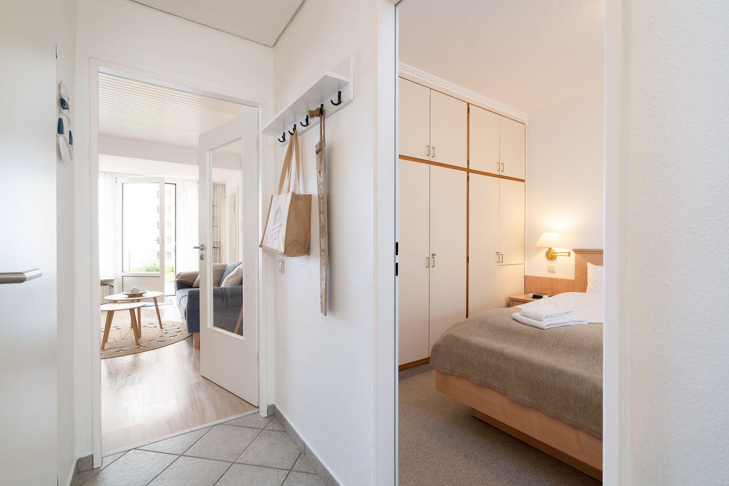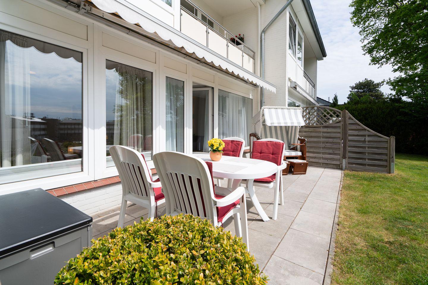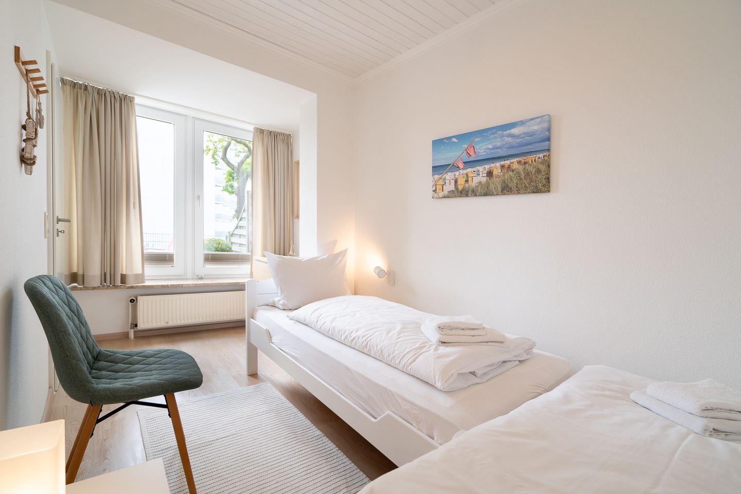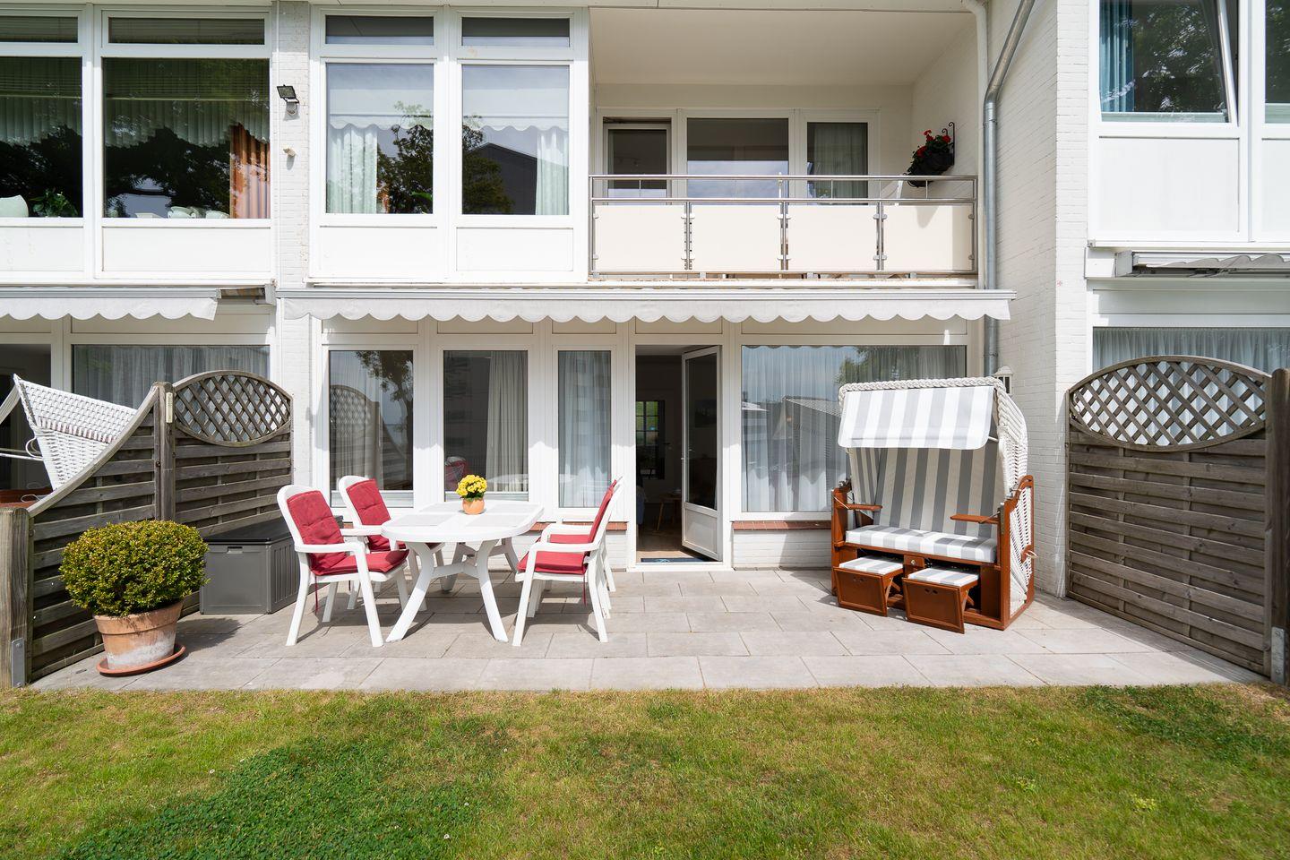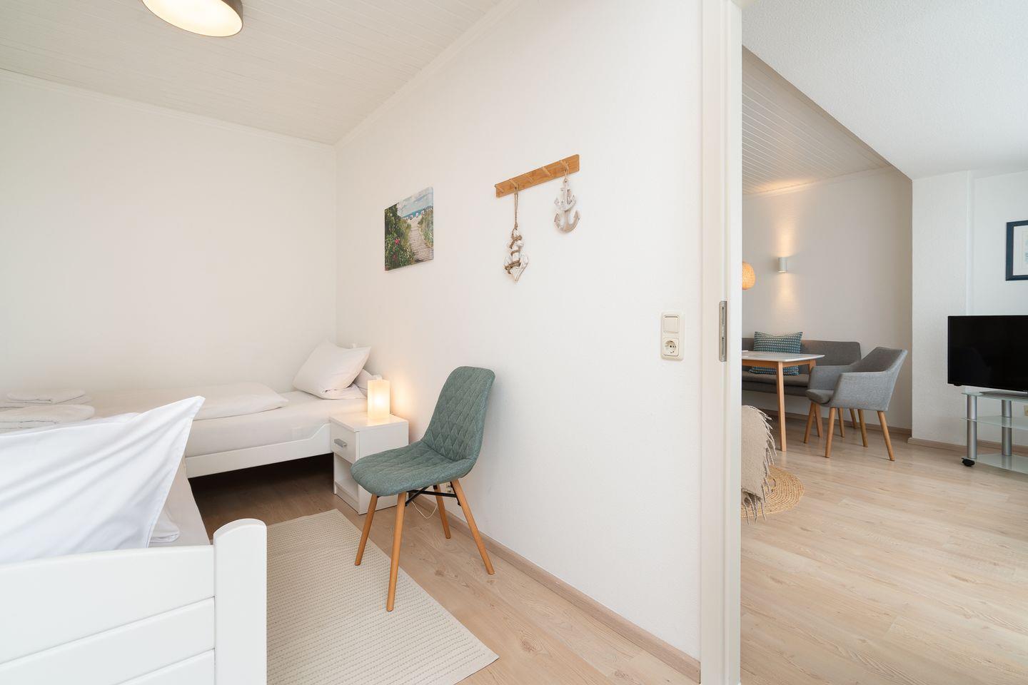 Freuen Sie sich auf eine moderne Küche mit allem Komfort, ein großzügiges Badezimmer, einen gemütlichen Wohnbereich mit bequemer Sitzecke, Essecke und TV sowie zwei liebevoll eingerichtete Schlafzimmer – eines mit Doppelbett, das andere mit zwei Einzelbetten. Das Highlight ist die sonnige Südterrasse mit traumhaftem Meerblick. Von Ostern bis Oktober genießen Sie hier entspannte Stunden im eigenen Strandkorb – begleitet vom Rauschen der Wellen.