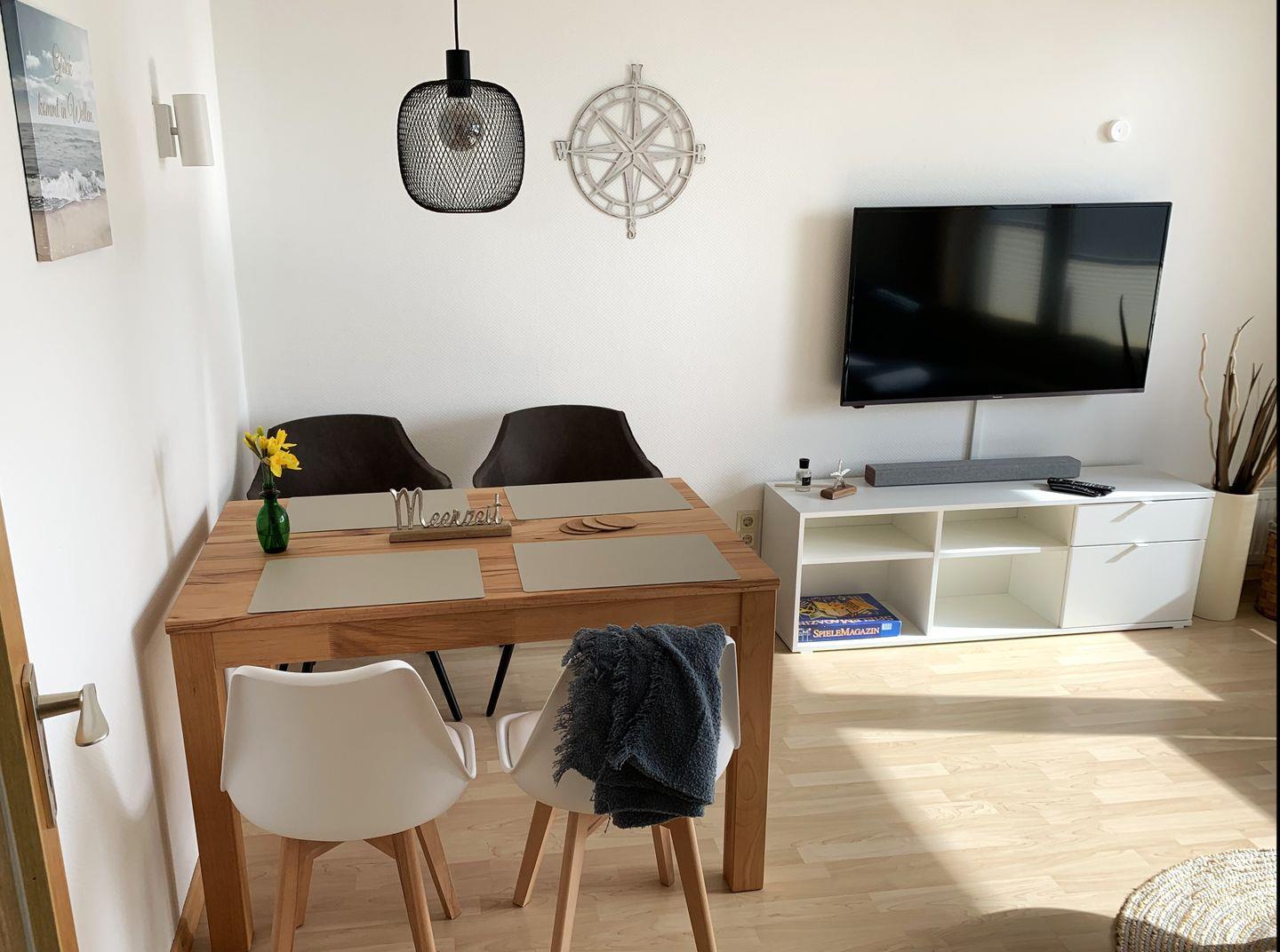Der offene Wohnbereich lädt mit einer bequemen Longchair-Couch, Essplatz, TV und Bluetooth-Lautsprecher zum Entspannen ein. Die voll ausgestattete Küche mit Geschirrspüler macht die Selbstverpflegung zum Kinderspiel.