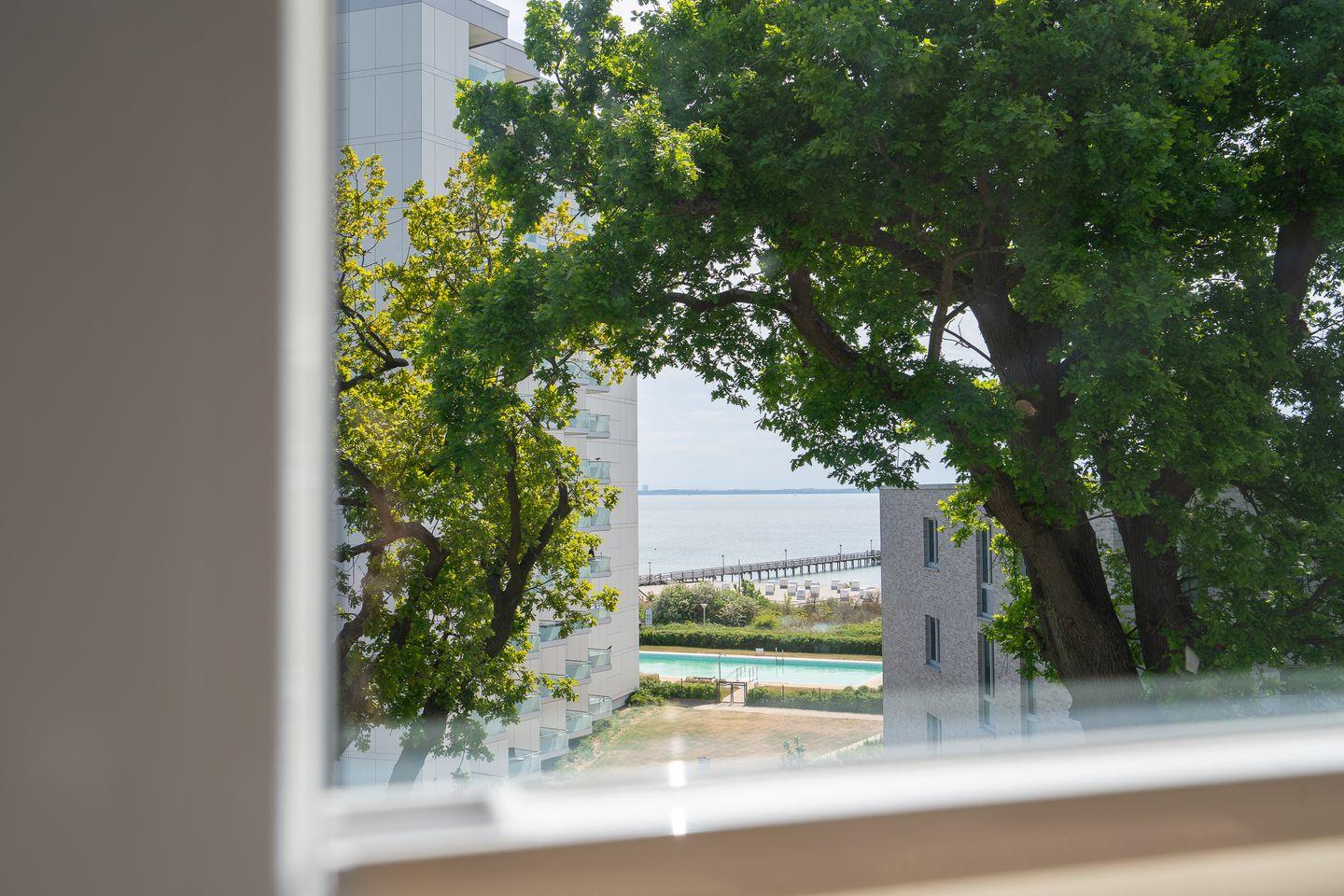 Vom Wohnzimmer aus genießen Sie einen traumhaften Blick auf die Ostsee und die Seebrücke – jeden Tag aufs Neue ein echtes Highlight. Der großzügige Wohnraum lädt mit einer gemütlichen Sitzecke, einem Essbereich und TV zu entspannten Stunden ein.