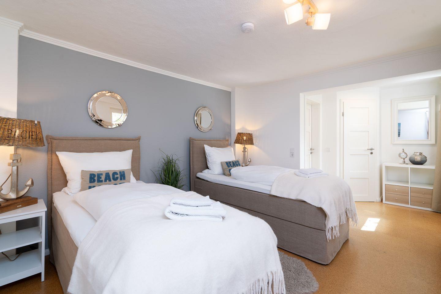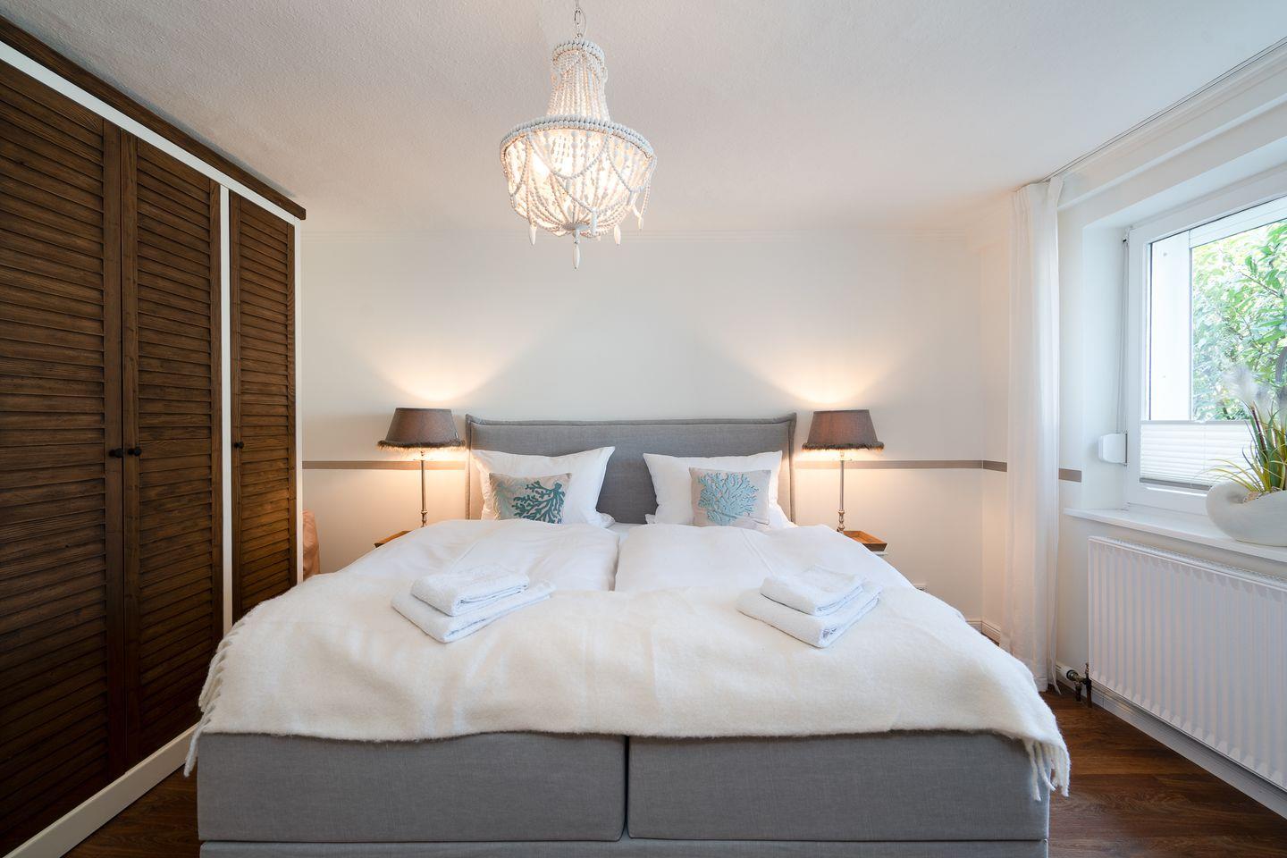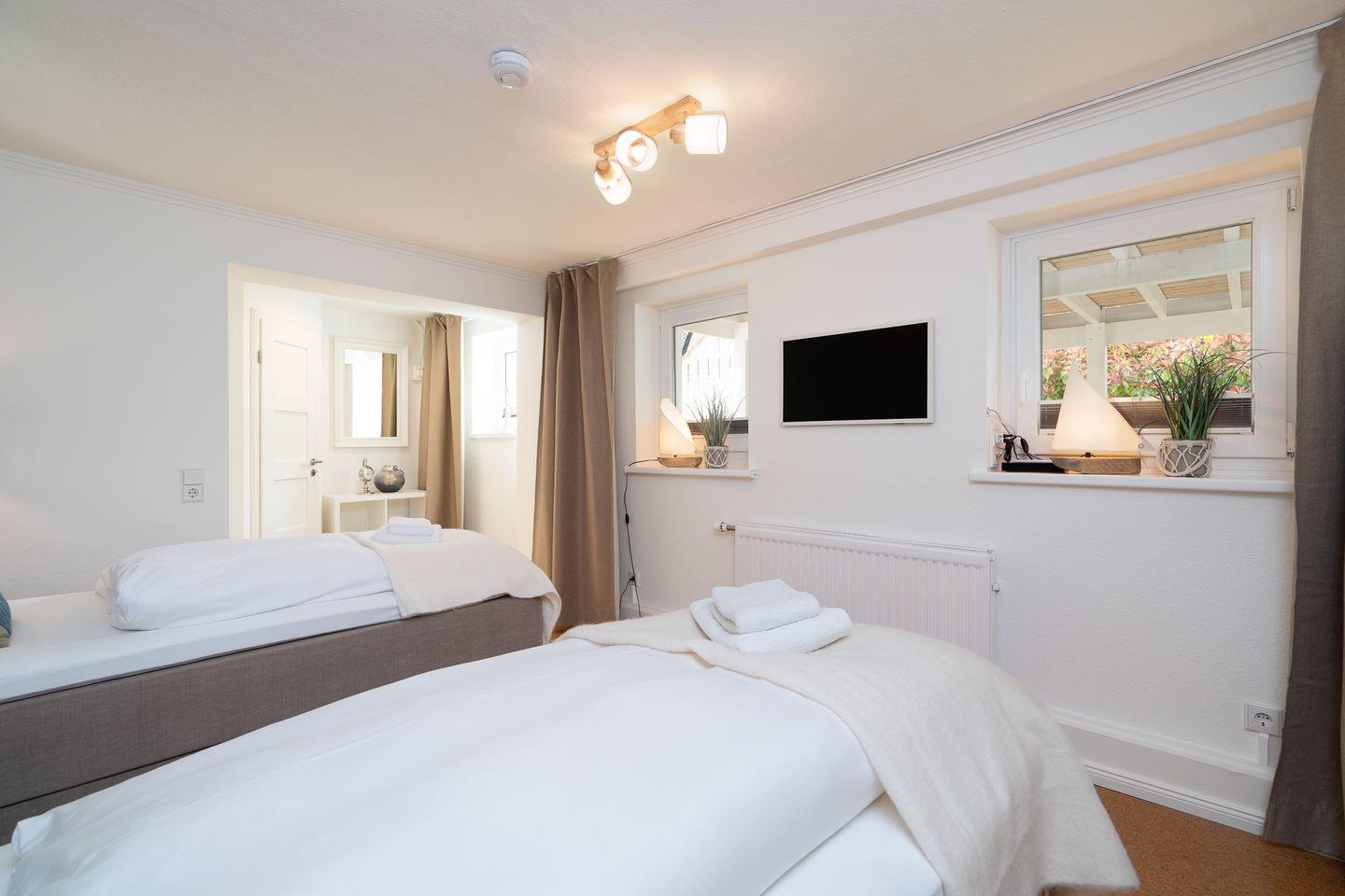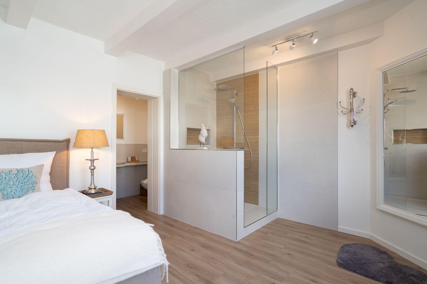 Im Erdgeschoss erwarten Sie drei geschmackvoll eingerichtete Schlafzimmer, alle mit eigenem TV. Zwei davon verfügen über ein komfortables Boxspring-Doppelbett – eines mit direkter Dusche, abgetrennt durch eine Glaswand und separatem WC, das andere mit angrenzendem Badezimmer mit Waschmaschine und Trockner. Das dritte Schlafzimmer bietet zwei Einzel-Boxspringbetten sowie eine praktische Abstellnische.