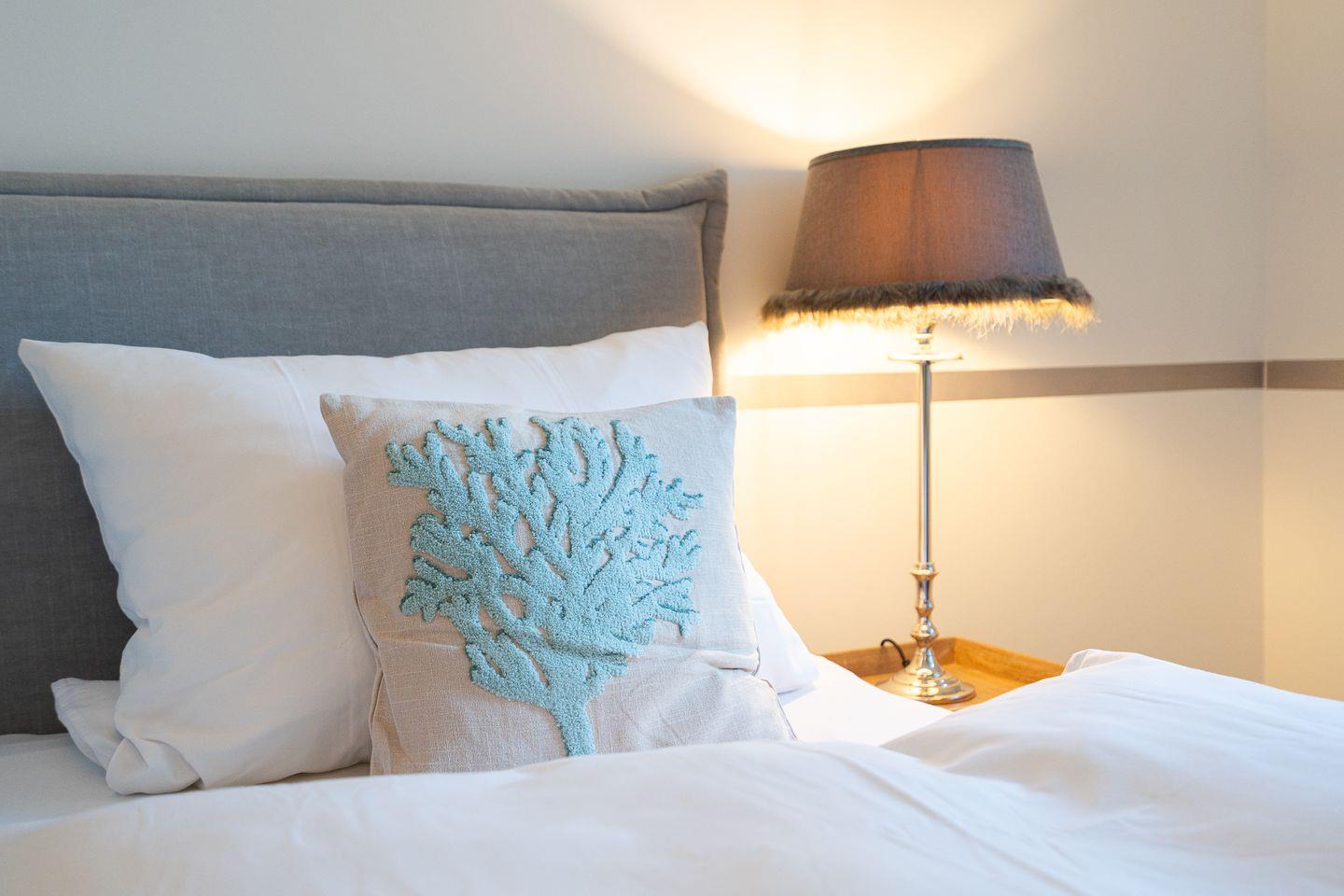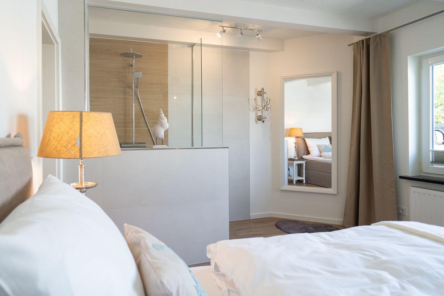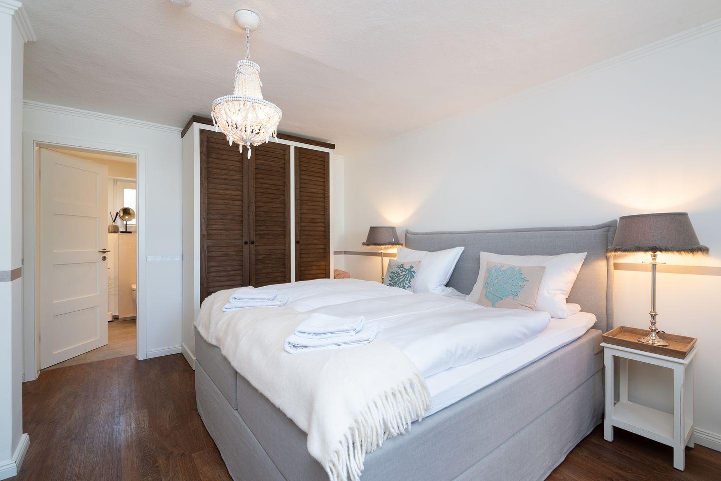 Im Erdgeschoss erwarten Sie drei geschmackvoll eingerichtete Schlafzimmer, alle mit eigenem TV. Zwei davon verfügen über ein komfortables Boxspring-Doppelbett – eines mit direkter Dusche, abgetrennt durch eine Glaswand und separatem WC, das andere mit angrenzendem Badezimmer mit Waschmaschine und Trockner. Das dritte Schlafzimmer bietet zwei Einzel-Boxspringbetten sowie eine praktische Abstellnische.