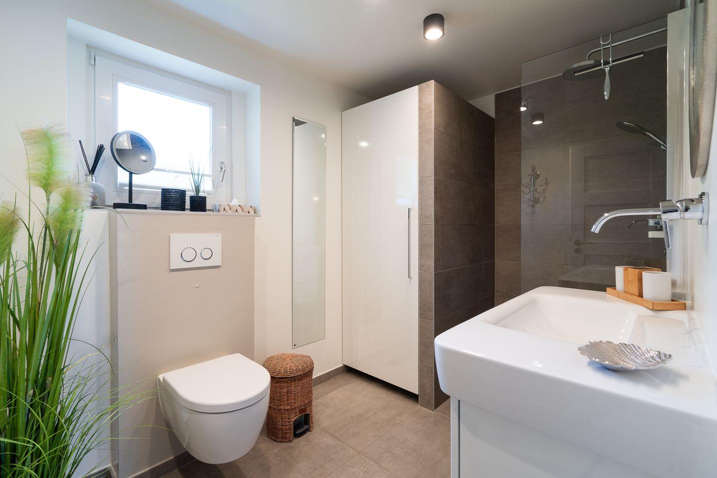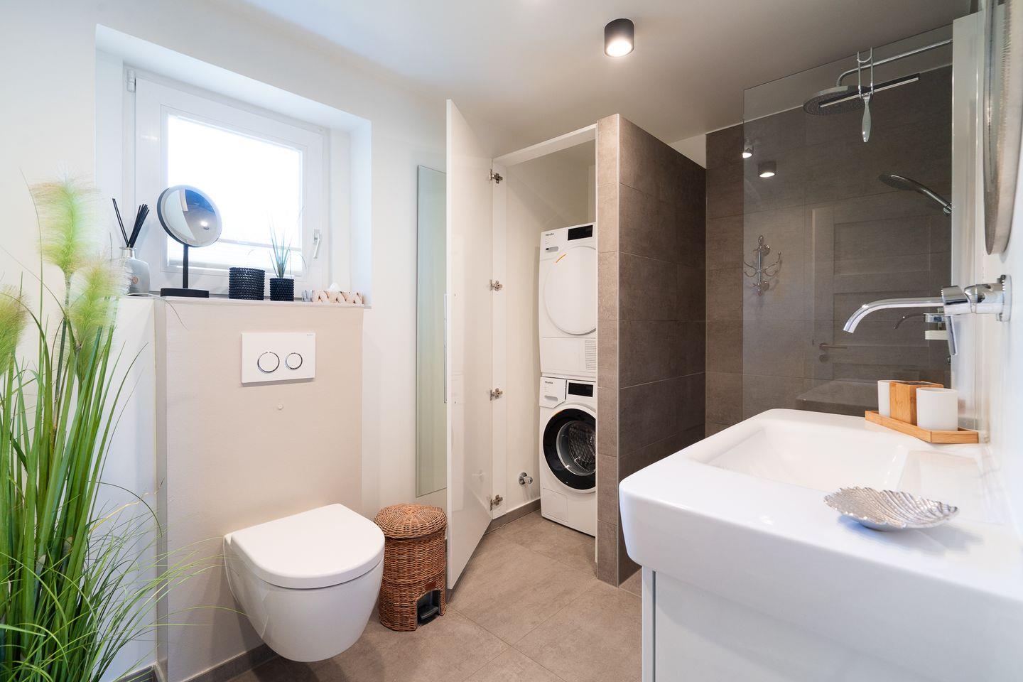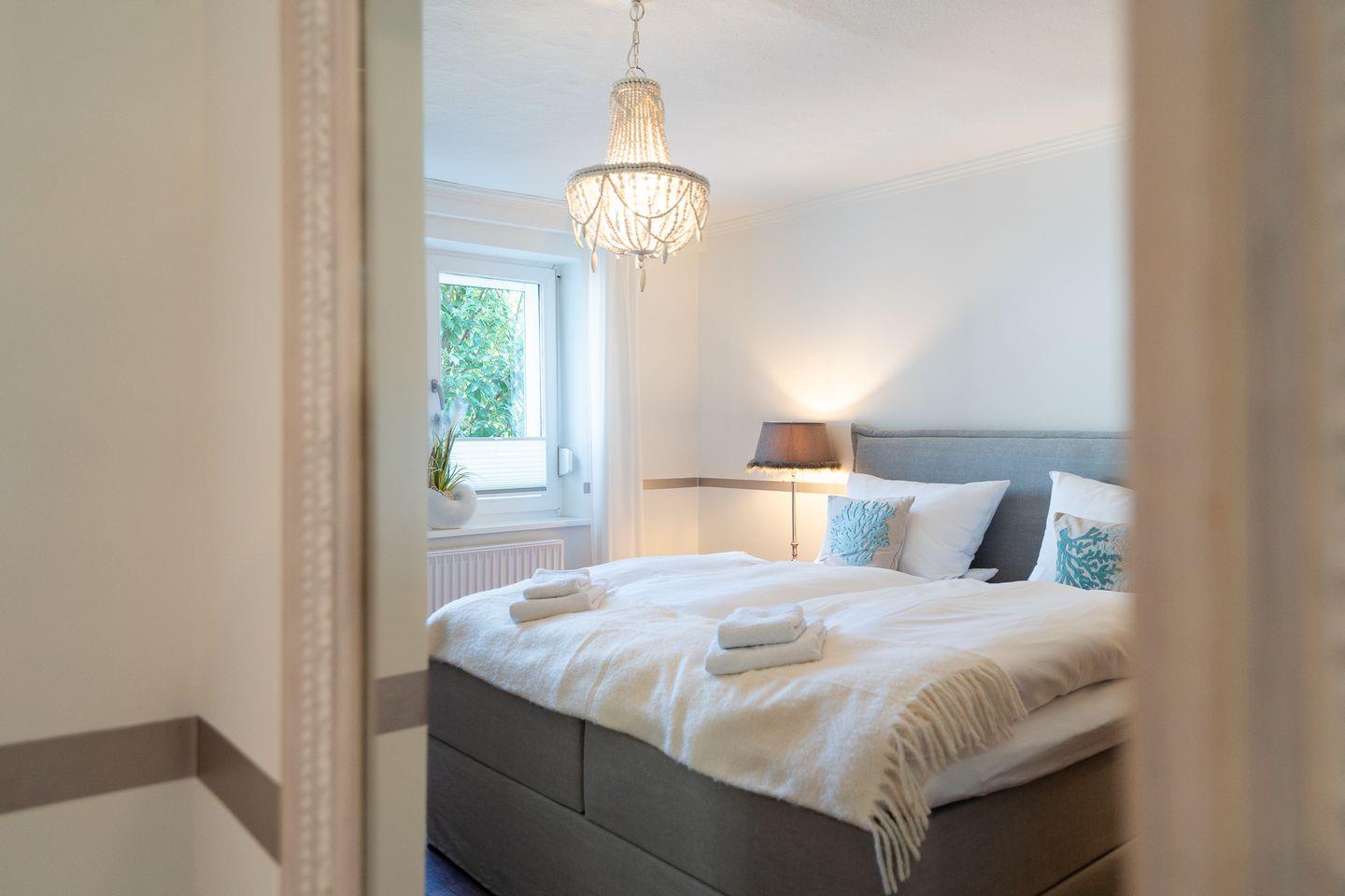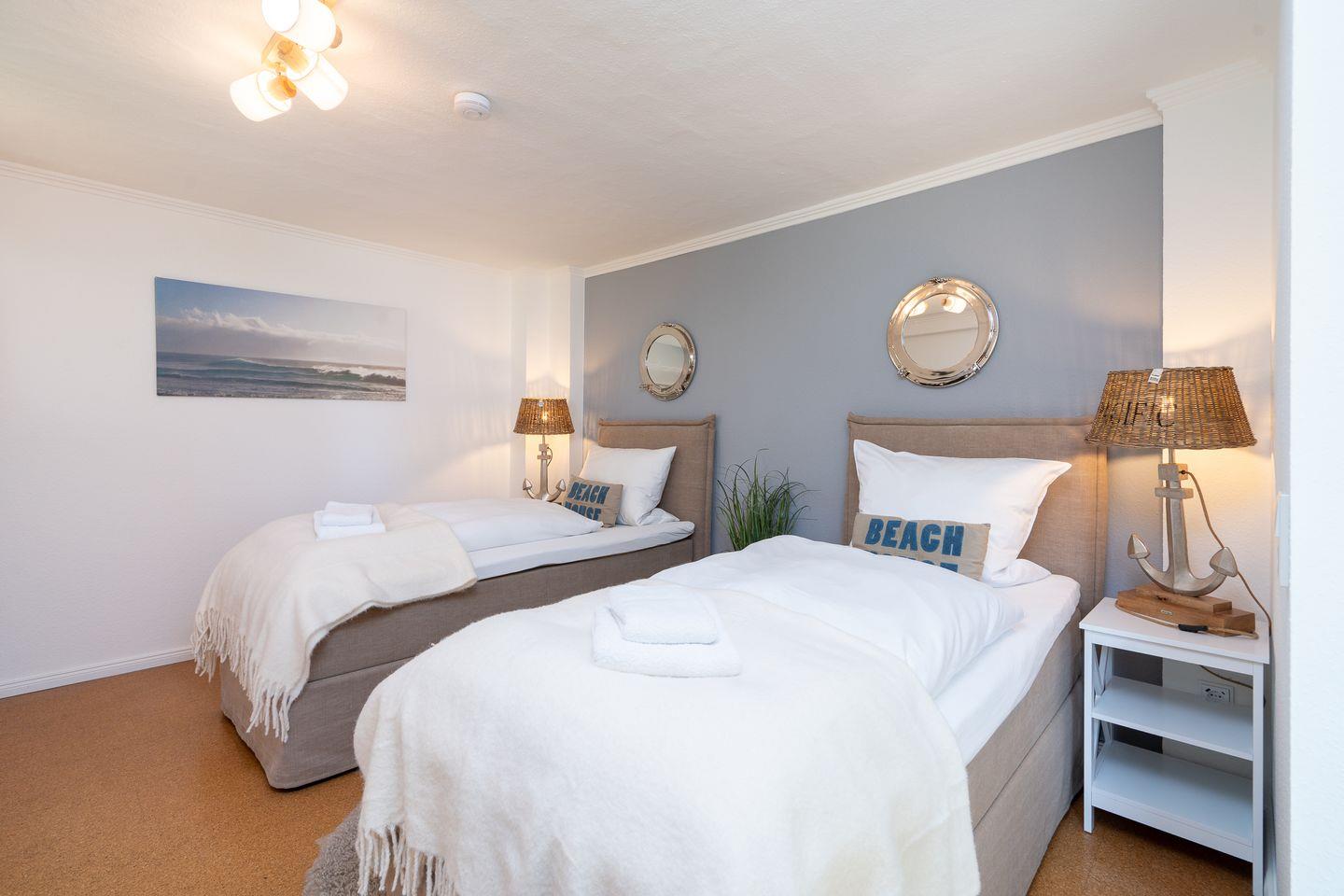 Im Erdgeschoss erwarten Sie drei geschmackvoll eingerichtete Schlafzimmer, alle mit eigenem TV. Zwei davon verfügen über ein komfortables Boxspring-Doppelbett – eines mit direkter Dusche, abgetrennt durch eine Glaswand und separatem WC, das andere mit angrenzendem Badezimmer mit Waschmaschine und Trockner. Das dritte Schlafzimmer bietet zwei Einzel-Boxspringbetten sowie eine praktische Abstellnische.