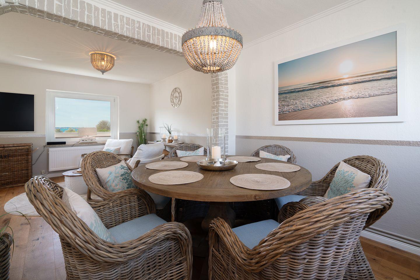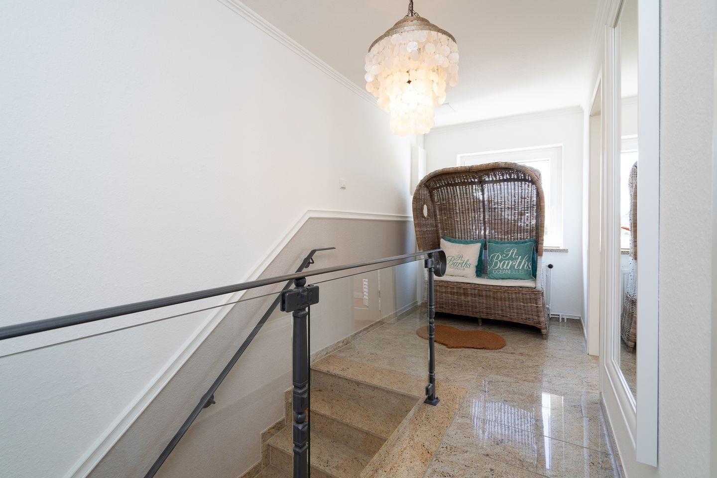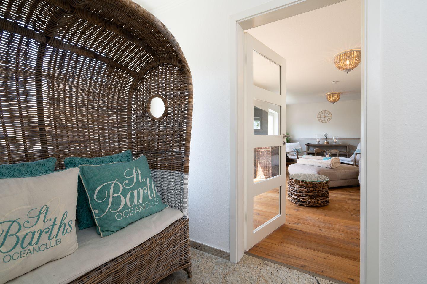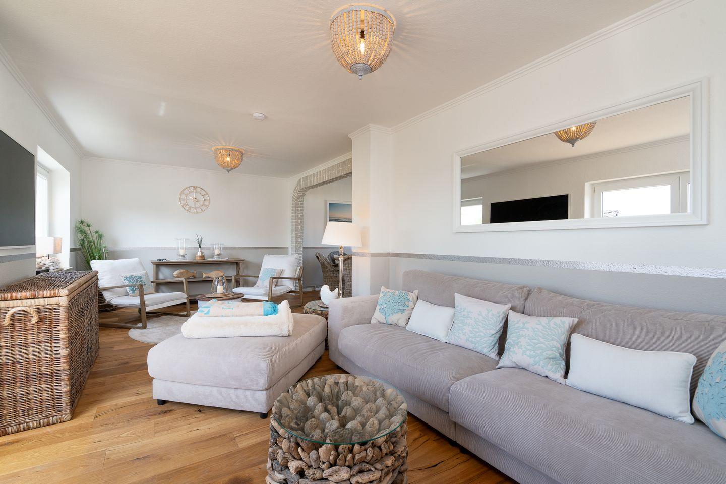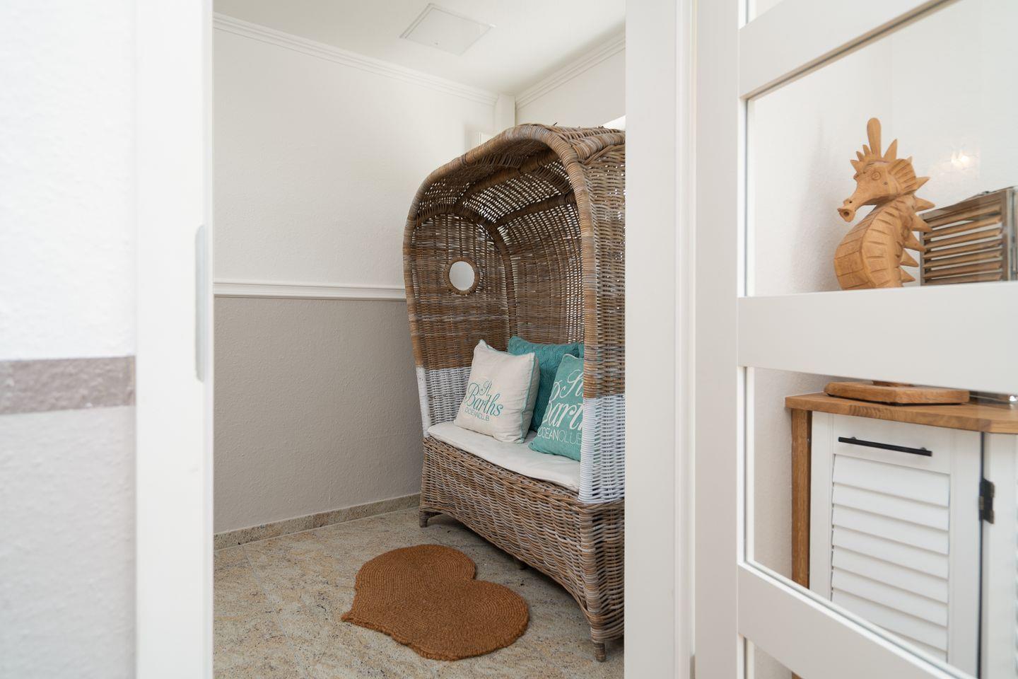 Das Obergeschoss begeistert mit einer stilvollen Chillecke samt Strandkorb sowie einem offenen Wohn- und Essbereich, der durch hochwertige Möbel, eine großzügige Sofaecke, zwei elegante Sessel und einen großen TV überzeugt. Die voll ausgestattete Design-Küche erfüllt höchste Ansprüche und macht das Kochen auch im Urlaub zum Vergnügen. Praktisch: Ein separates Gäste-WC sorgt für zusätzlichen Komfort auf dieser Ebene. Von hier aus gelangen Sie direkt auf die Dachterrasse mit atemberaubendem Meerblick sowie zum Zugang zur Sauna und zum Parkplatz.