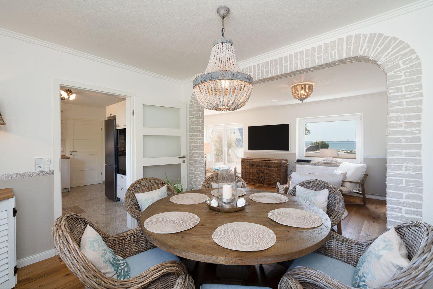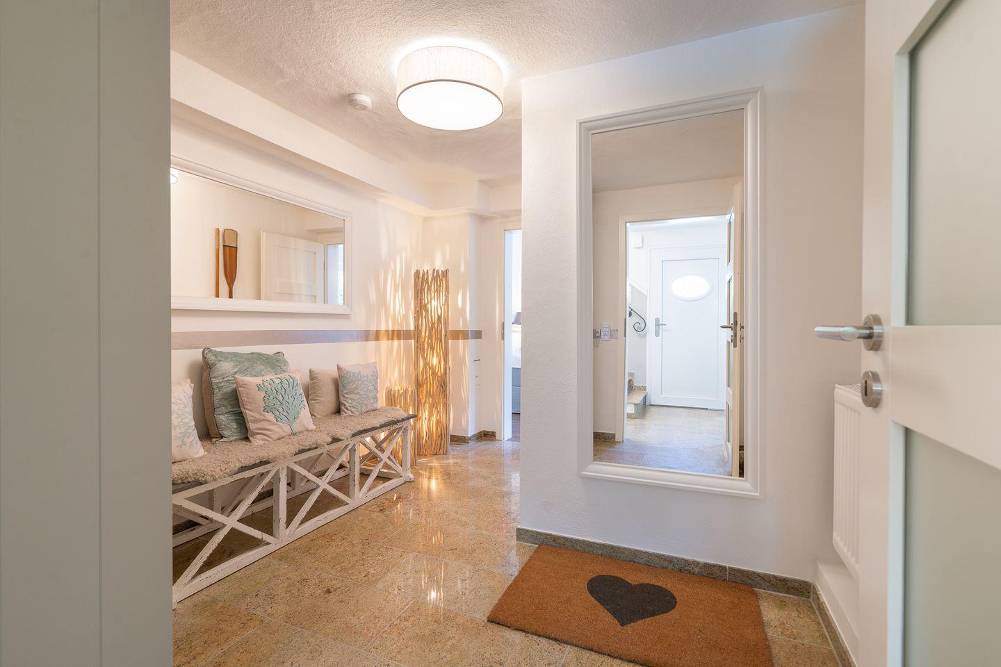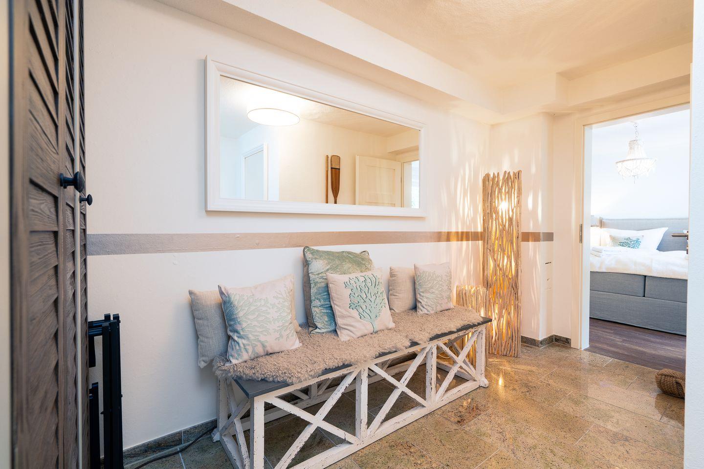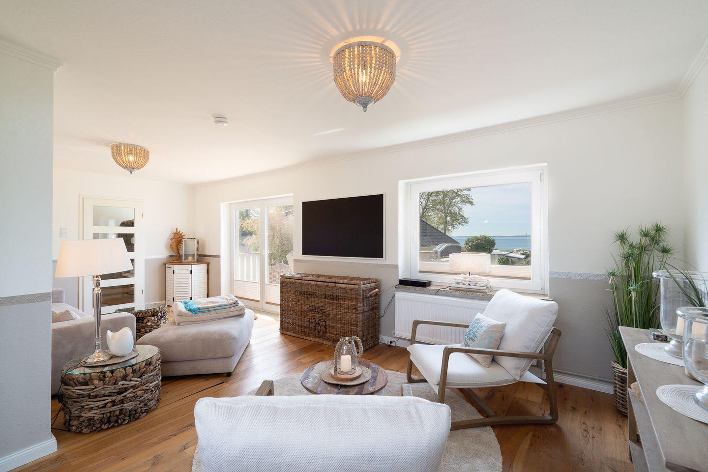 Das Obergeschoss begeistert mit einer stilvollen Chillecke samt Strandkorb sowie einem offenen Wohn- und Essbereich, der durch hochwertige Möbel, eine großzügige Sofaecke, zwei elegante Sessel und einen großen TV überzeugt. Die voll ausgestattete Design-Küche erfüllt höchste Ansprüche und macht das Kochen auch im Urlaub zum Vergnügen. Praktisch: Ein separates Gäste-WC sorgt für zusätzlichen Komfort auf dieser Ebene. Von hier aus gelangen Sie direkt auf die Dachterrasse mit atemberaubendem Meerblick sowie zum Zugang zur Sauna und zum Parkplatz.