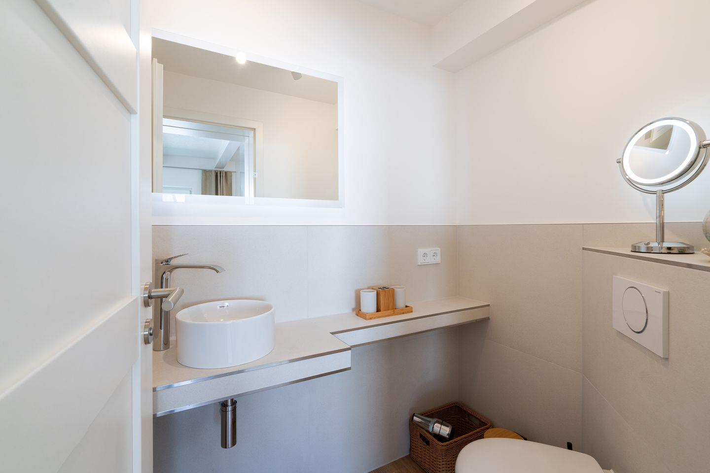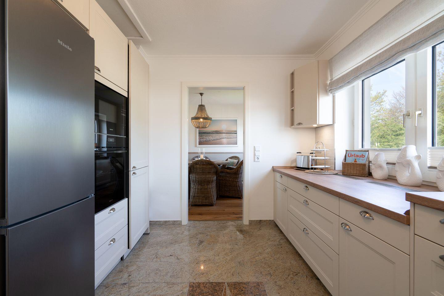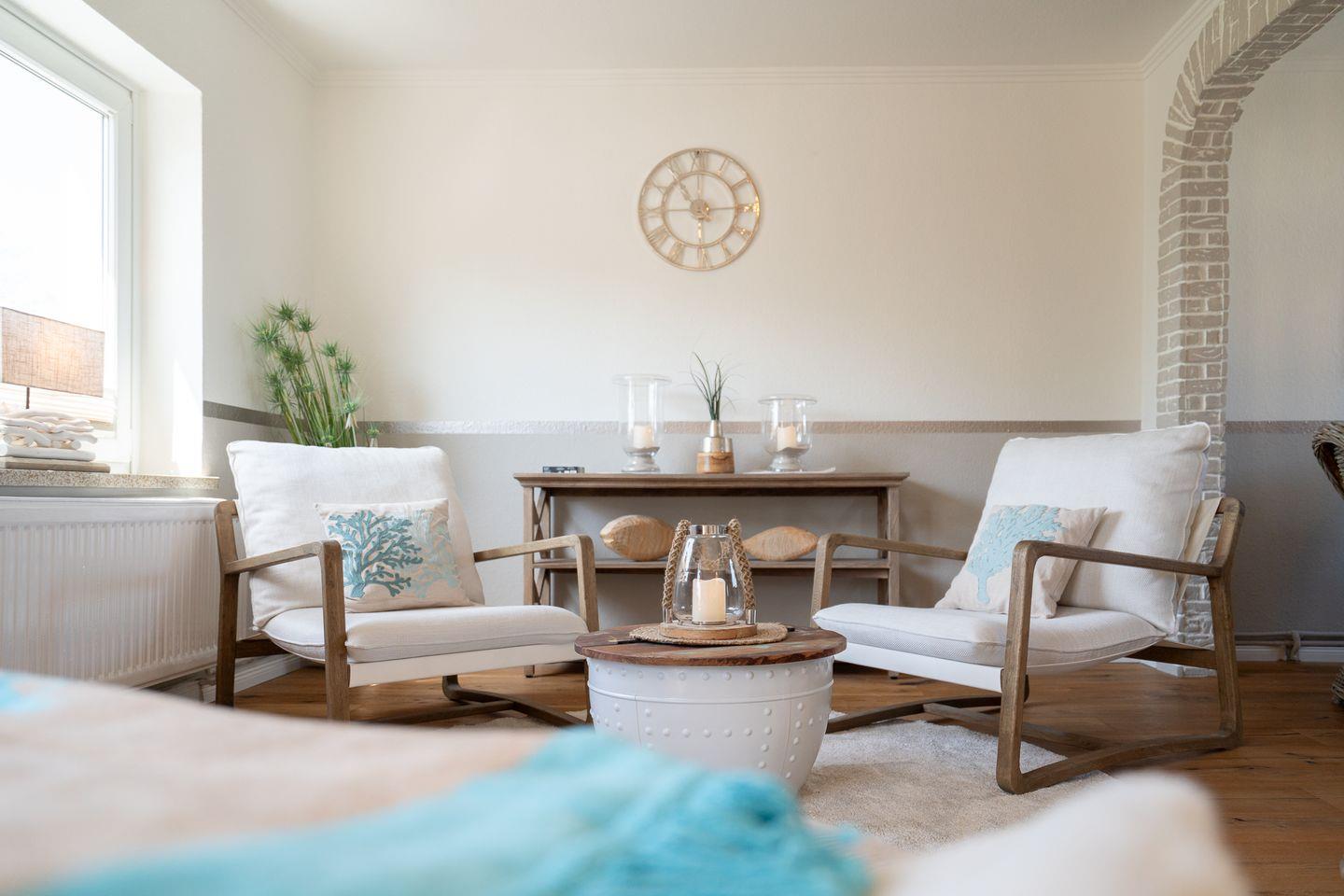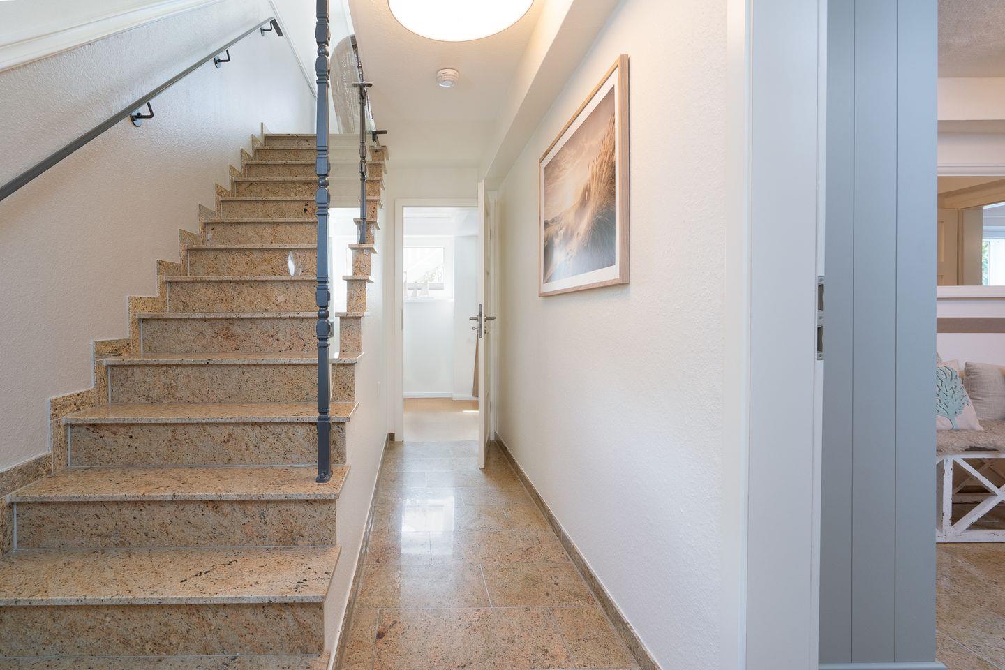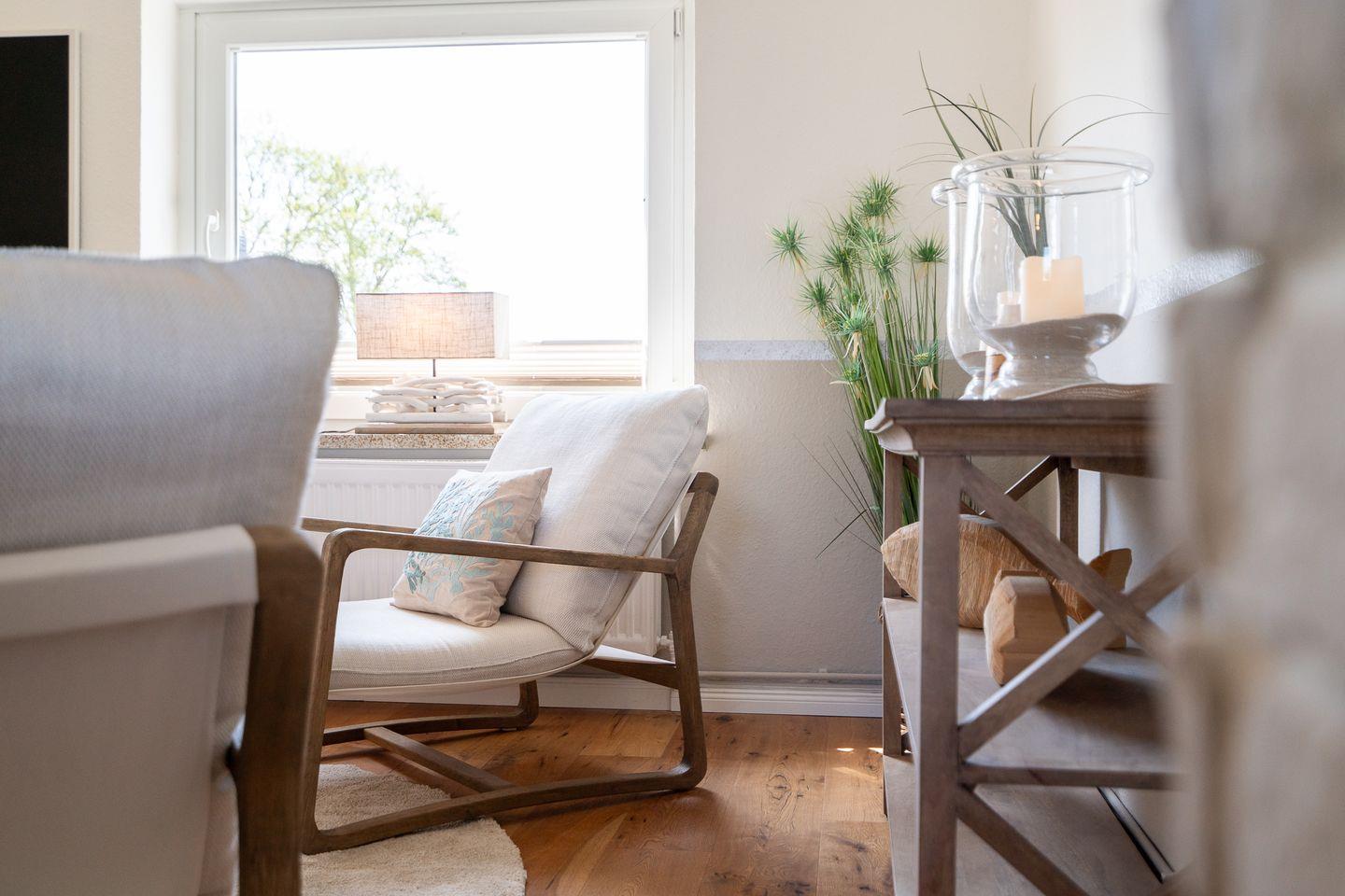 Das Obergeschoss begeistert mit einer stilvollen Chillecke samt Strandkorb sowie einem offenen Wohn- und Essbereich, der durch hochwertige Möbel, eine großzügige Sofaecke, zwei elegante Sessel und einen großen TV überzeugt. Die voll ausgestattete Design-Küche erfüllt höchste Ansprüche und macht das Kochen auch im Urlaub zum Vergnügen. Praktisch: Ein separates Gäste-WC sorgt für zusätzlichen Komfort auf dieser Ebene. Von hier aus gelangen Sie direkt auf die Dachterrasse mit atemberaubendem Meerblick sowie zum Zugang zur Sauna und zum Parkplatz.