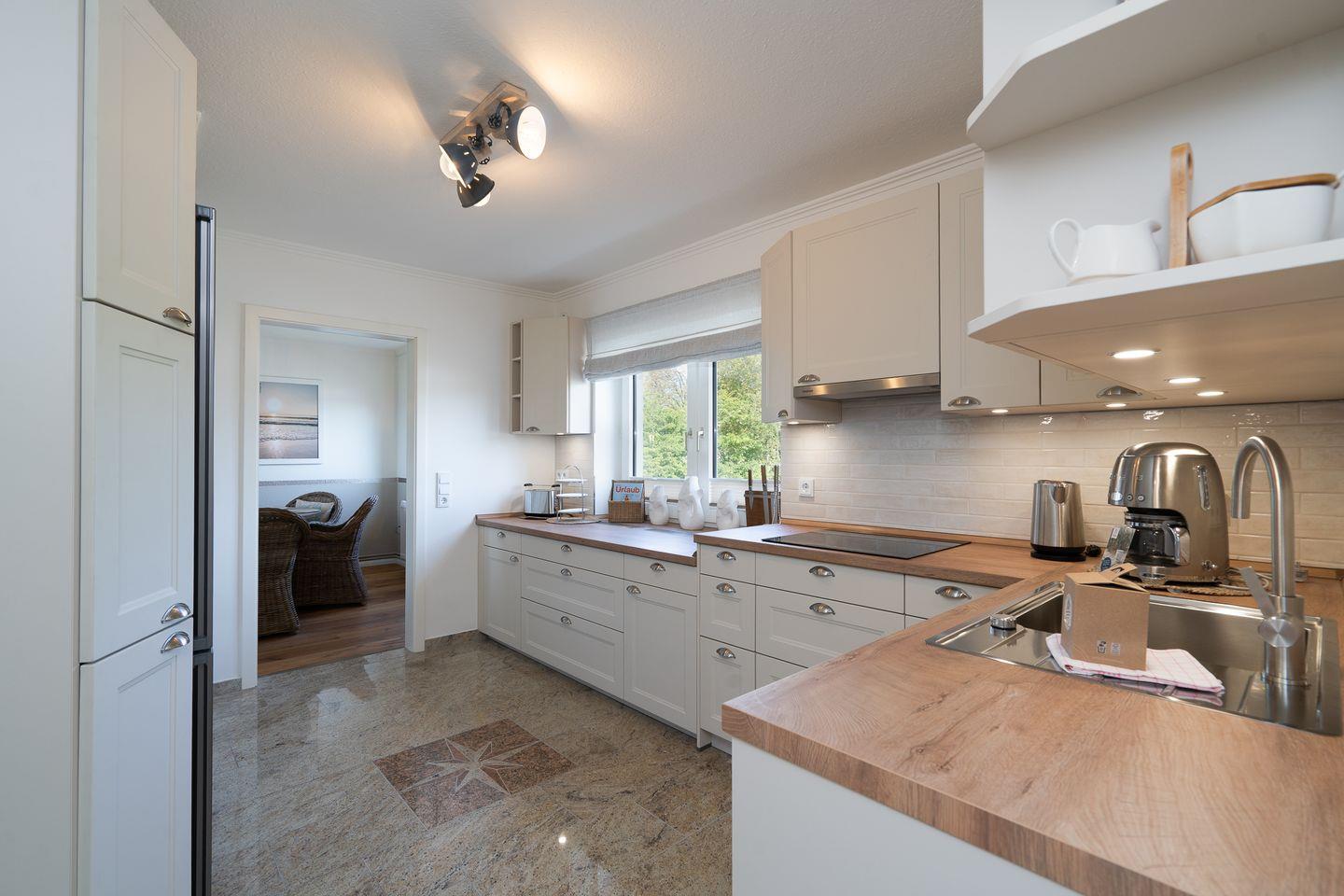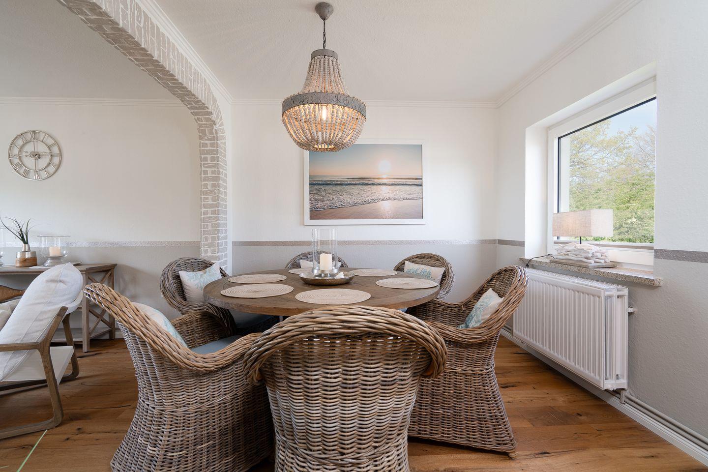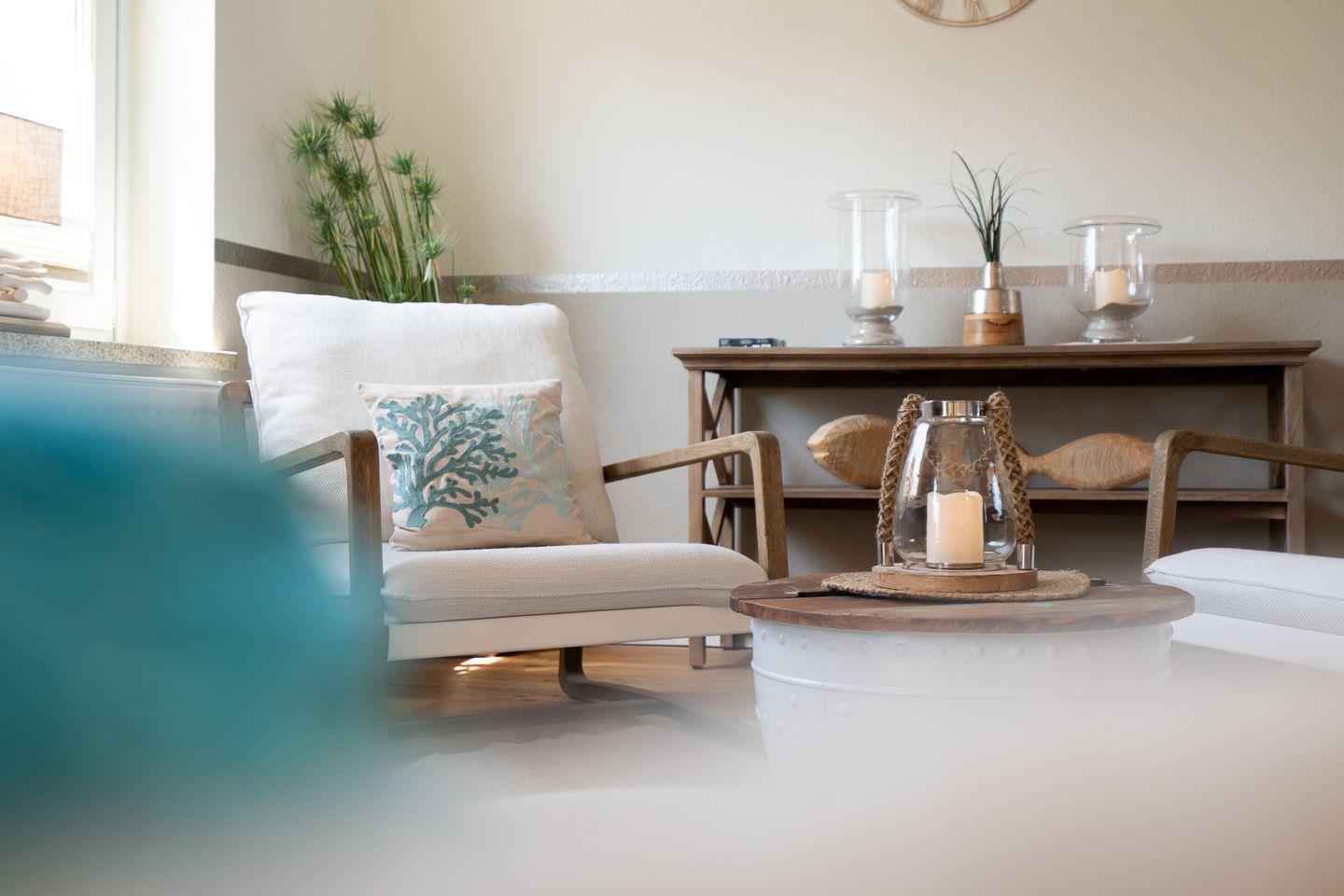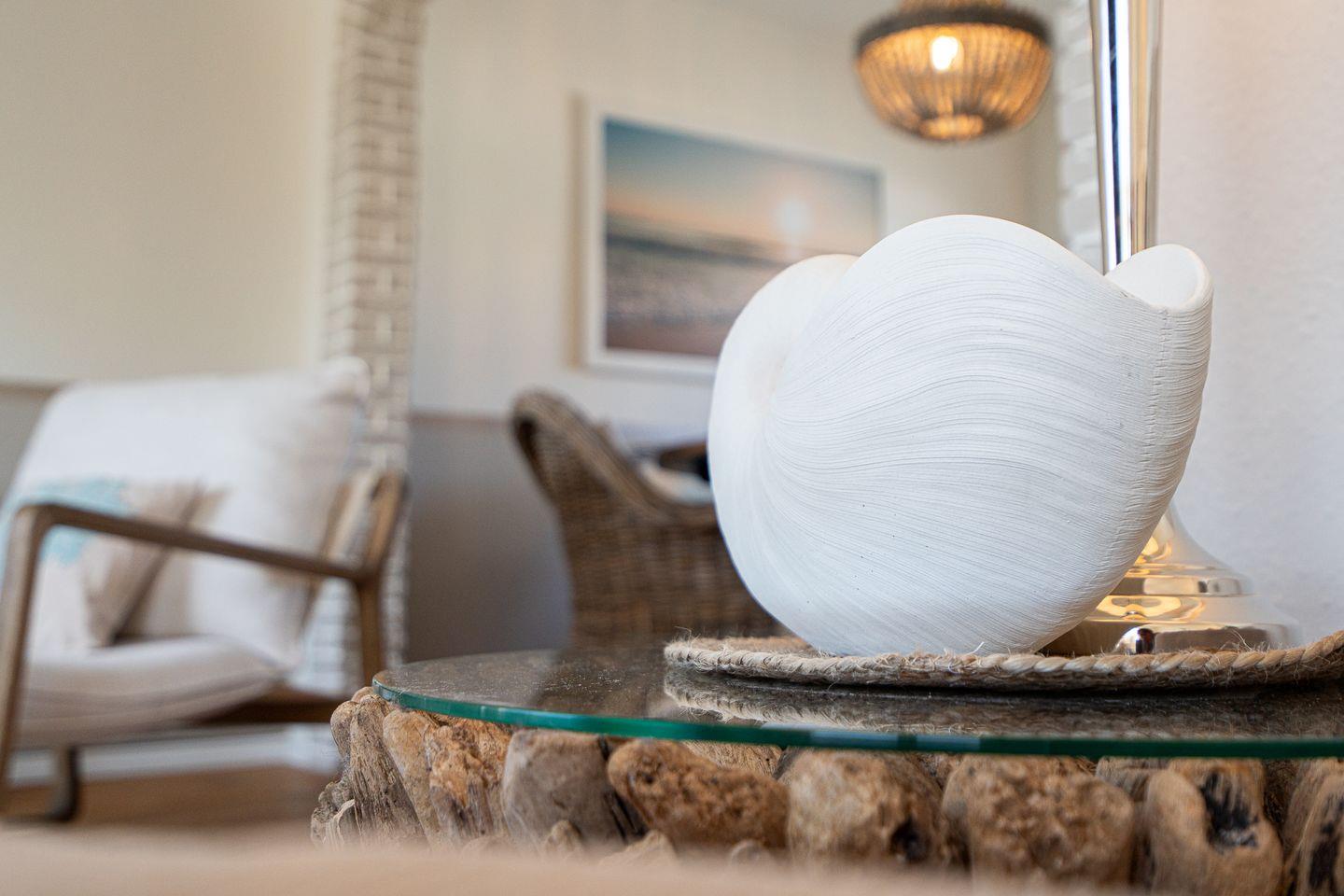 Das Obergeschoss begeistert mit einer stilvollen Chillecke samt Strandkorb sowie einem offenen Wohn- und Essbereich, der durch hochwertige Möbel, eine großzügige Sofaecke, zwei elegante Sessel und einen großen TV überzeugt. Die voll ausgestattete Design-Küche erfüllt höchste Ansprüche und macht das Kochen auch im Urlaub zum Vergnügen. Praktisch: Ein separates Gäste-WC sorgt für zusätzlichen Komfort auf dieser Ebene. Von hier aus gelangen Sie direkt auf die Dachterrasse mit atemberaubendem Meerblick sowie zum Zugang zur Sauna und zum Parkplatz.