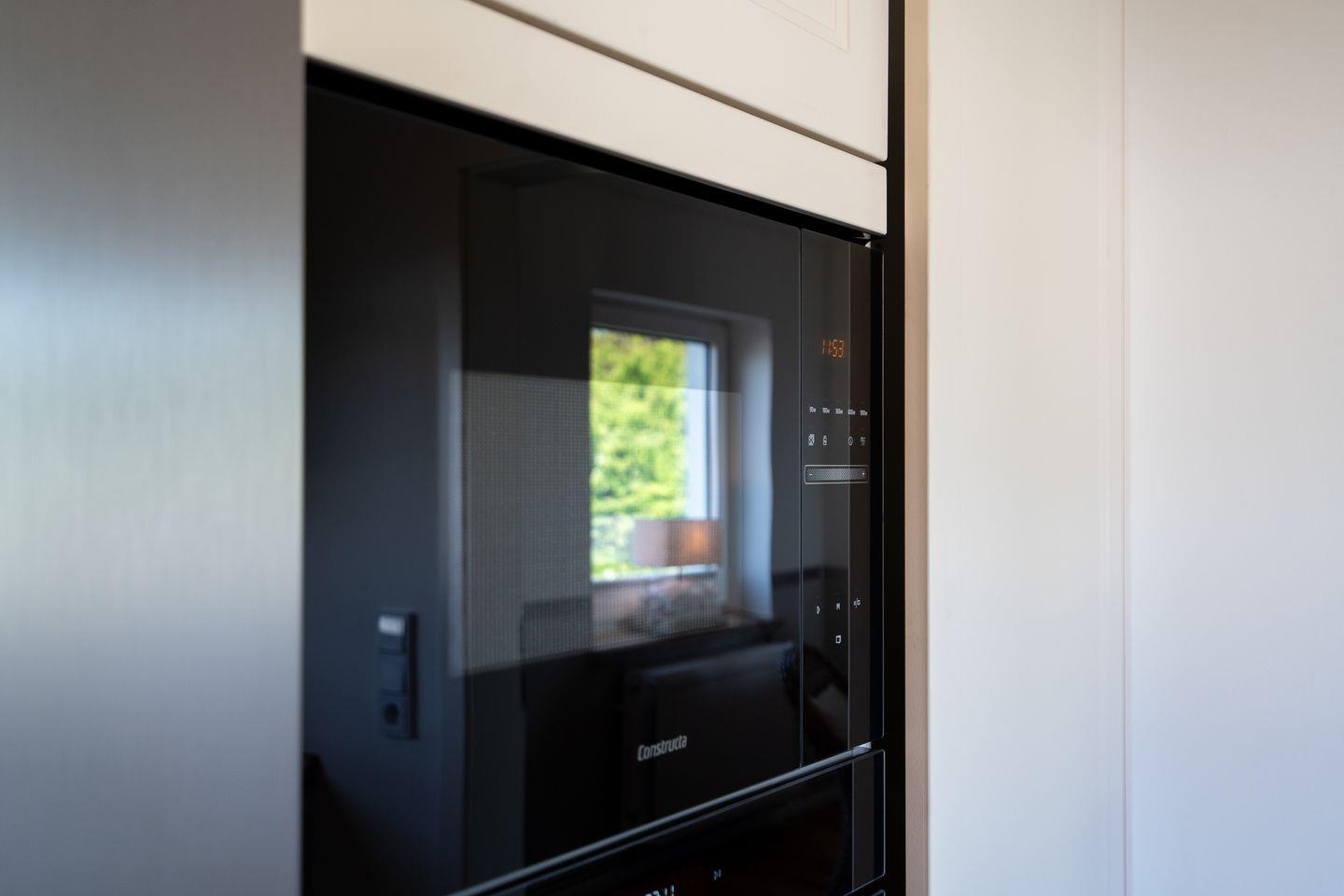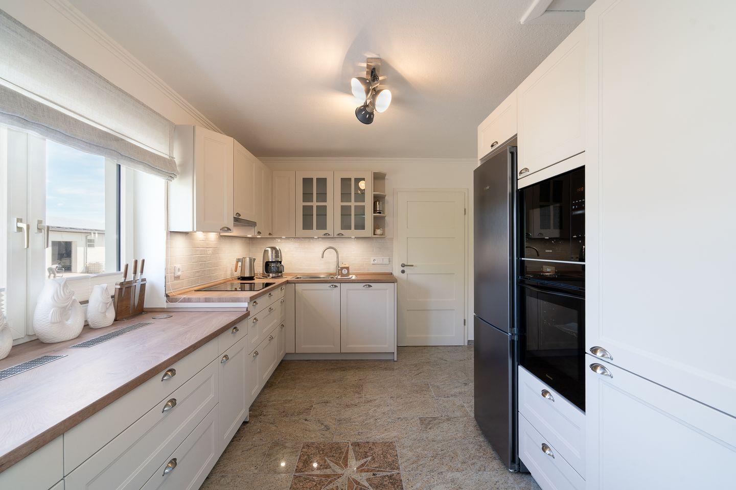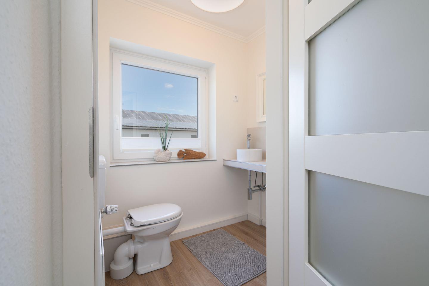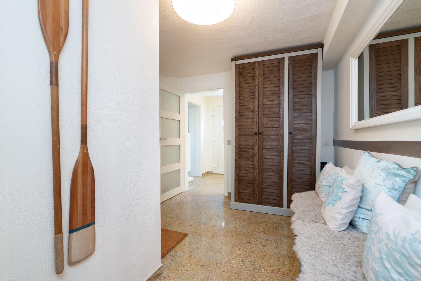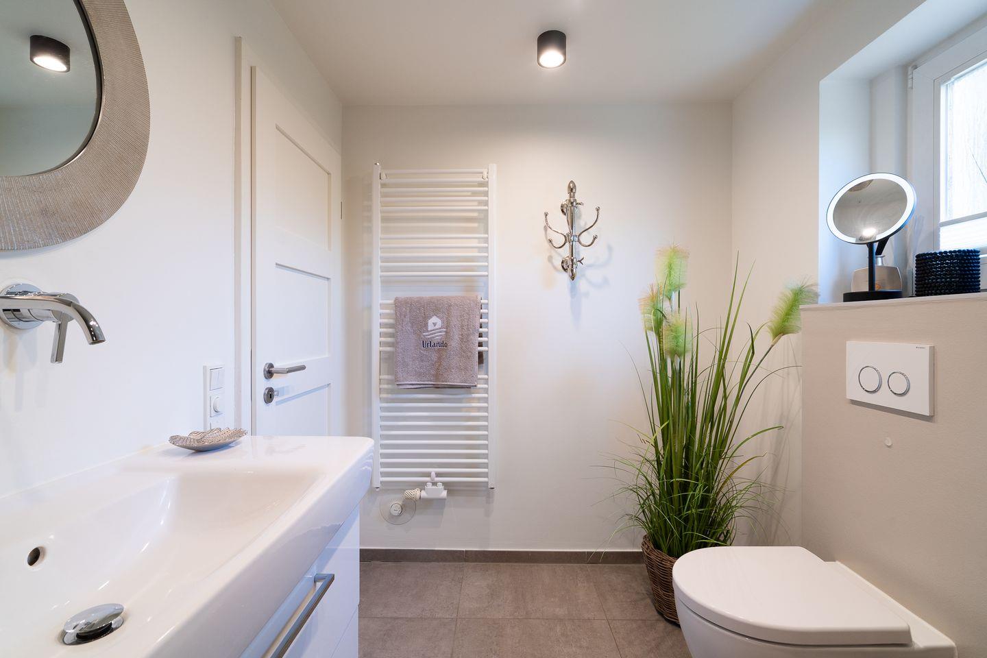 Das Obergeschoss begeistert mit einer stilvollen Chillecke samt Strandkorb sowie einem offenen Wohn- und Essbereich, der durch hochwertige Möbel, eine großzügige Sofaecke, zwei elegante Sessel und einen großen TV überzeugt. Die voll ausgestattete Design-Küche erfüllt höchste Ansprüche und macht das Kochen auch im Urlaub zum Vergnügen. Praktisch: Ein separates Gäste-WC sorgt für zusätzlichen Komfort auf dieser Ebene. Von hier aus gelangen Sie direkt auf die Dachterrasse mit atemberaubendem Meerblick sowie zum Zugang zur Sauna und zum Parkplatz.