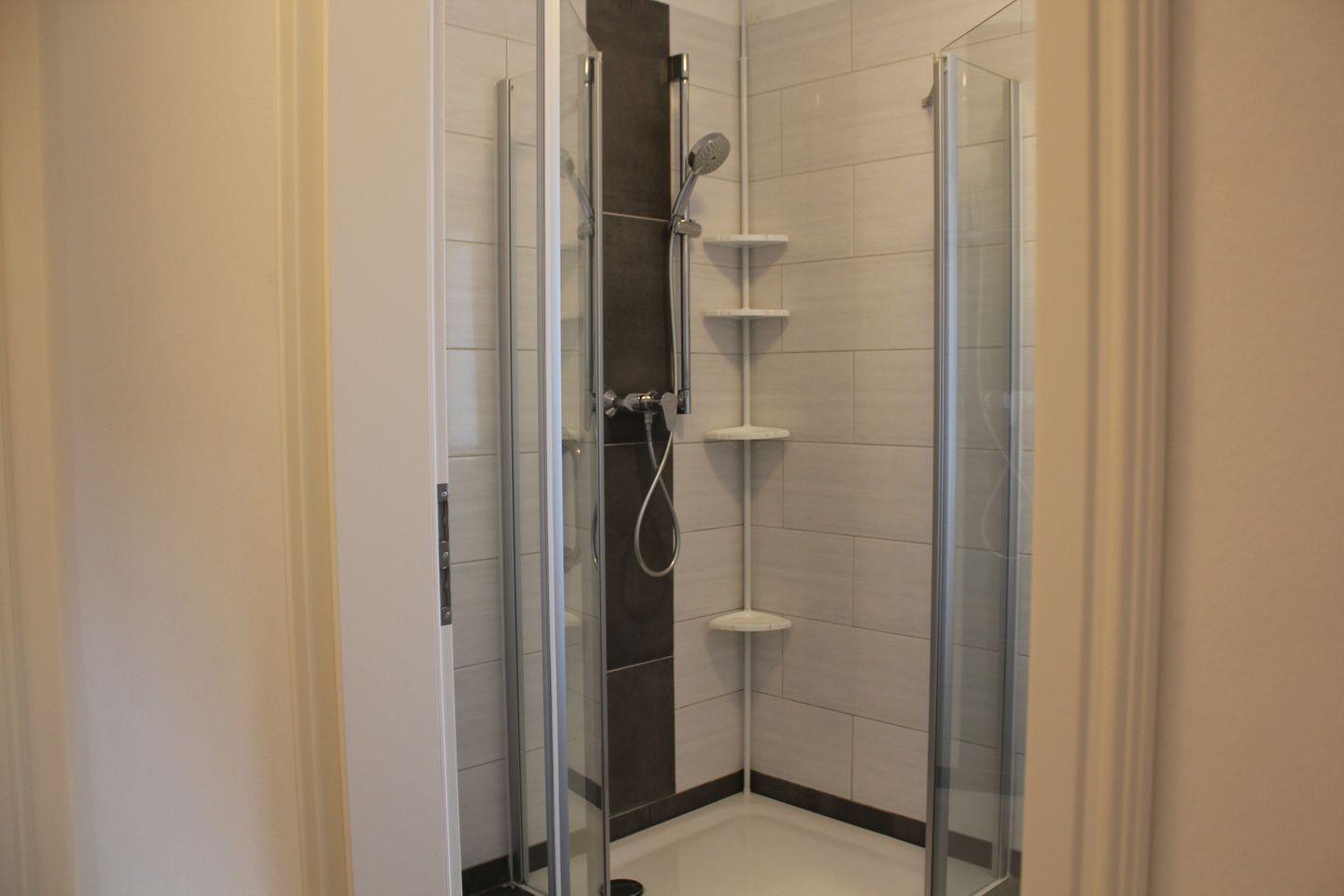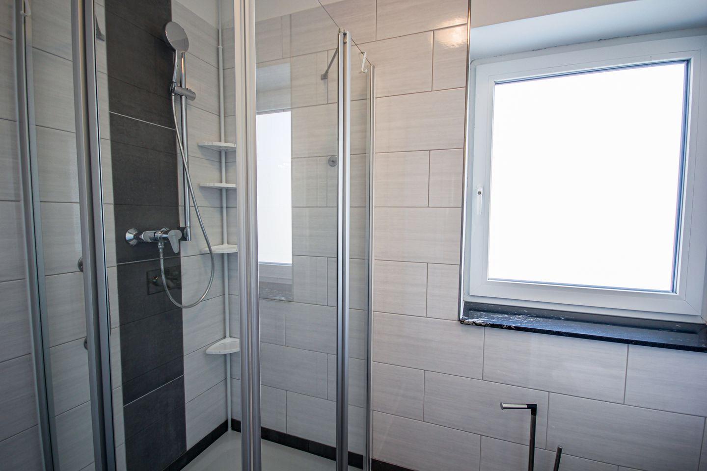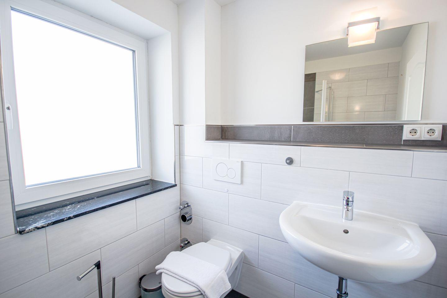 Rechts erwartet Sie das moderne Tageslichtbad mit Fenster, in dem klare Linien auf Komfort treffen: Ein stilvoller Waschtisch, ein WC sowie eine großzügige, ebenerdige Dusche sorgen für einen entspannten Start in den Tag. Hochwertige Armaturen und liebevoll ausgewählte Details schaffen hier eine kleine Wohlfühloase.