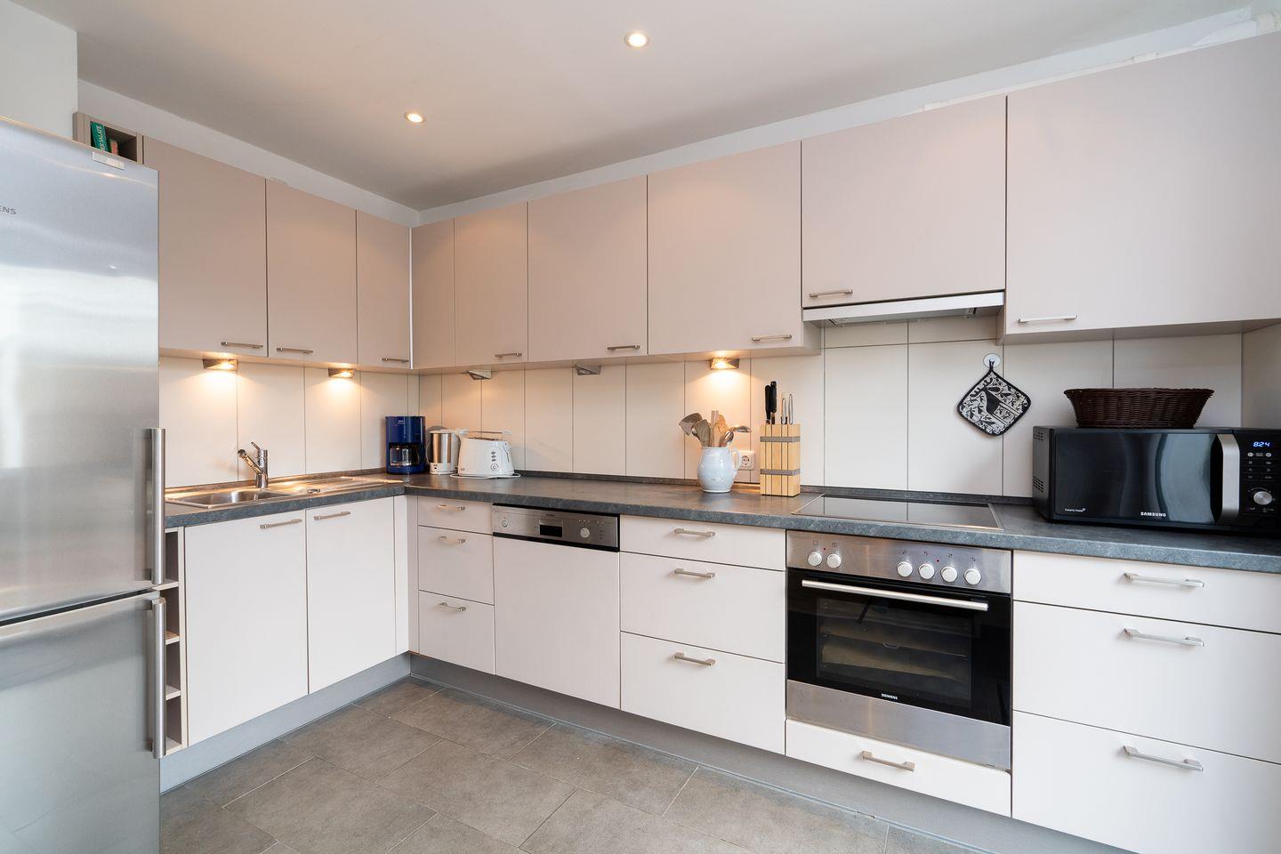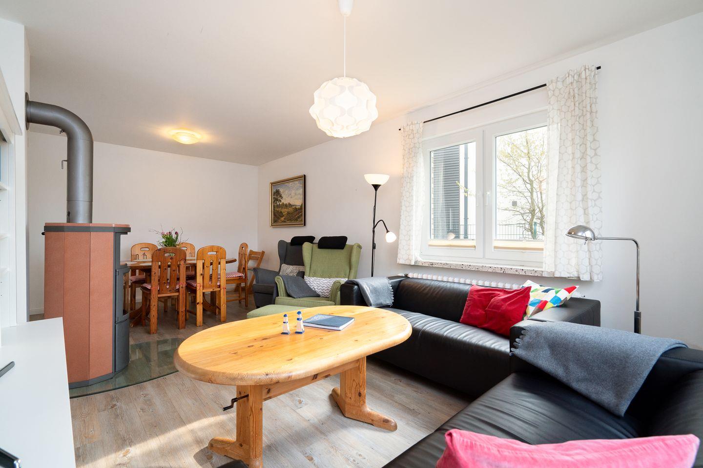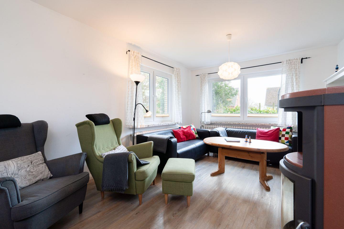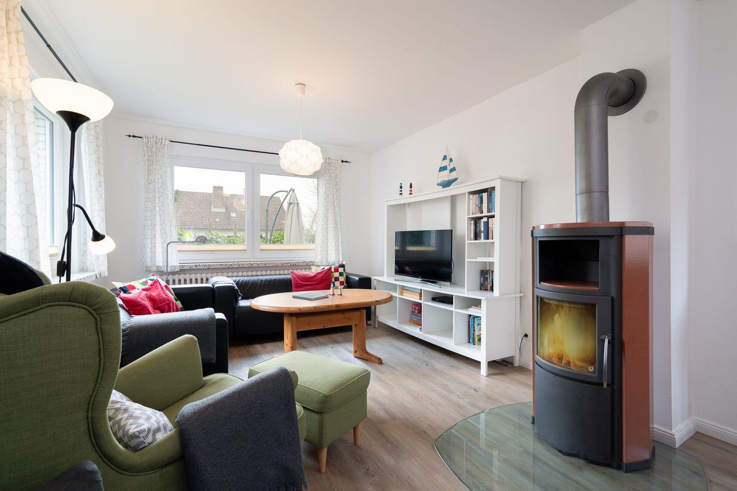 Das Lütthus verfügt über insgesamt vier Zimmer, darunter drei komfortable Schlafzimmer. Der offene Wohnbereich, ausgestattet mit einem gemütlichen Sofa und einem Sessel, lädt nach einem erlebnisreichen Tag zum Entspannen ein. Ein Kaminofen sorgt für eine wohlige Atmosphäre an kühleren Abenden. Der Esstisch im Essbereich ist perfekt für gesellige Abende, bei denen Sie die kulinarischen Köstlichkeiten der Umgebung genießen können. Die offene Küche ist mit allen wesentlichen Geräten ausgestattet, darunter ein Cerankochfeld, ein Backofen und eine Spülmaschine. So lässt sich das Kochen im Urlaub mühelos gestalten.