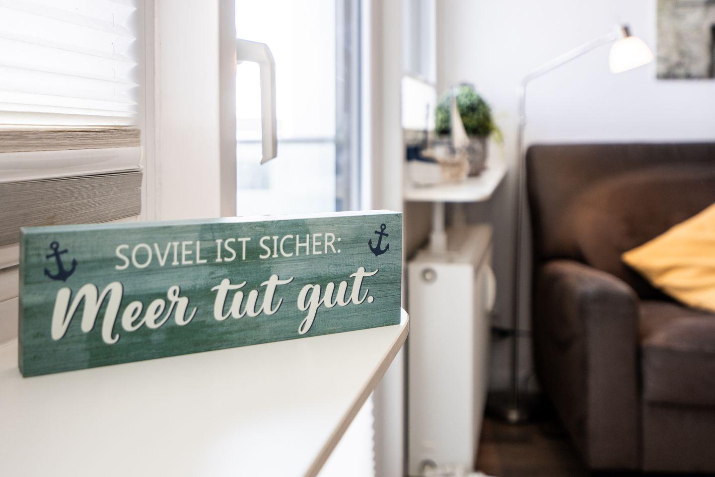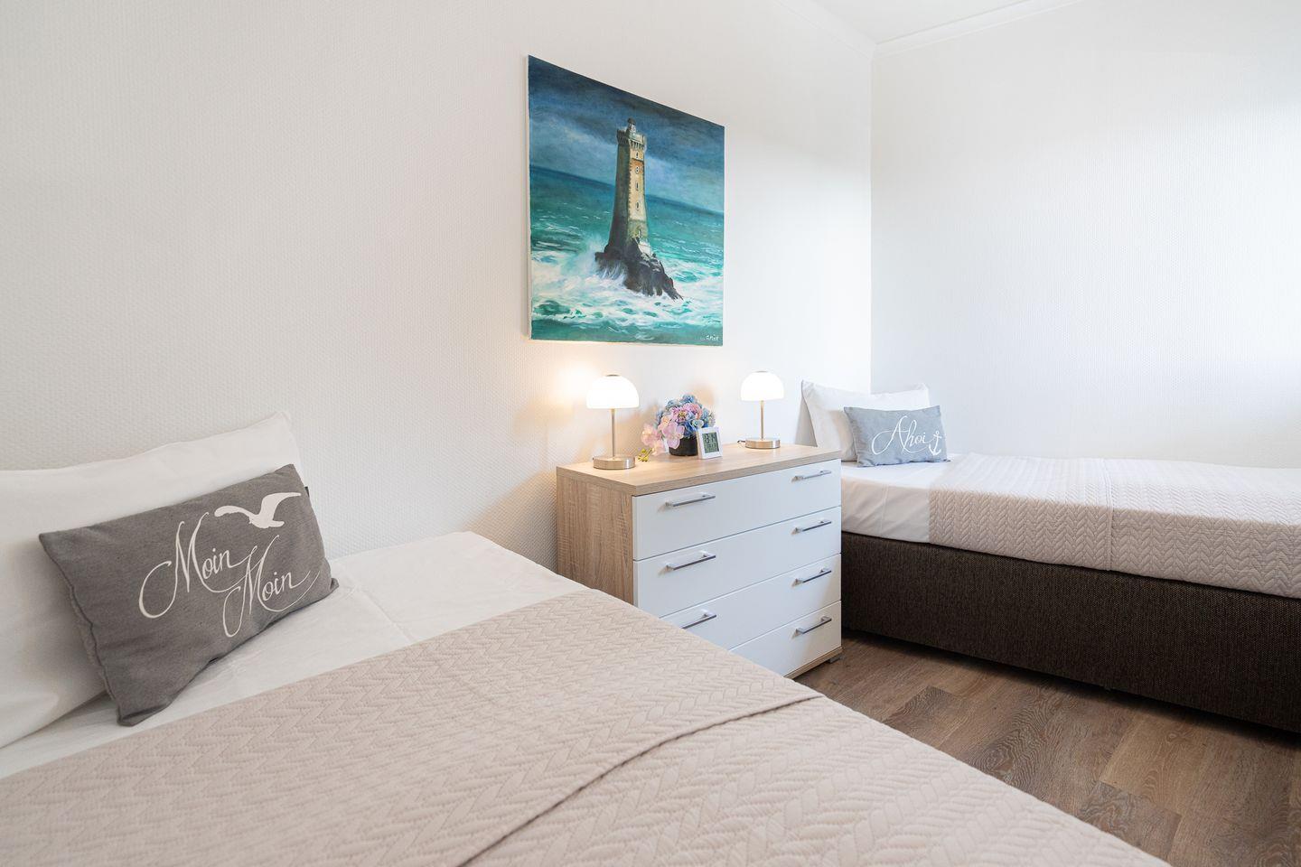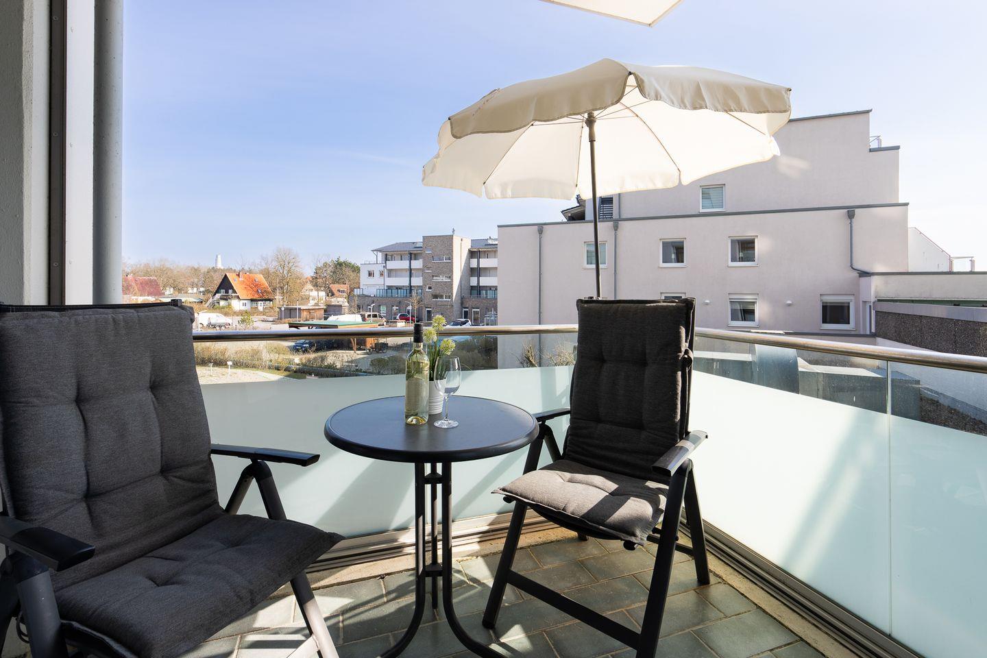 Das separate Schlafzimmer ist mit zwei komfortablen Boxspringbetten (je 90 cm x 200 cm) ausgestattet – ideal für erholsamen Schlaf. Auf dem Balkon mit Tisch und vier Stühlen genießen Sie bei einer Tasse Kaffee den Teilblick auf die Ostsee und lassen die Seele baumeln.