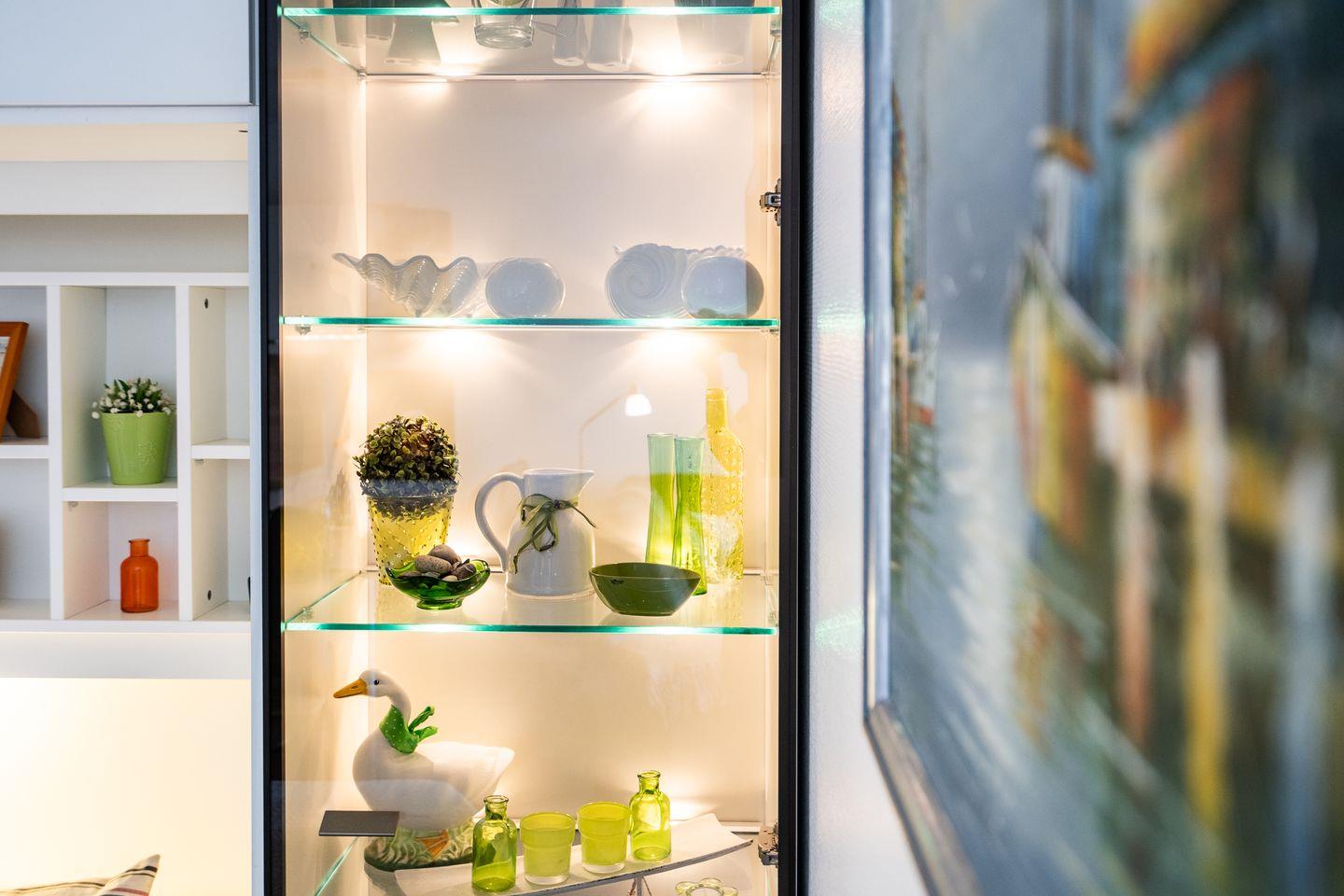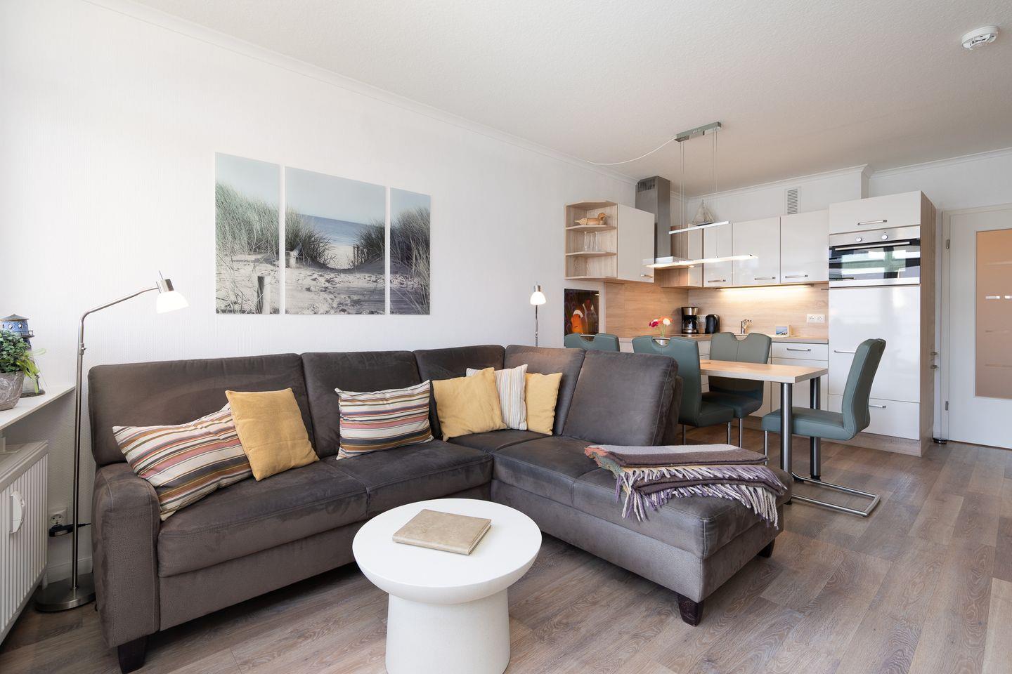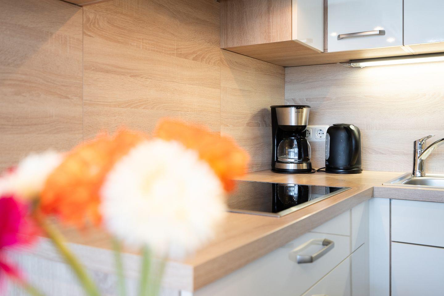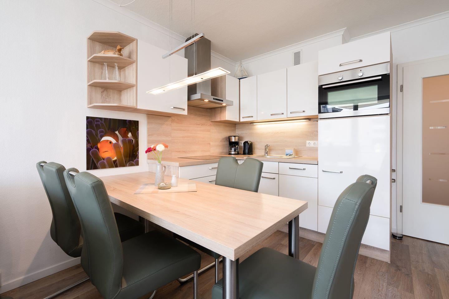 Im Wohnzimmer erwartet Sie eine stilvolle Einbauküche, die keine Wünsche offenlässt: Geschirrspüler, Backofen mit Pizzafunktion, 4-Zonen-Ceranfeld, Kühlschrank mit Gefrierfach, Dunstabzugshaube, Kaffeemaschine, Wasserkocher, Eierkocher, Toaster – und natürlich ausreichend Geschirr, Besteck und Kochutensilien. Der gemütliche Essplatz lädt zu gemeinsamen Mahlzeiten ein.