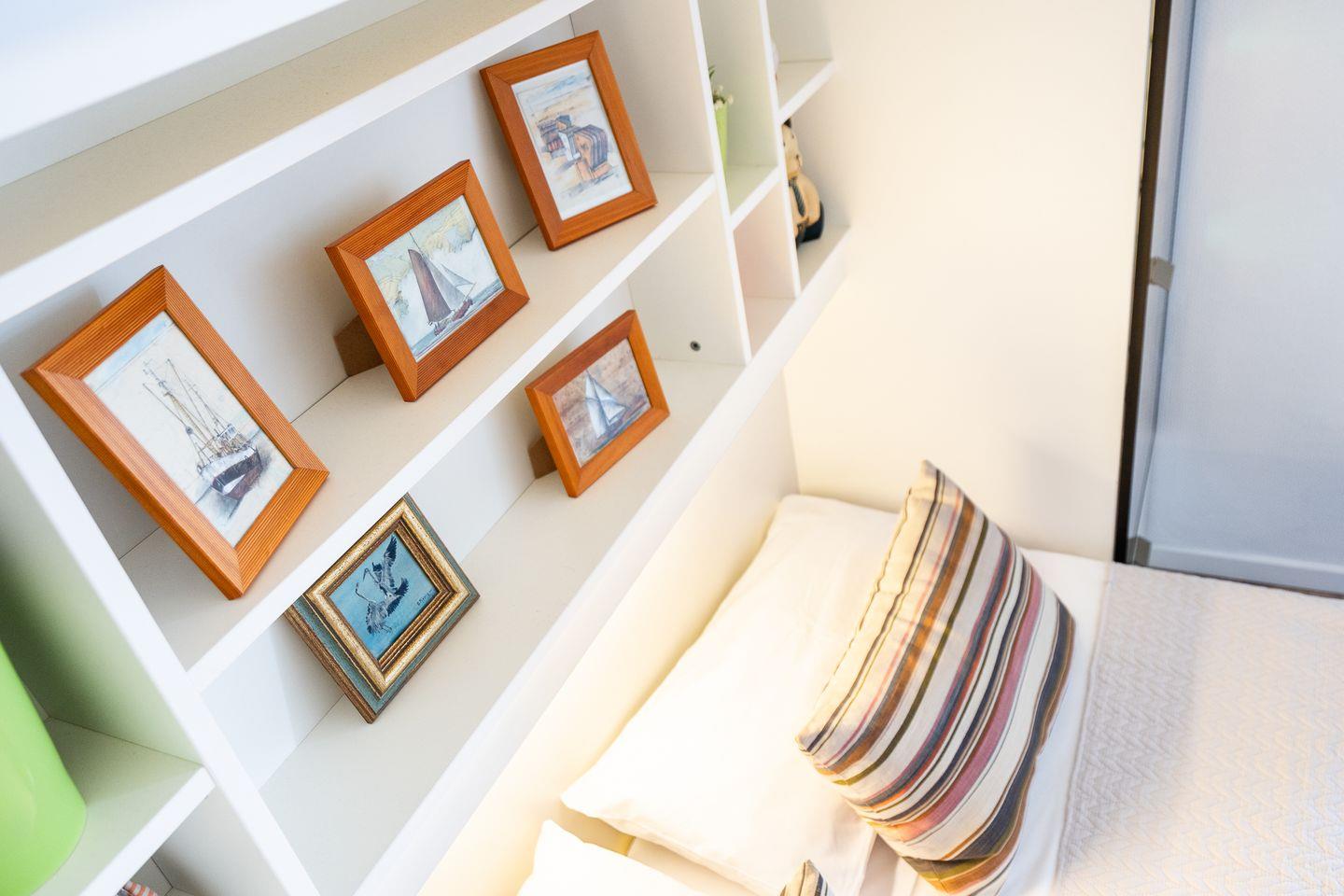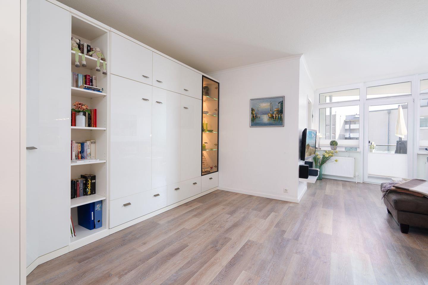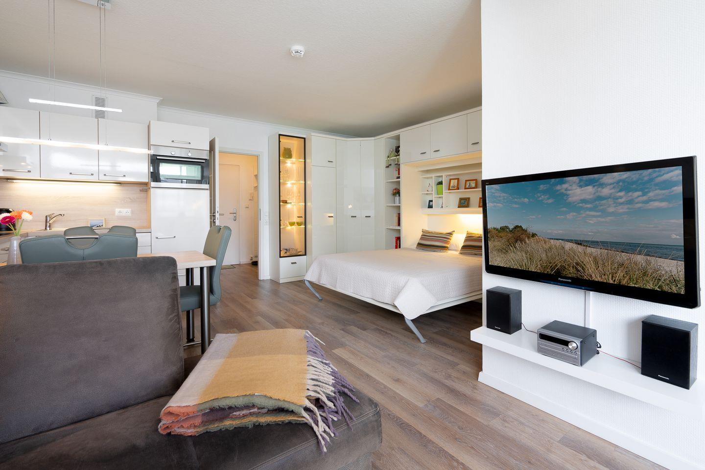 Ein bequemes Sofa bietet Platz zum Entspannen, dazu stehen ein 37-Zoll-Flachbild-TV und eine Stereoanlage mit Blu-ray-Player für gemütliche Abende bereit. In der Wohnwand verbirgt sich ein ausklappbares Doppelbett (160 cm x 200 cm) mit viel Stauraum im angrenzenden Schrank.