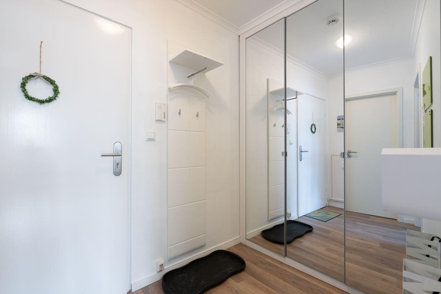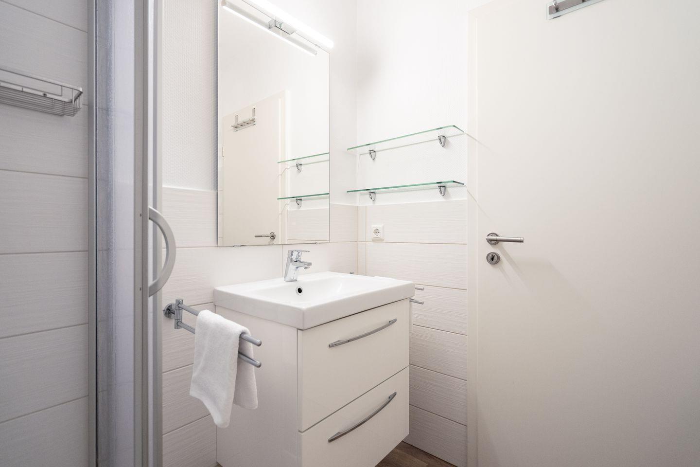 Im modernen Duschbad finden Sie alles, was Sie brauchen: Spiegel, Waschbeckenschrank und Föhn. Im Flur sorgt ein großer Spiegelschrank für ausreichend Stauraum für Kleidung, Schuhe und mehr.