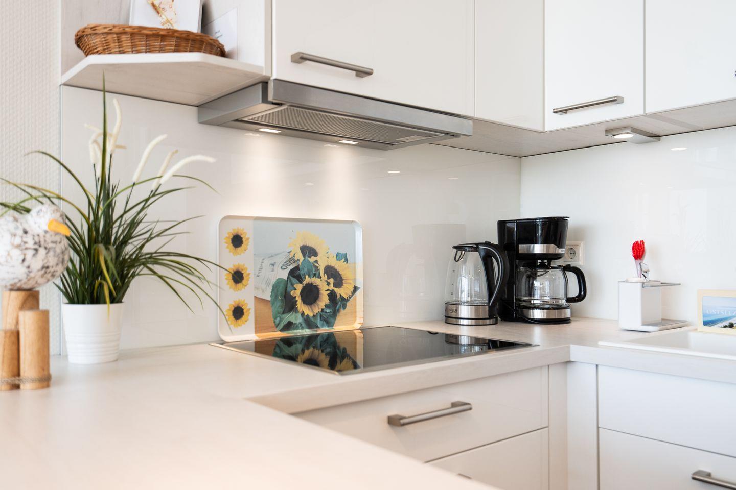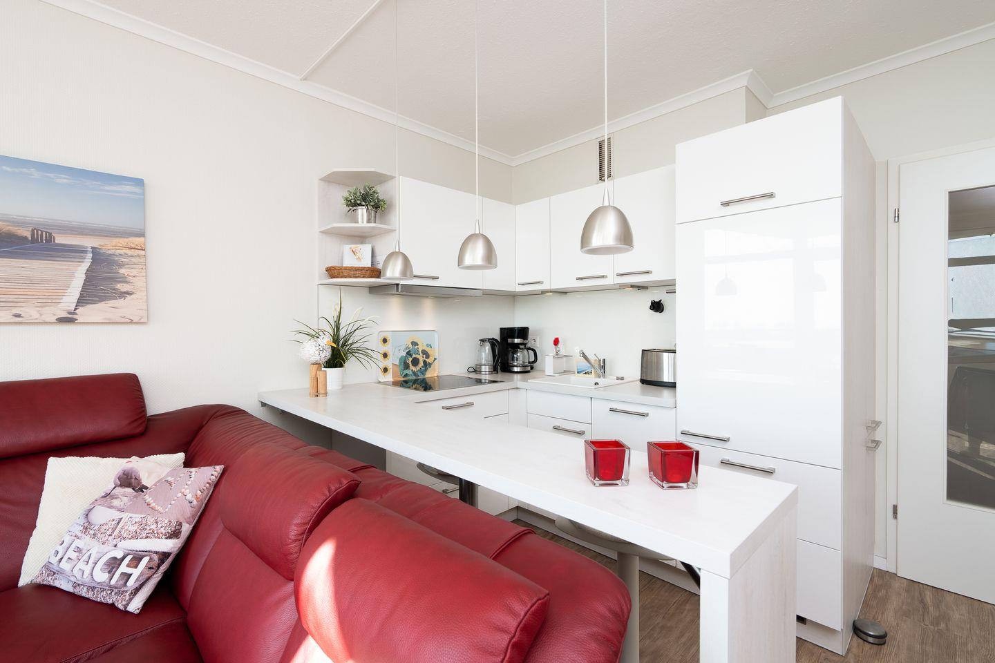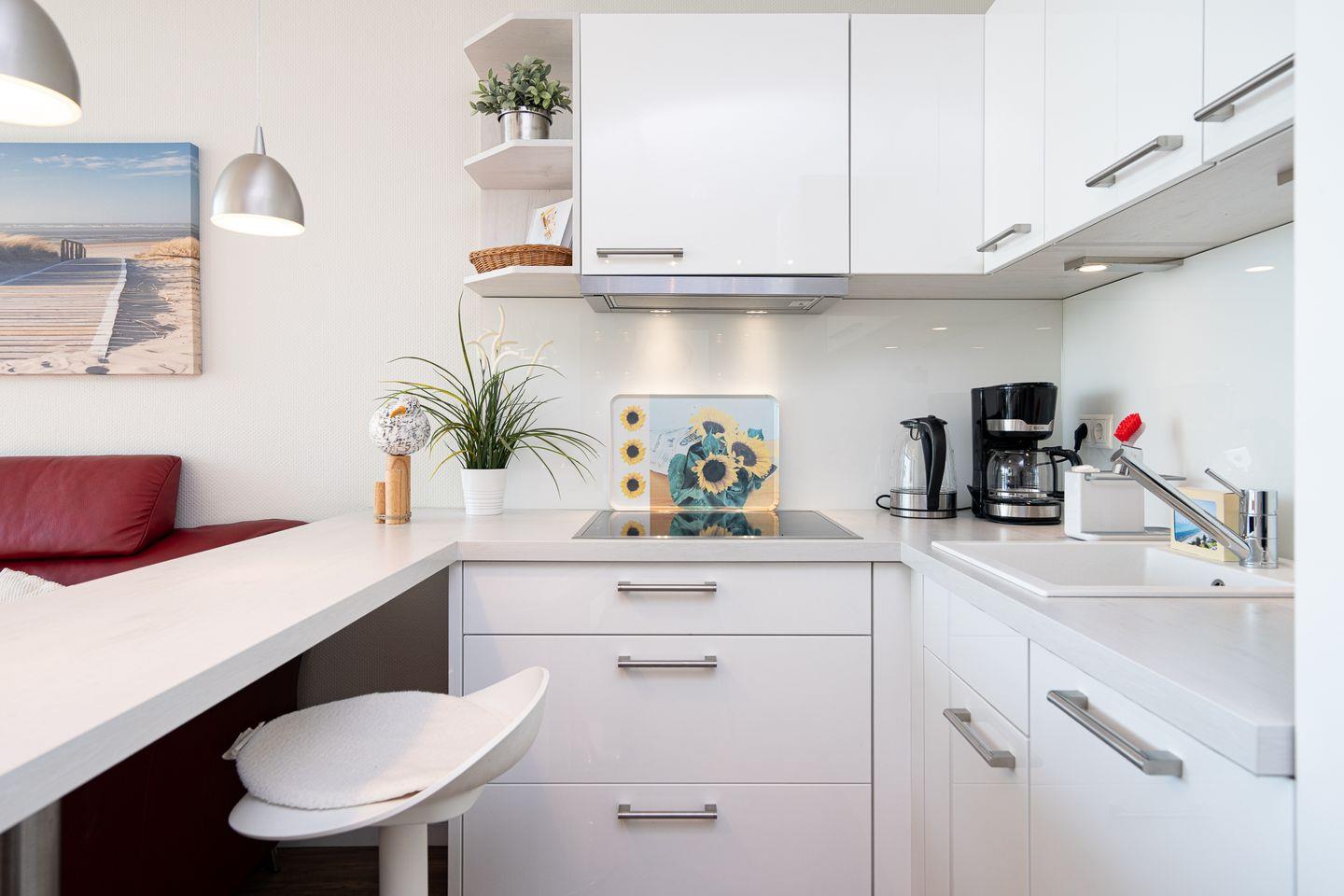 Die offene Küche ist mit allem ausgestattet, was man braucht: Spülmaschine, Ceranfeld, Kühlschrank sowie eine Mikrowelle mit Backfunktion und ein kleiner Gefrierschrank (beide in der praktischen Kammer neben dem Flur). Ein Esstresen mit Meerblick lädt zum Frühstücken ein – und am Abend genießen Sie Ihr Dinner stimmungsvoll am Esstisch mit Kerzenschein.